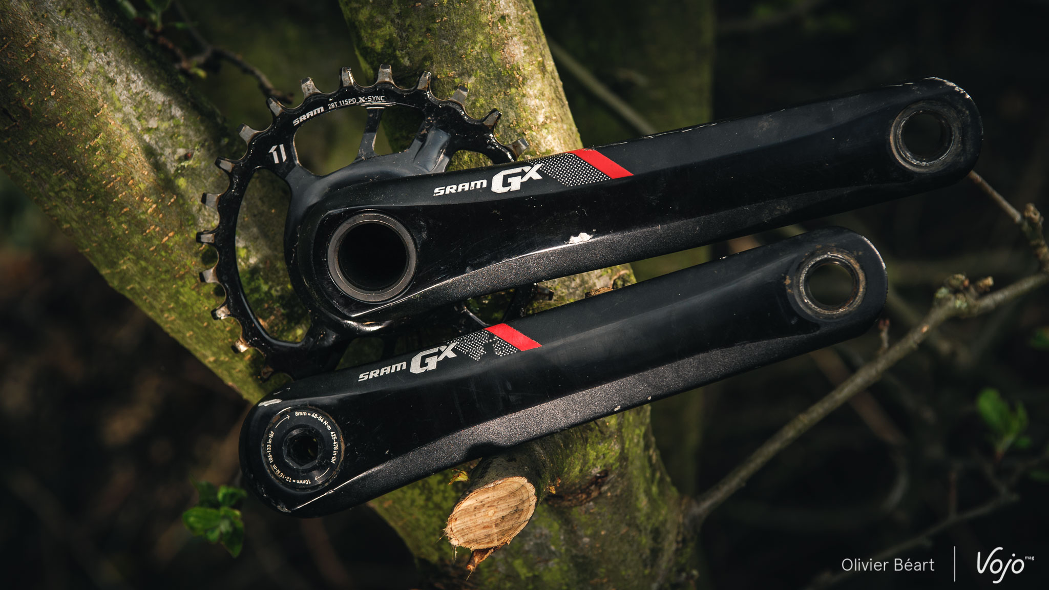 Du côté des manivelles, elles sont identiques à celles présentes sur le groupe X1 que nous avions testé l’an dernier. Il existe également une deuxième version plus bas de gamme reconnaissable à l’évidement présent à proximité de l’axe. Dans le cas qui nous occupe, les conclusions sont les mêmes que pour le X1 : la finition est très bonne et la solidité parfaite, mais Sram n’a pas encore inventé la finition inusable. Les manivelles gardent malgré tout une très belle tenue et un aspect visuel valorisant avec une petite touche de rouge toujours aussi fringante et agréable à regarder en fin de test.