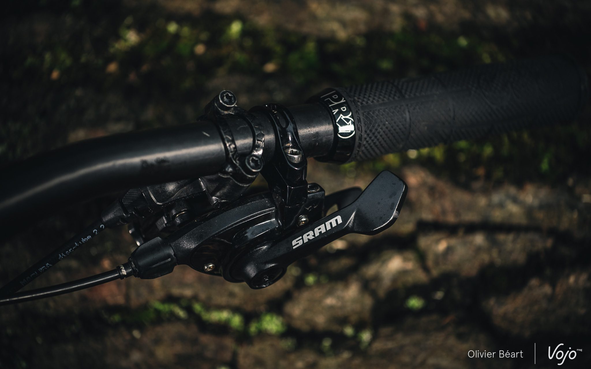 S’il y a un composant de ce groupe au niveau duquel la descente en gamme est directement palpable, c’est la commande de vitesses. Rien de dramatique, rassurez-vous, et on reste sur du très bon matériel. Même si l’esthétique et la construction restent très proches des modèles supérieurs, le feeling n’est pas tout à fait aussi vif et précis sur le shifter Sram GX. La course morte du levier de montée des rapports semble un poil plus longue et les crans moins marqués. C’est minime, mais c’est perceptible.