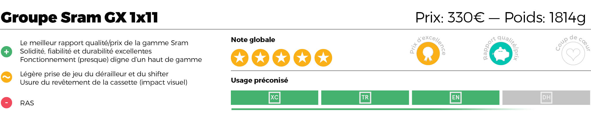 Il s’est fait attendre et Sram a mis longtemps avant de décliner le 1×11 dans une version réellement abordable. Mais la marque ne s’est pas loupée et le groupe tient toutes ses promesses. Visuellement, rien ne trahit le fait qu’il s’agit d’un groupe d’entrée de gamme et il ne fait pas tache sur un magnifique cadre en carbone comme le Devinci Django, doté d’autres composants bien plus luxueux. Si quelques éléments comme le dérailleur arrière et les shifters laissent apparaître un peu de jeu quand on les inspecte très attentivement après plus d’un an d’utilisation, le fonctionnement ne décevra pas les bikers les plus exigeants et la durabilité des pièces d’usure est franchement épatante, avec une mention spéciale pour la cassette et le plateau en acier (optionnel, mais à choisir sans hésiter au premier remplacement du modèle alu d’origine). Vu son prix, on peut dire que le Sram GX fait un sans-faute et que les Shimano SLX et XT ont trouvé un concurrent de taille que ce soit pour un usage XC, rando ou même enduro bien engagé. Maintenant, même si on sait que ce ne sera pas facile vu les défis techniques que pose le 12 vitesses, on attend avec impatience un Sram GX Eagle !
