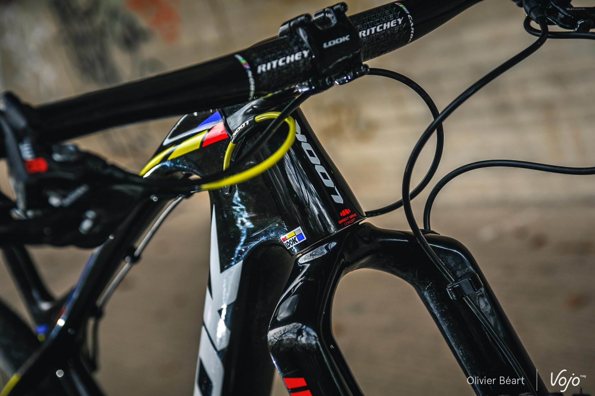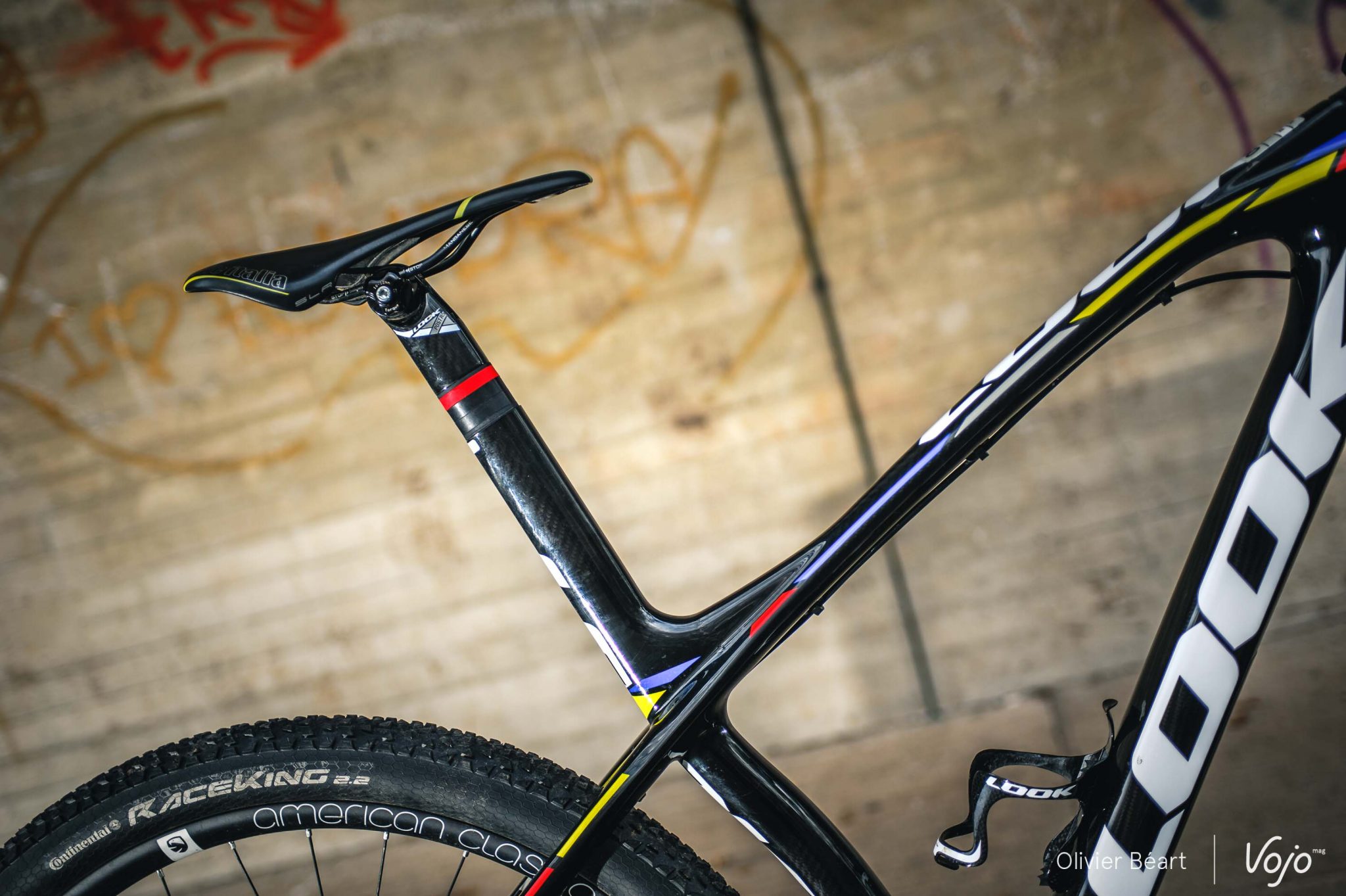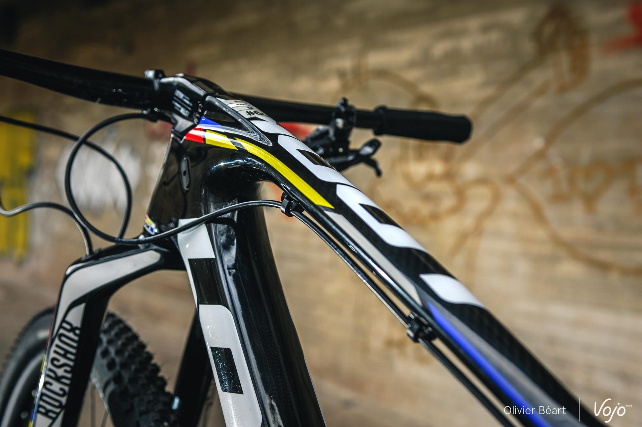 Pour poursuivre sur le chapitre esthétique, qu’on aime ou pas, la déco « Mondrian » ne peut pas non plus laisser indifférent. Faisant référence aux racines de la marque et au célèbre peintre, elle magnifie les lignes du Look 989. Ajoutez une finition superbe et une peinture profonde ainsi qu’une déco personnalisée sur la fourche RockShox RS-1 et vous obtenez, selon nous, une réussite totale.