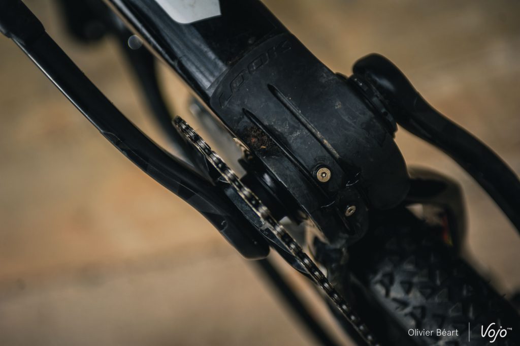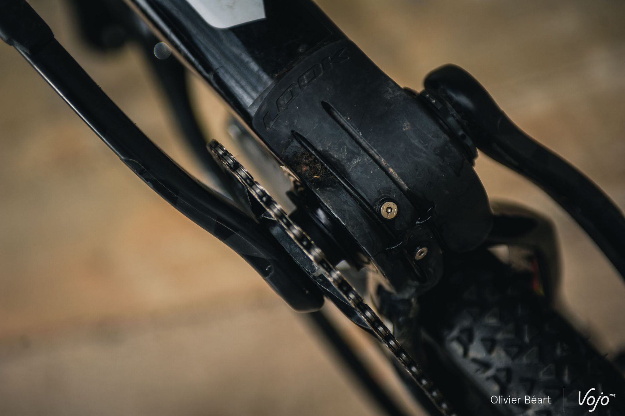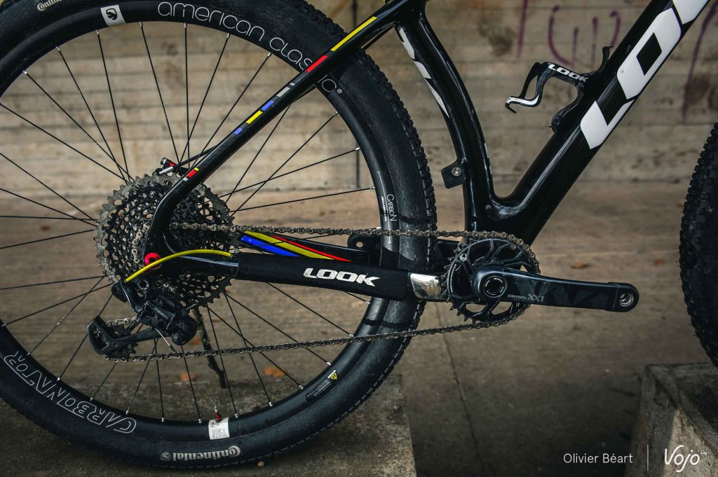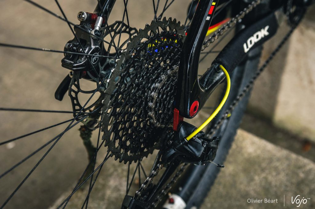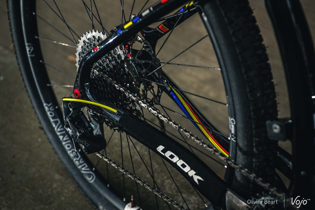 La nouveauté la plus visible c’est évidemment le fameux groupe Sram XX1 Eagle en 12 vitesses, que nous avons récemment testé. Il nous a d’ailleurs semblé ici particulièrement précis et bien réglé, et la rigidité de la patte ainsi que son bon alignement d’origine n’y sont sans doute pas étrangers. Côté freinage, Look fait confiance aux très puissants Magura MT8.