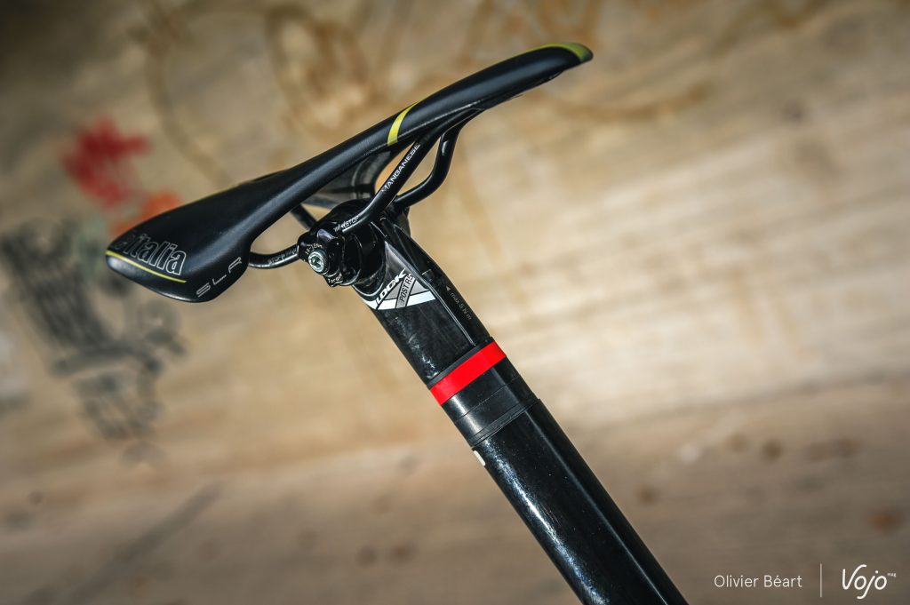 L’intégration fait partie… intégrante de ce cadre. La tige de selle e-post n’est pas là que pour l’esthétique. Le poids n’est pas spécialement gagnant, puisqu’on parle de 1300g en taille M pour le cadre. Certes, la tige intégrée est comprise dans cette mesure, mais le « stubby » qui supporte les rails n’est pas particulièrement léger (entre 195 et 216g selon les versions), on n’y gagne donc pas vraiment.