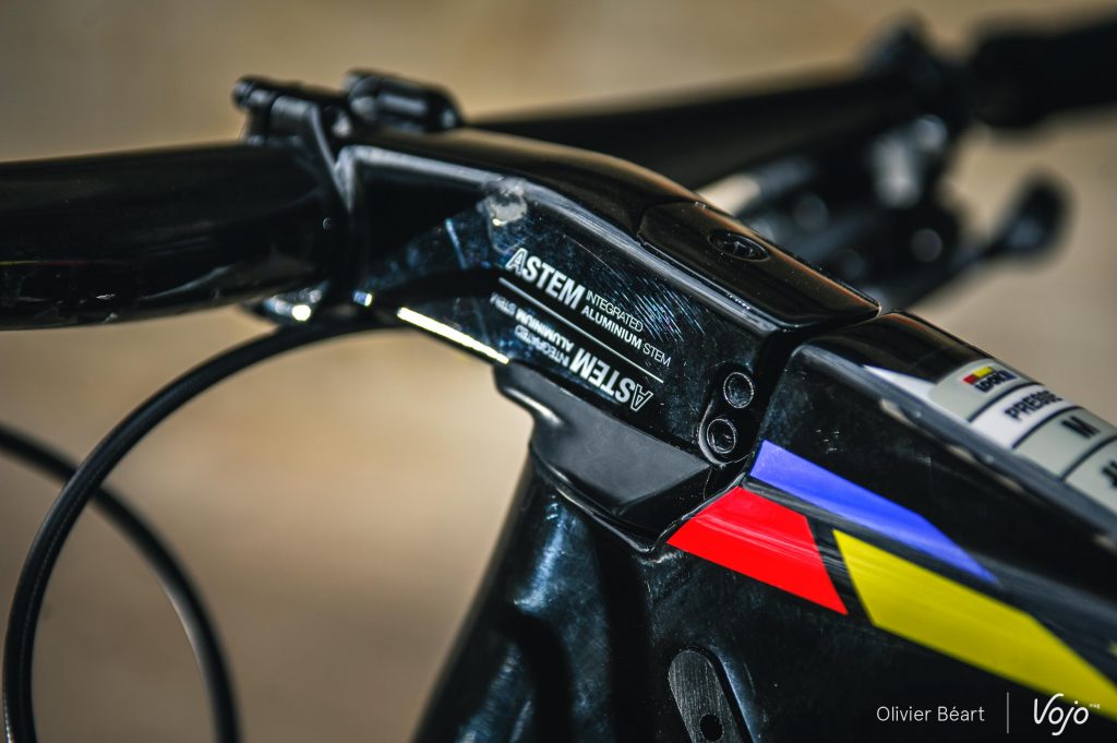 Autre composant que Look a cherché à intégrer sur ses VTT : la potence. Outre l’esthétique, le but est ici clairement d’avoir la plus grande rigidité possible tant au niveau de la douille que de la potence elle-même. Même si son aspect pourrait laisser penser qu’elle est en carbone, la potence A-Stem est en aluminium forgé. Elle existe en deux inclinaisons (+/- 5 et 15°) et dans des longueurs allant de 80 à 120mm. A l’heure où les cadres s’allongent et où les potences se raccourcissent, voilà un élément qui trahit l’âge de la conception de ce vélo…