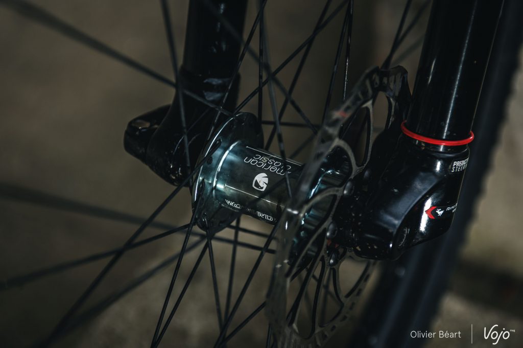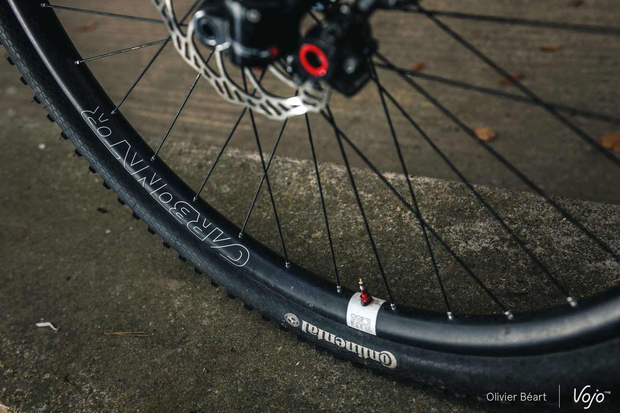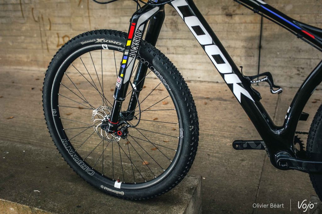 Enfin, la fourche est la toujours très impressionnante RockShox RS-1 dont la qualité d’amortissement est très appréciable malgré quelques points perfectibles comme nous l’avions détaillé dans notre dossier fourches XC. Elle est couplée ici à des roues American Classic Carbonator avec axe avant compatible avec la fameuse fourche inversée. Nous en reparlerons mais nous avons particulièrement apprécié leur comportement dynamique et leurs jantes carbone assez larges (26mm). Par contre, le mariage avec les pneus Continental Race Sport aux flancs très fins ne nous a pas semblé optimal car nous avons ressenti du flottement sur les gros appuis. Le choix d’un Race King roulant à l’arrière et d’un X-King plus polyvalent et cramponné devant est par contre appréciable.