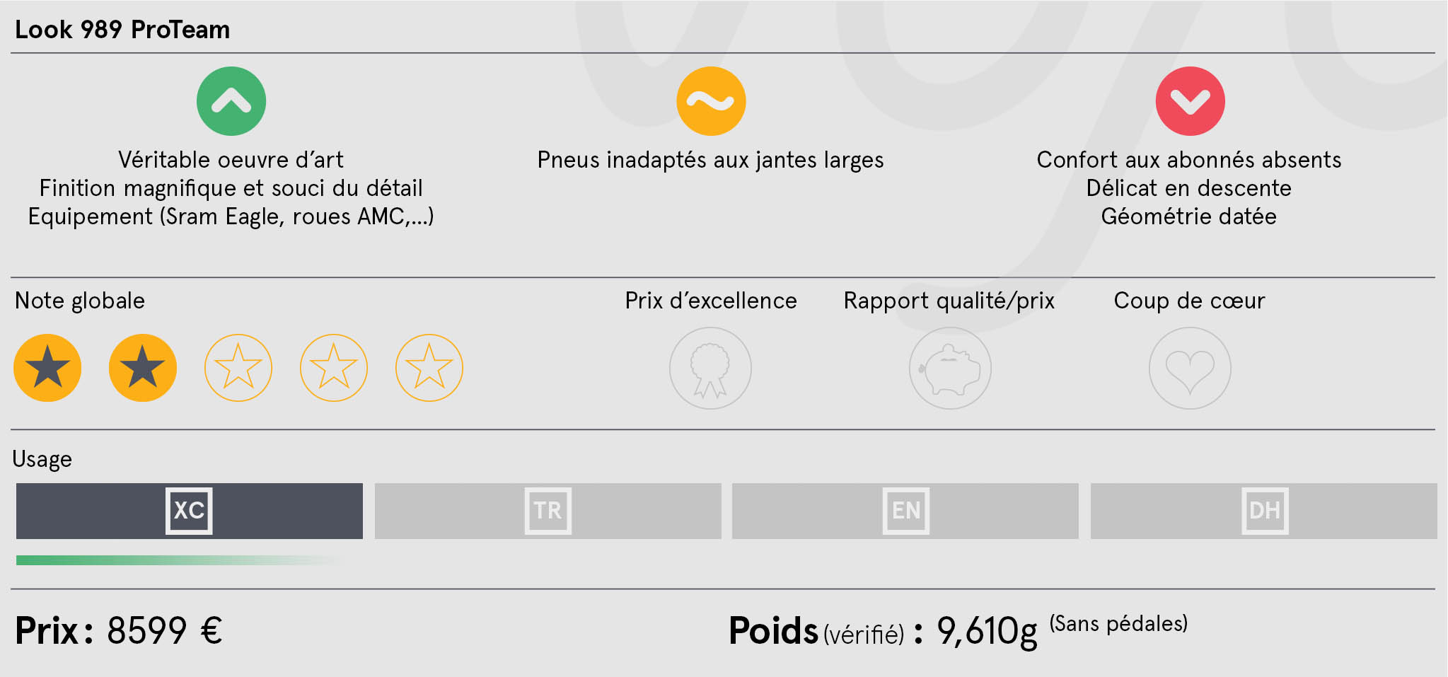 Vous l’aurez compris à la lecture de ce qui précède, nous n’avons pas vraiment été convaincus par le Look 989. C’est très dommage car son esthétique époustouflante et sa qualité de finition magique nous avaient embarqués au premier coup d’oeil, et nous aurions beaucoup aimé filer le parfait amour avec lui sur les sentiers. Nous aurions même pu lui pardonner son tarif indécent. Hélas, notre relation s’est très vite compliquée. Trop inconfortable à nos yeux pour les longues distances, il n’est pas non plus assez à l’aise dans le technique pour briller en cross court. Bref, une remise à plat complète s’impose et nous espérons que la marque nivernaise, qui reste au top sur la route, réinvestira rapidement dans le développement d’une nouvelle plateforme innovante et actualisée capable de lui rendre la place qui fut la sienne du temps du 986.