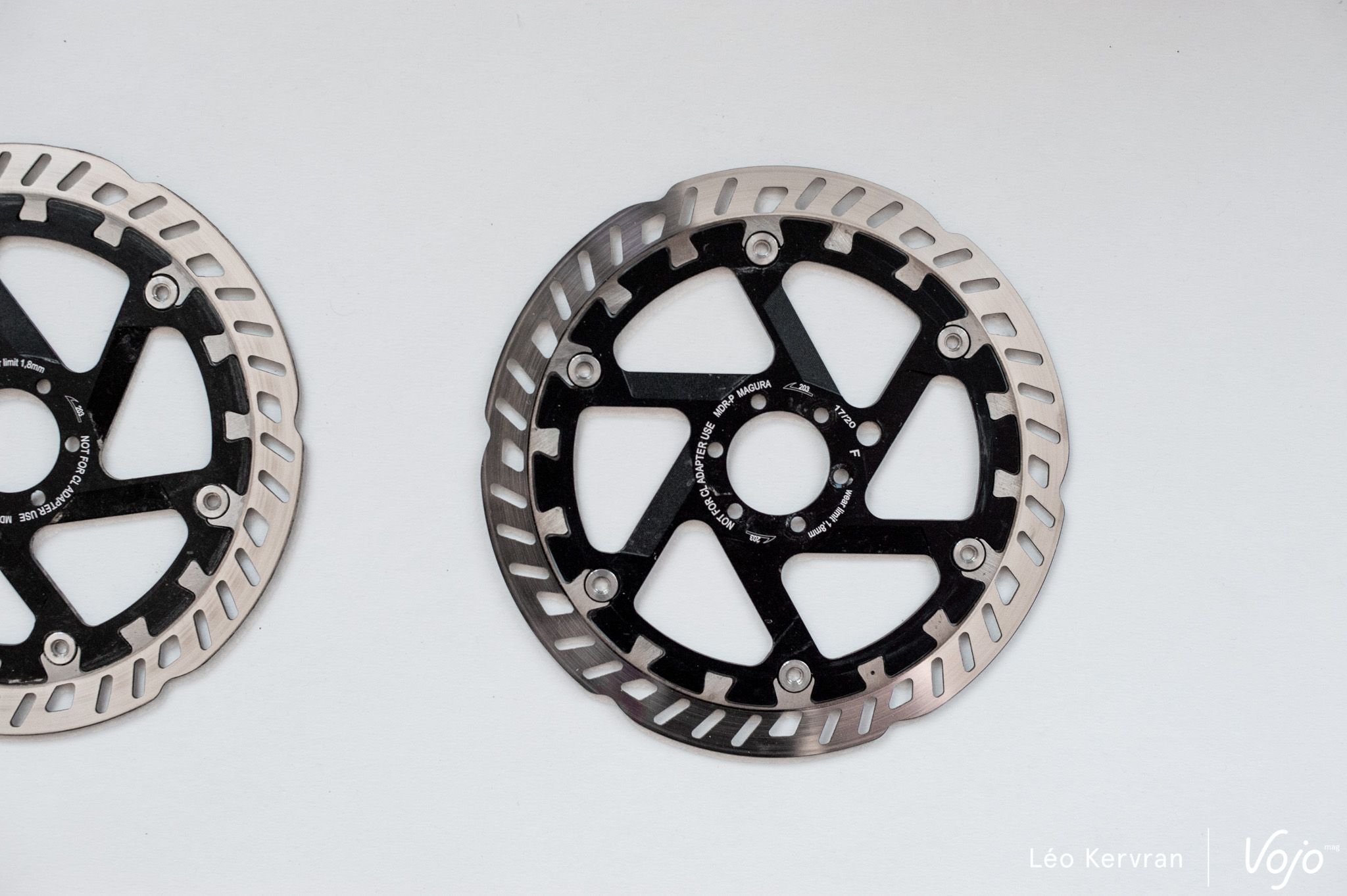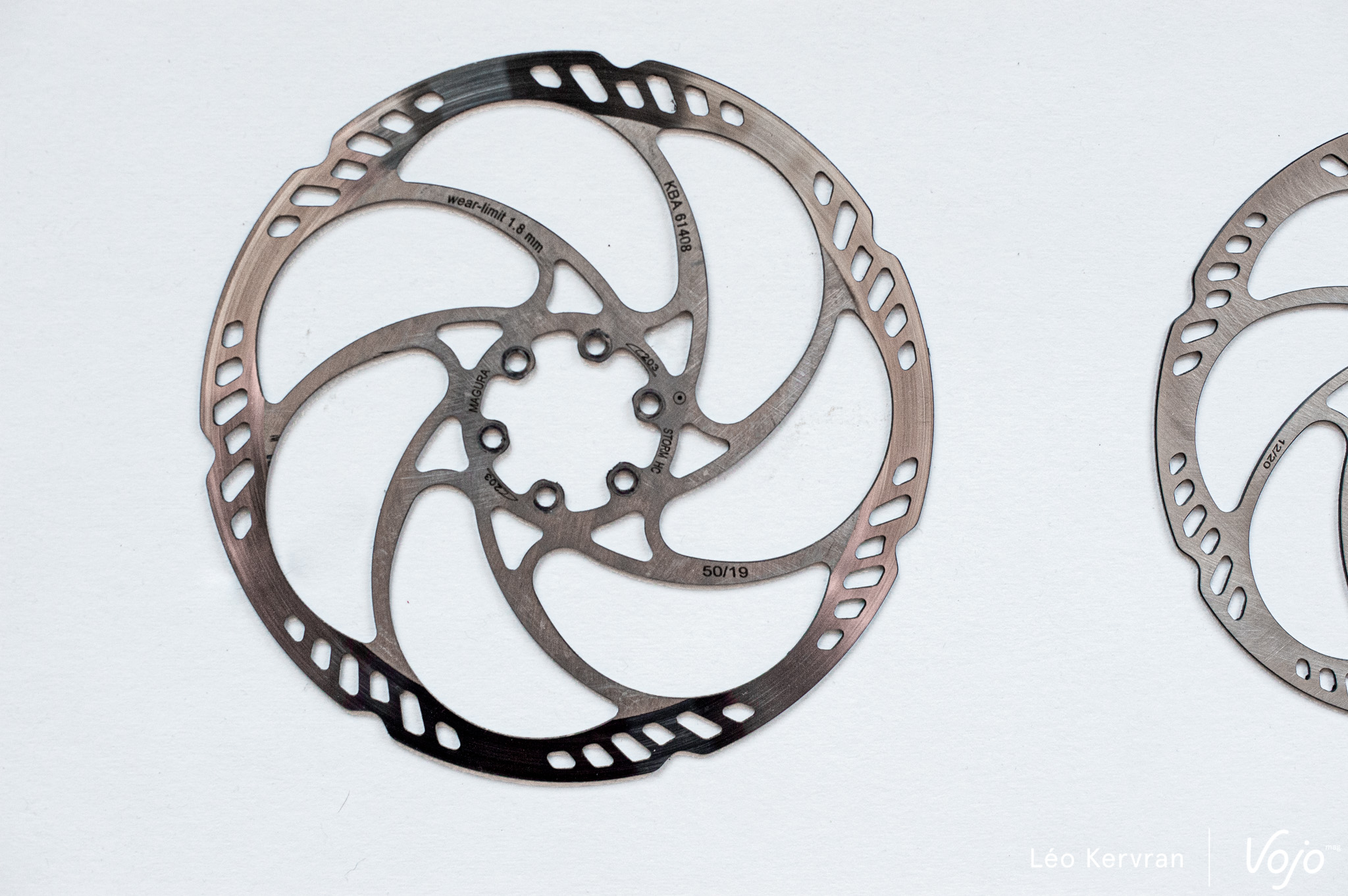 Un grand disque chauffera aussi moins vite. Puisqu’elle est plus loin de l’axe de roue, la piste tourne plus vite donc le freinage crée d’abord plus de chaleur mais comme la piste est plus longue, le refroidissement est bien meilleur que sur un petit disque. De plus, avec une puissance de freinage plus importante, on peut logiquement supposer que le freinage durera moins longtemps. Ce ne sont cependant pas les deux seules caractéristiques des disques qui peuvent influencer le freinage et comme nous l’avons vu durant ce test, l’épaisseur de la piste de freinage et la rigidité de l’ensemble doivent également être pris en compte.