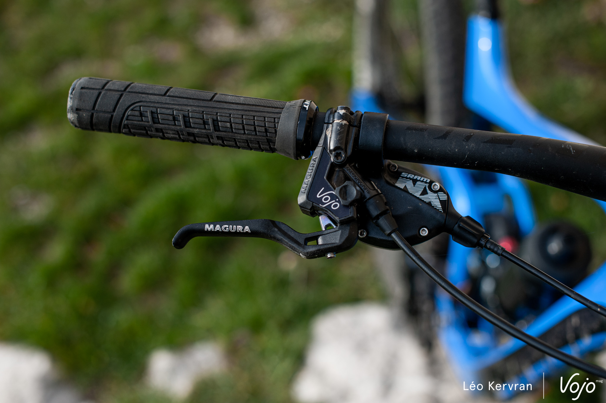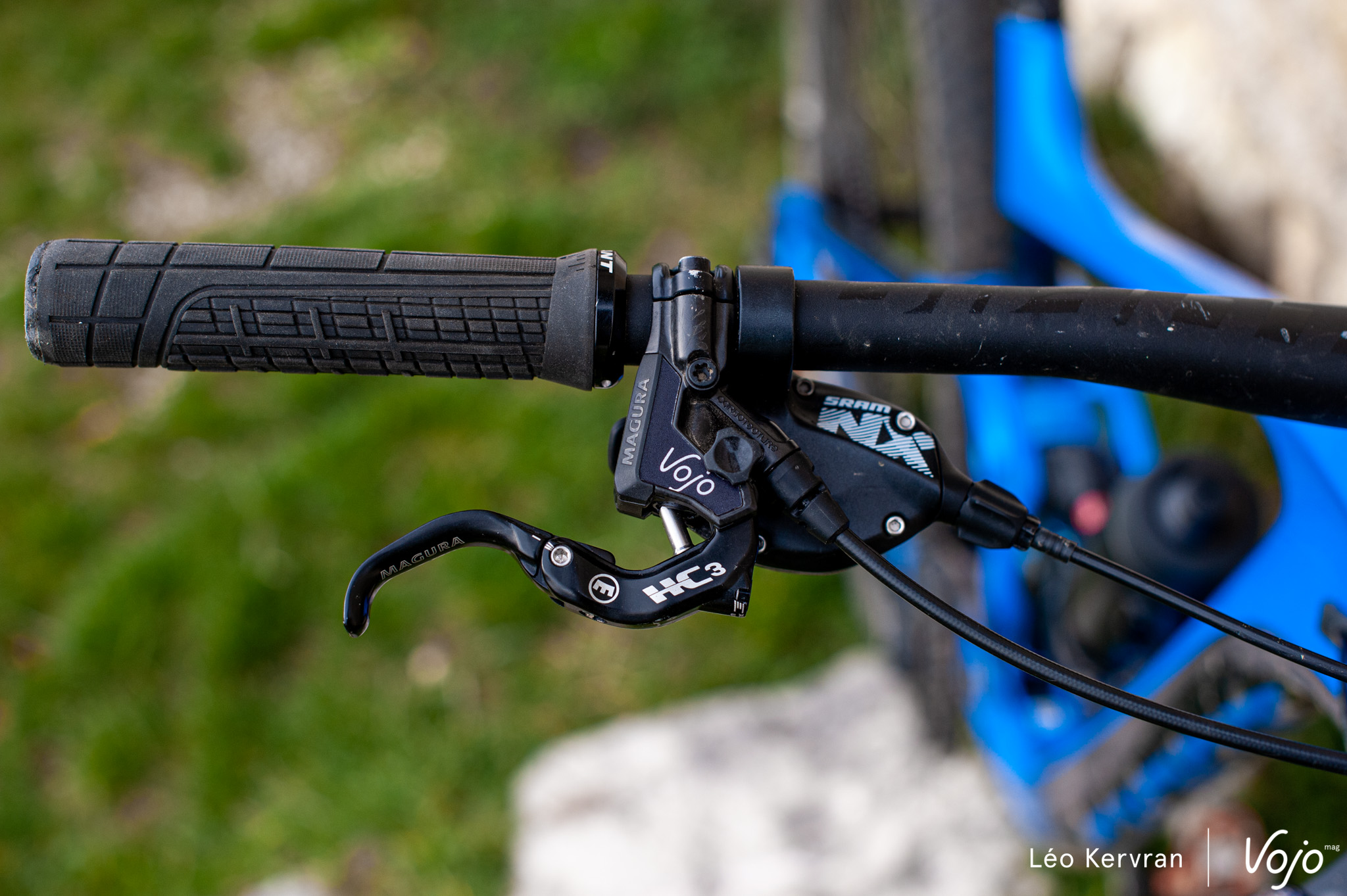 Ici, l’idée est d’avoir un point de contact (non réglable, comme sur les HC) plus franc et plus tôt dans la course que sur les leviers HC, pour avoir la puissance immédiatement disponible lorsqu’on prend les freins. L’ergonomie est également complètement différente, avec un levier plus plat et bien plus long. Comme nous l’expliquait Jack Roure, le mécano de Loïc Bruni, « on essaye de le faire rouler plein fer, les mains sur le guidon alors quand il attrape le levier, il faut qu’il soit vraiment à son doigt ». Avec les HC3, ce sont justement les leviers qui nous ont paru les plus faciles à attraper quand on roule les 5 doigts autours du cintre lorsqu’il n’y a pas besoin de freiner. On note également que leur forme, la moins recourbée de tous les leviers Magura, les rend particulièrement adaptés aux grandes mains.