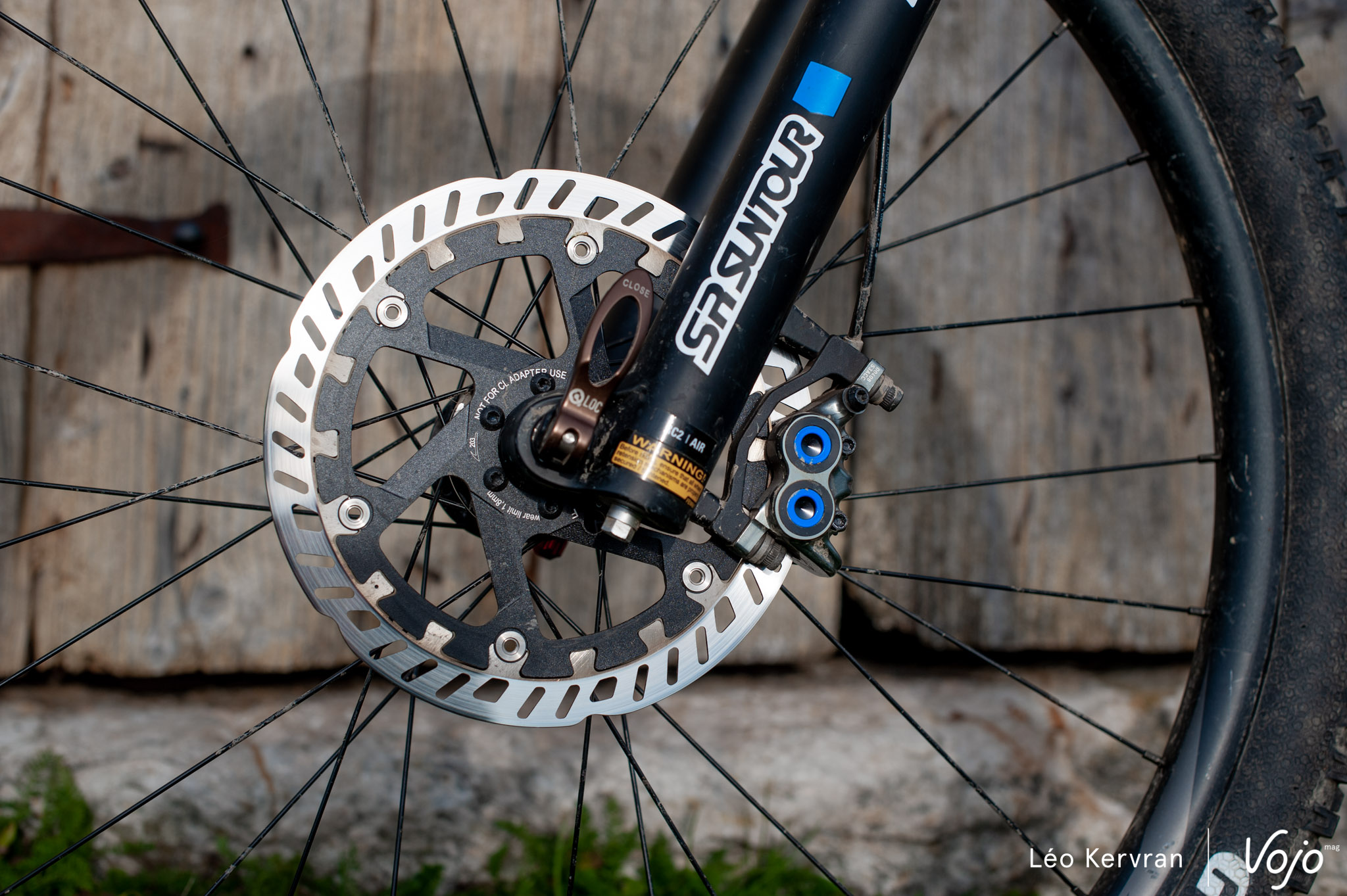 Changer les disques, c’est quelque chose dont on a déjà un peu plus l’habitude. On le voit parfois en XC pour gagner du poids par rapport aux modèles d’origines tandis qu’en enduro ou en descente, c’est sur la puissance et la modulation qu’on cherche à jouer, avec le choix de la taille notamment. En effet, un grand disque a un bras de levier plus grand qu’un petit disque (la piste de freinage est plus loin de l’axe de la roue) donc l’avantage mécanique est plus important : à effort égal sur la piste de frein, la force exercée au niveau de l’axe est plus importante. La marque annonce ainsi 10 % de « puissance » supplémentaire pour un 203 mm par rapport à un 180 mm.