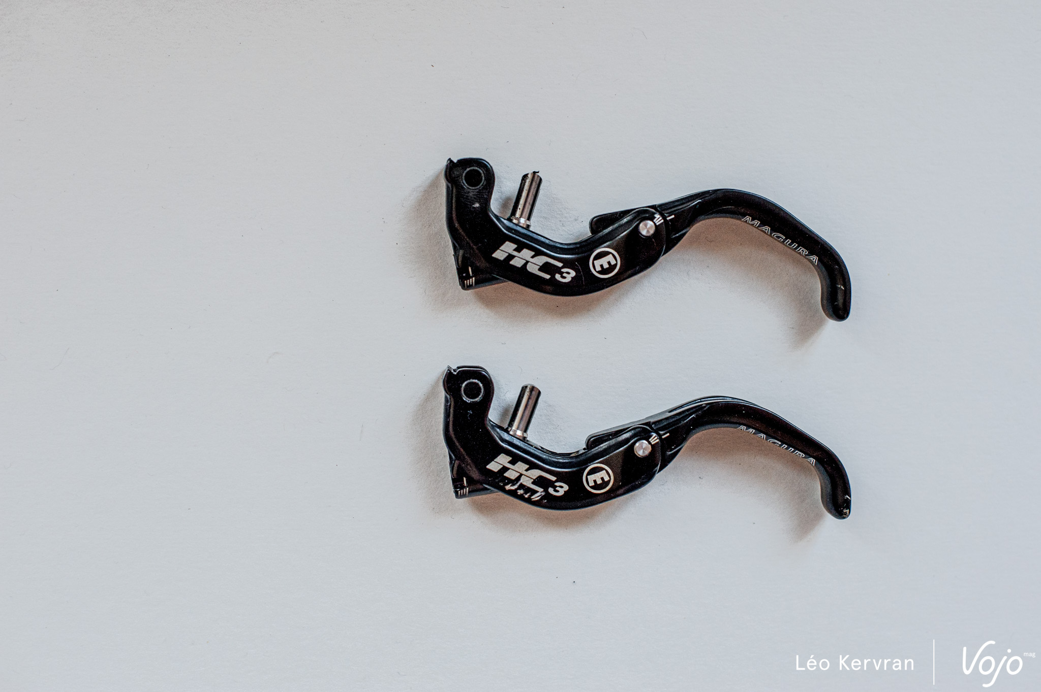 Conçus avec Danny MacAskill, les leviers HC3 sont les seuls chez Magura à proposer en plus du classique réglage de la garde un ajustement du ratio de puissance du frein. Cela se fait en modifiant l’angle de l’extrémité du levier, grâce à une clé hexagonale de 3 mm placée à proximité de l’articulation (sur la face « verticale » du levier). Plus elle est repoussée loin du levier, plus le point de contact sera ferme et le freinage « on-off ». A l’inverse, en rapprochant cette partie de la poignée, le freinage se fera bien plus doux et progressif.