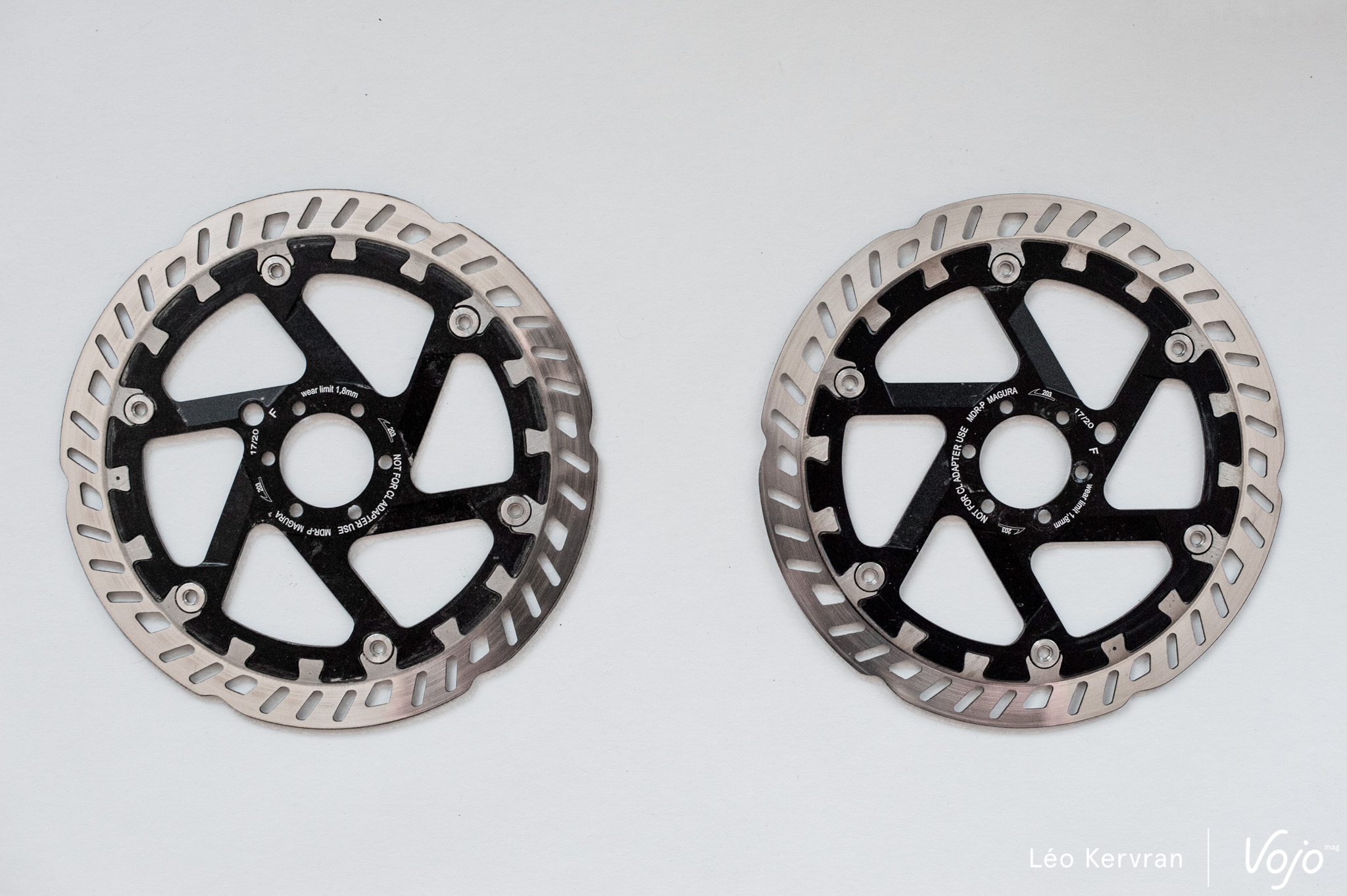 Un grand disque chauffera aussi moins vite. Puisqu’elle est plus loin de l’axe de roue, la piste tourne plus vite donc le freinage crée d’abord plus de chaleur mais comme la piste est plus longue, le refroidissement est bien meilleur que sur un petit disque. De plus, avec une puissance de freinage plus importante, on peut logiquement supposer que le freinage durera moins longtemps. Ce ne sont cependant pas les deux seules caractéristiques des disques qui peuvent influencer le freinage et comme nous l’avons vu durant ce test, l’épaisseur de la piste de freinage et la rigidité de l’ensemble doivent également être pris en compte.