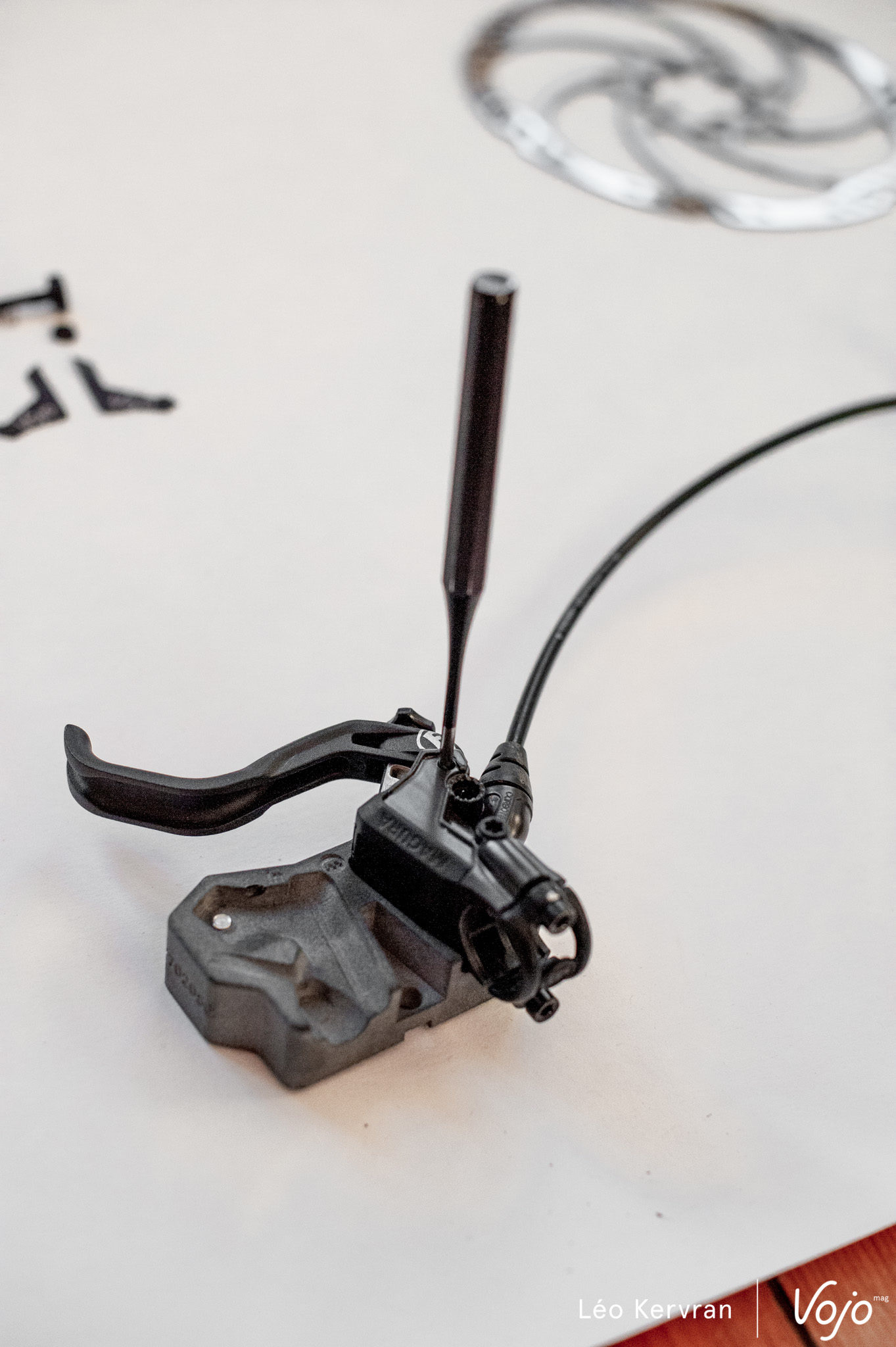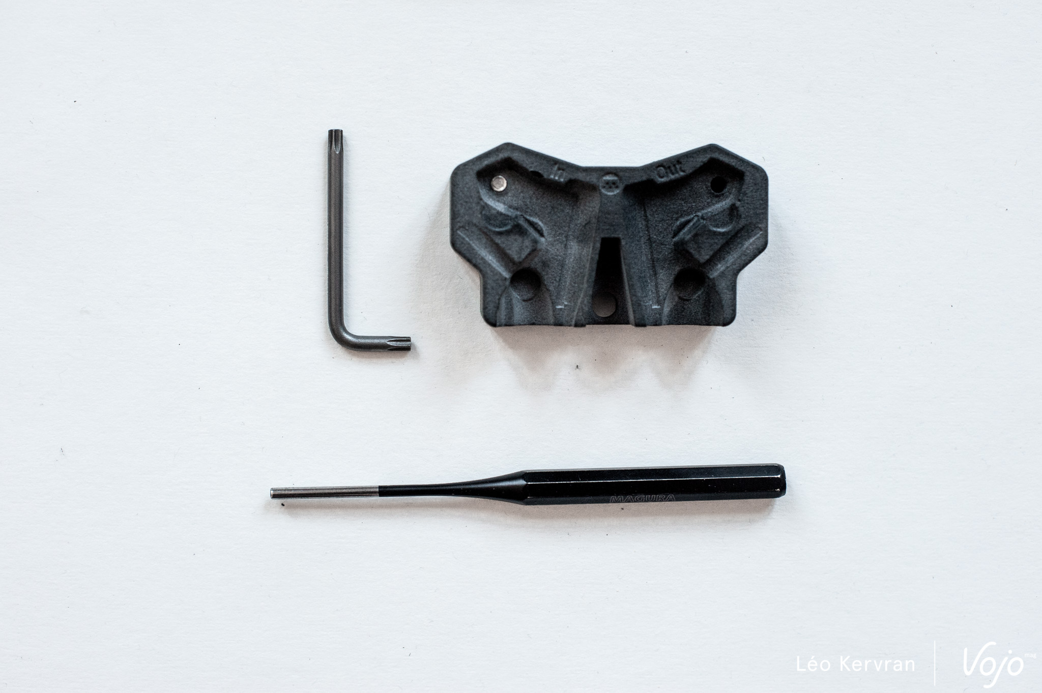 L’opération ne nécessite pas de purger les freins ni de les démonter complètement du vélo, il suffit d’isoler la partie maître-cylindre + levier du cintre. Côté outils, il faut se munir d’un maillet, d’un « burin » avec une pointe de 3 mm et d’une cale pour placer le maître-cylindre. Le kit (cale + burin) que vous voyez sur ces images est conçu spécialement pour cela par Magura et disponible au prix de 39 €. Cependant, il n’est pas obligatoire (les tutoriels vidéos tournés par la marque s’en passent d’ailleurs) et l’opération peut très bien se faire sans, surtout si on ne la fait qu’une seule fois.