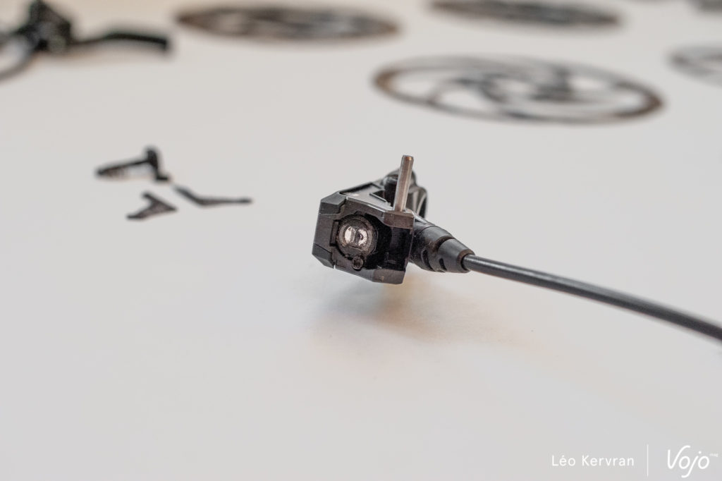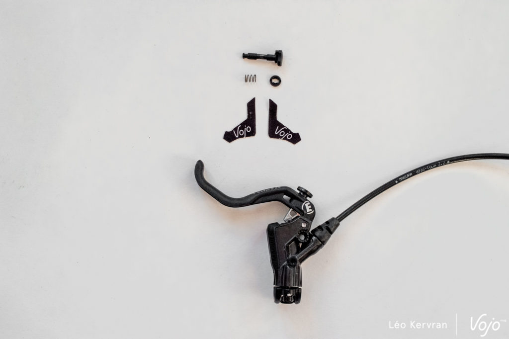 Cette option est disponible uniquement sur les freins avec un maître-cylindre en Carbotecture SL, c’est-à-dire les MT Trail SL, MT7 et MT8. Contrairement aux freins plus accessibles, où le maître-cylindre est d’un seul bloc, on retrouve ici deux petites feuilles de plastique (une de chaque côté) amovibles qui permettent de masquer l’axe du levier.