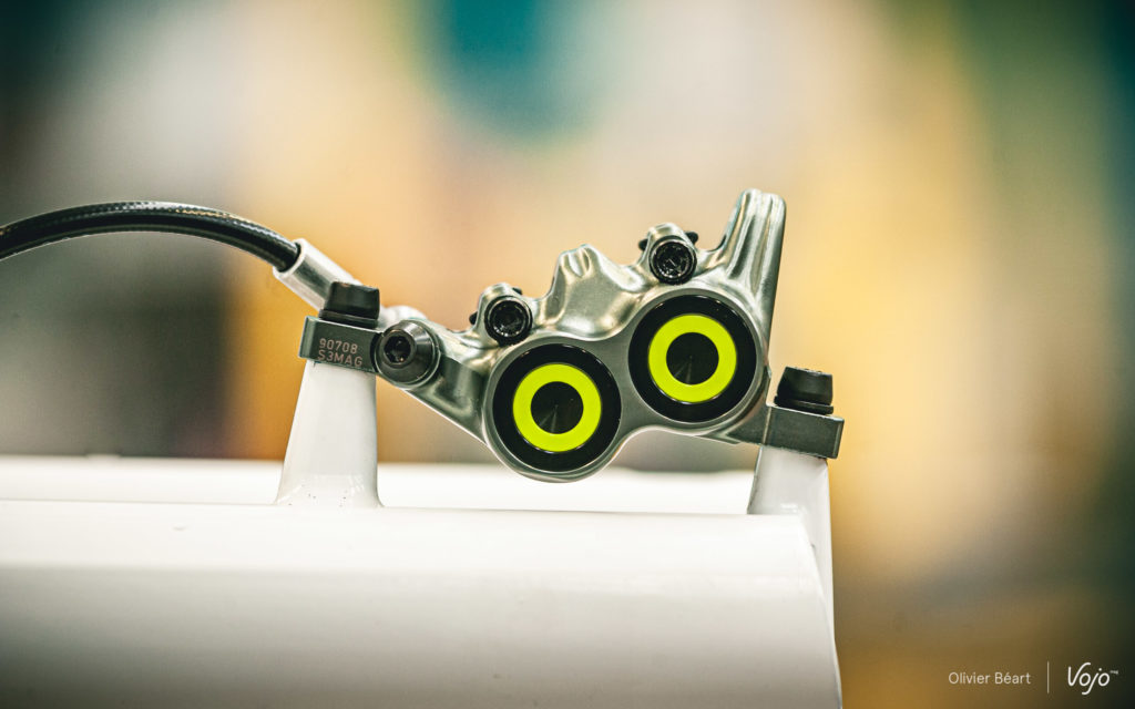 Les MT7 Pro font partie des rares freins à adopter une construction avec un maître-cylindre radial. Cette construction permet en théorie d’avoir de meilleures sensations qu’avec un maître-cylindre axial car il n’y a pas d’articulation directement placée entre le piston et le levier. Moins de pièces mobiles, cela signifie moins de frottements et moins d’éléments qui peuvent prendre du jeu.