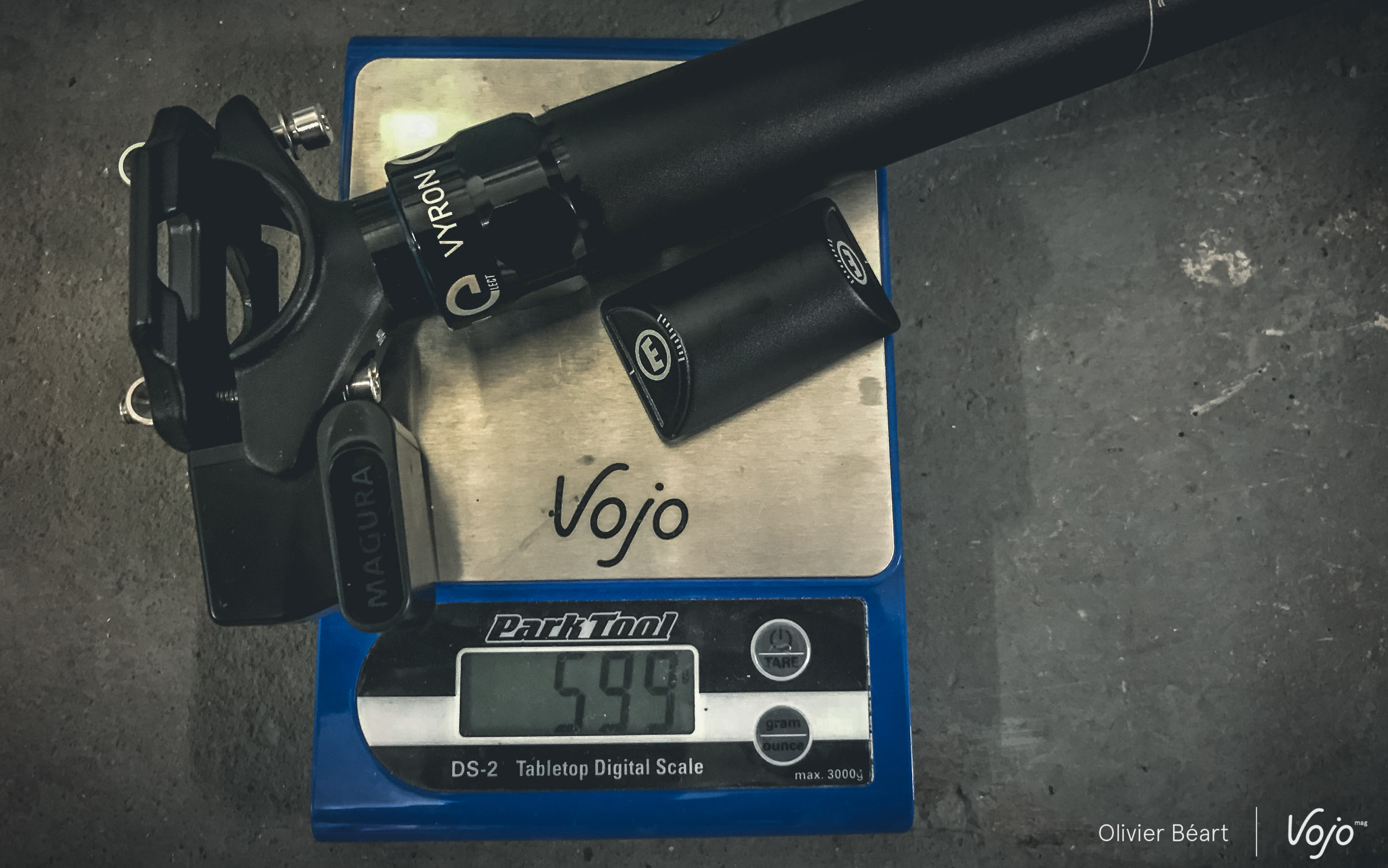 Avant de passer au test terrain, signalons que, sur la balance, la Magura Vyron affiche un poids de 599g + 16g de commande. On reste donc dans la moyenne des autres modèles du marché, et l’électronique n’occasionne pas de surpoids. Mieux : si on compte le câble et la gaine, elle est même un peu plus légère que certains modèles classiques. Niveau tarif, on est au-dessus de la concurrence. Avec 449€ annoncés, c’est 100€ de plus qu’une Reverb. Ca commence à compter, mais sa facilité de montage peut peser dans la balance.