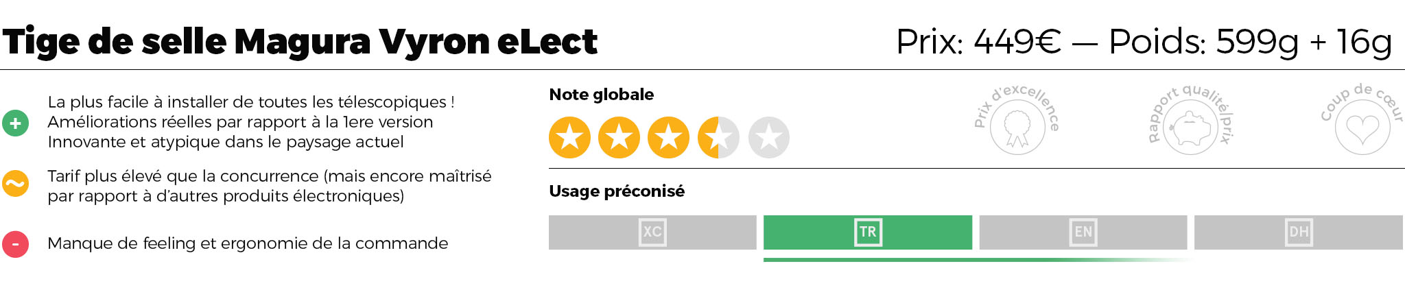 Magura a bel et bien fait évoluer sa Vyron dans la bonne direction. La tige de selle est aujourd’hui au point et agréable à utiliser. Son installation plug and play hyper facile est un atout unique qui séduira ceux qui n’aiment pas se prendre la tête en mécanique. Niveau fonctionnement, elle parviendra à convaincre les bikers qui ne sont pas en quête de performance ultime, mais il manque encore une commande plus « virile » et moins avare en retour de sensations pour s’attirer les faveurs des compétiteurs. On espère que Magura se penchera vite sur la question car il ne lui manquera alors plus grand chose pour être un véritable benchmark et envoyer à la retraite les « vieilles » commandes à câble.