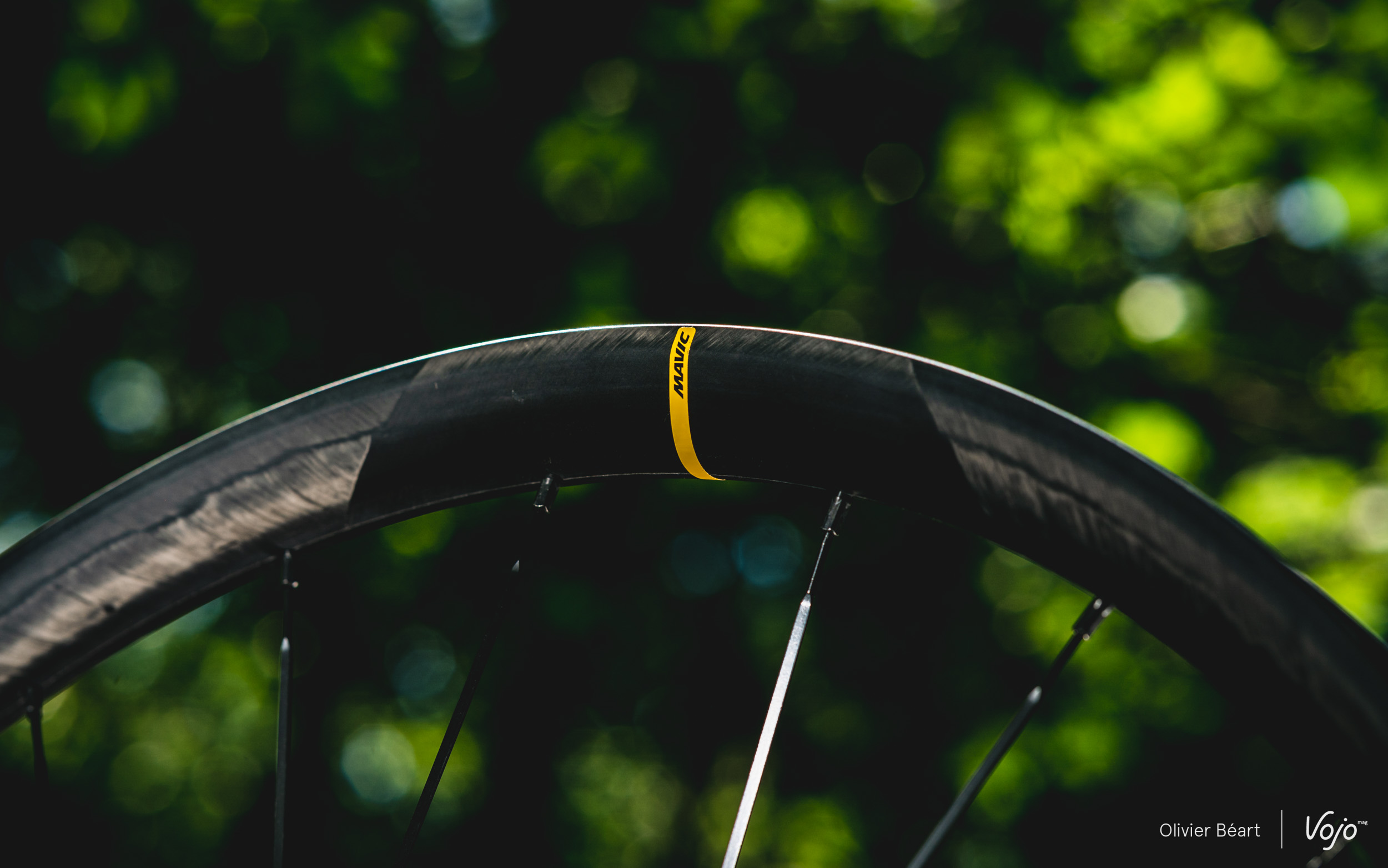 Pour finir de planter le décor, sachez que nous avons pesé les roues quasi exactement au poids annoncé par Mavic, avec un delta ne dépassant pas les 10g sur la paire de roues. Côté pneumatiques, nous n’avons éprouvé aucune difficulté avec les pneus cités ci-dessus. La jante semble parfaitement calibrée, les pneus se placent facilement, se gonflent et claquent tous avec une simple pompe à pied (sauf un Schwalbe qui a nécessité un compresseur, sans doute à cause de multiples montages/démontages qui l’ont un peu détendu), et le fond de jante inspire confiance car il n’a pas bougé d’un poil au cours du test malgré plusieurs changements de gomme. Bref, jusque-là, ça s’annonce bien.