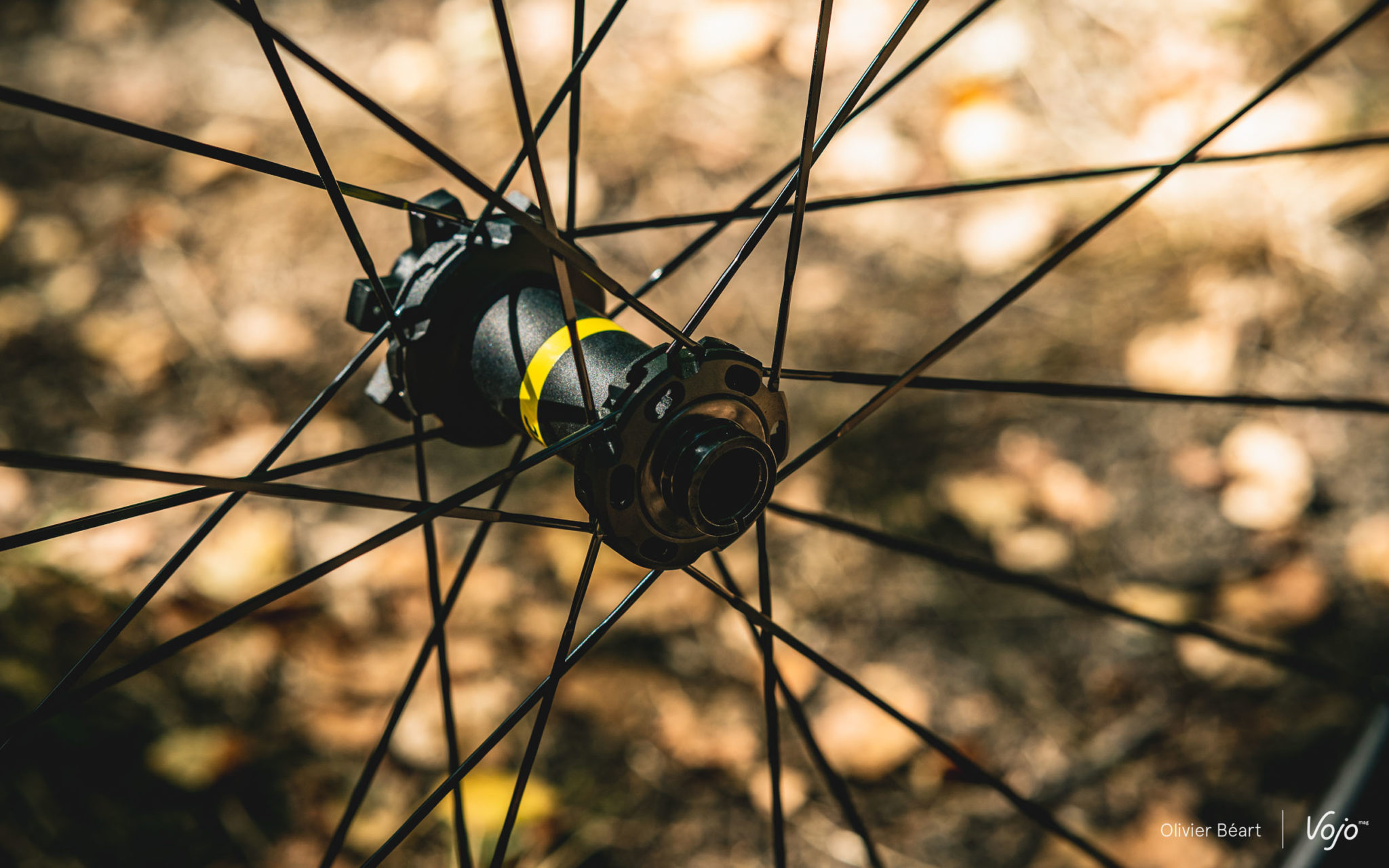 Pour ce qui est des aspects techniques, les jantes sont donc en carbone avec finition unidirectionnelle, sans crochets et asymétriques au niveau du perçage des rayons. L’étanchéité pour le tubeless est obtenue au moyen d’un « flap » adhésif en fond de jante. Pour les rayons, plus du tout d’alu chez Mavic (et c’est tant mieux) mais 24 rayons acier, plats, de forte section propres à Mavic et croisés par deux, ce qui leur donne une petite spécificité par rapport aux concurrentes. Enfin, les moyeux maison accueillent des rayons à tête droite et ils sont disponibles uniquement en Boost (110 avant, 148 arrière) mais dans plusieurs options pour les disques (6 trous ou Centerlock) et le corps de roue-libre (Shimano HG ou Microspline et Sram XD). Bref, on pourra installer ces roues sur tous les vélos récents. A noter aussi que l’architecture des moyeux permet l’utilisation d’un seul type de rayon, de la même longueur. Pratique en cas de pépin !