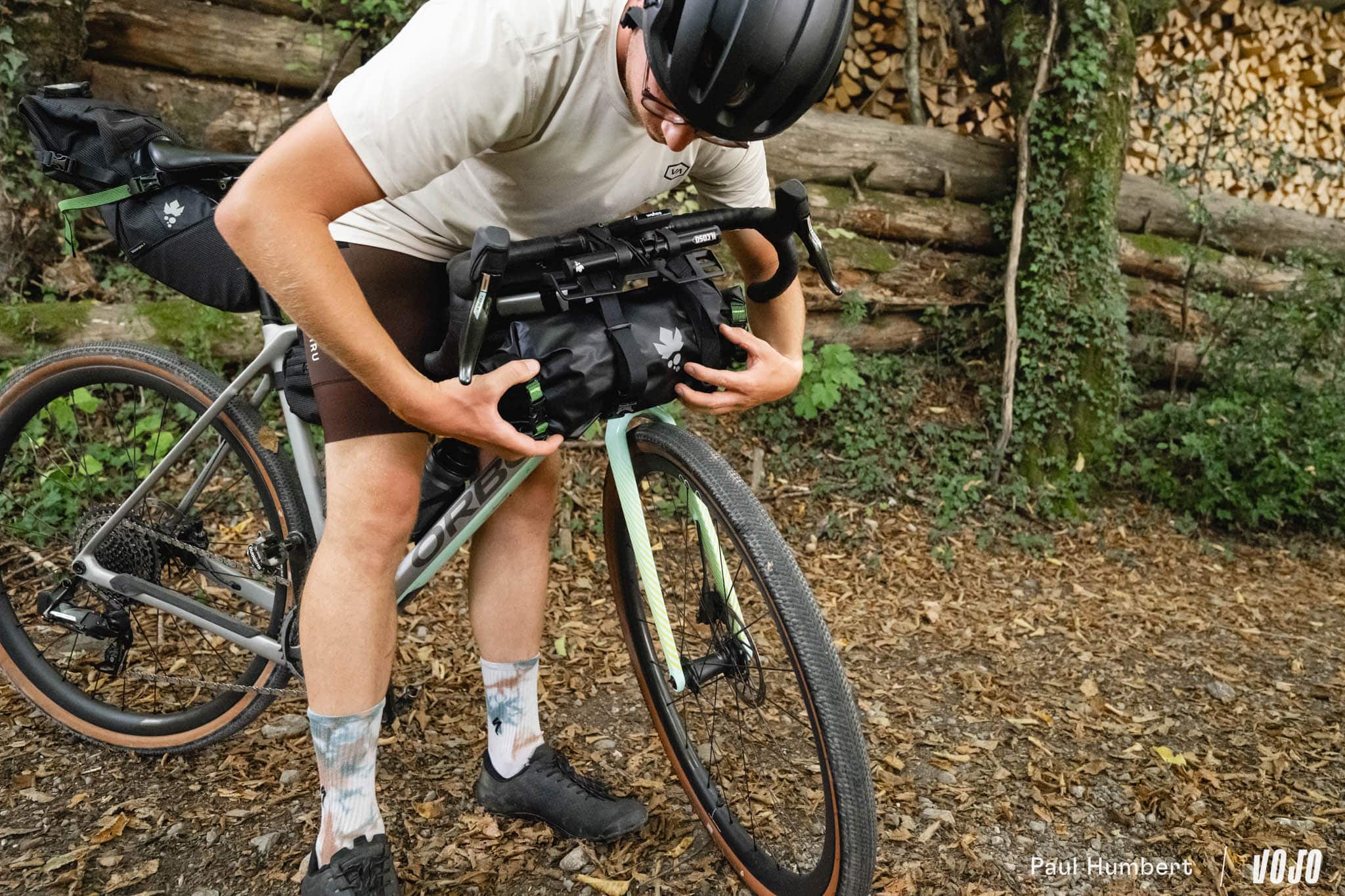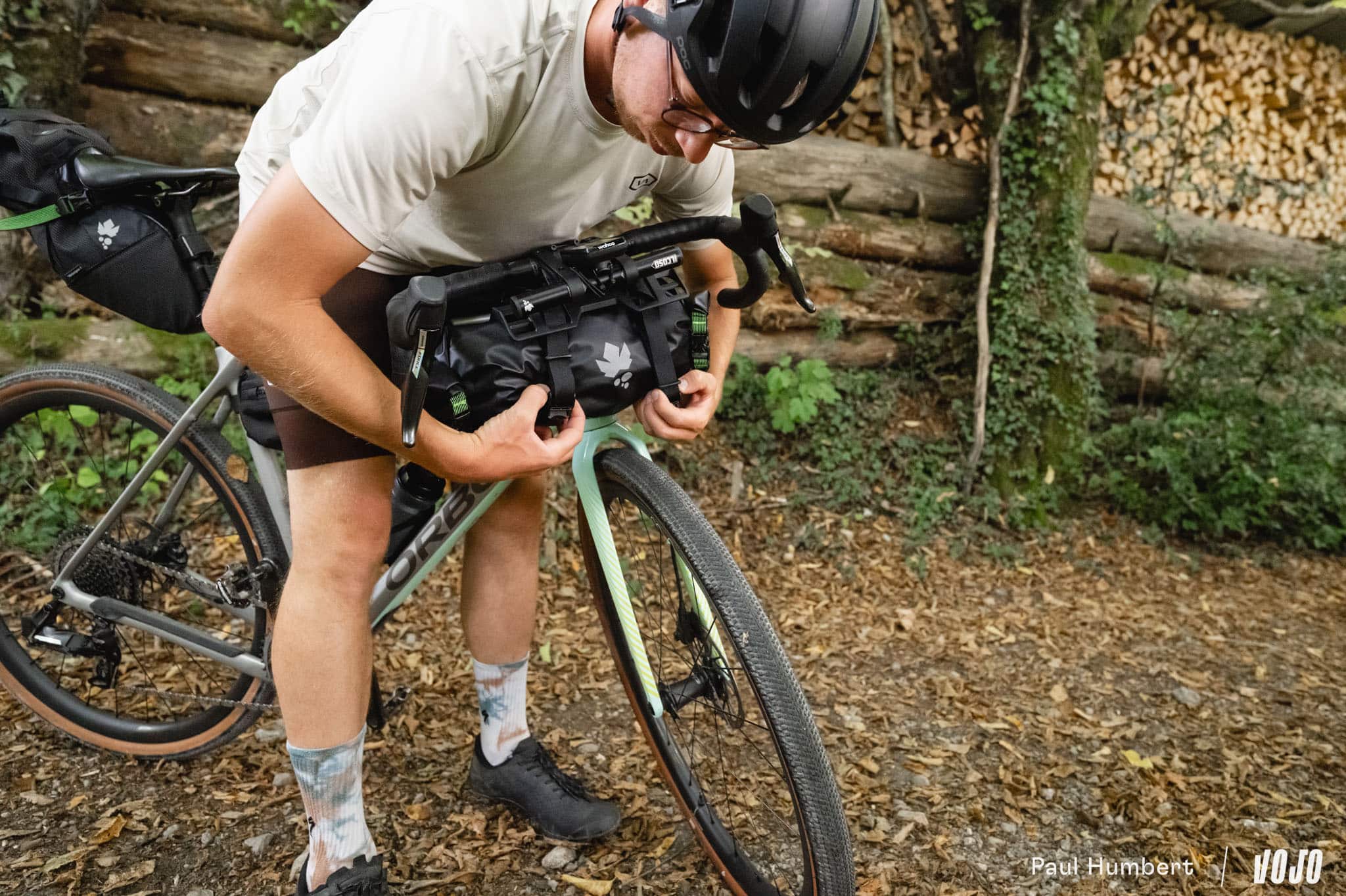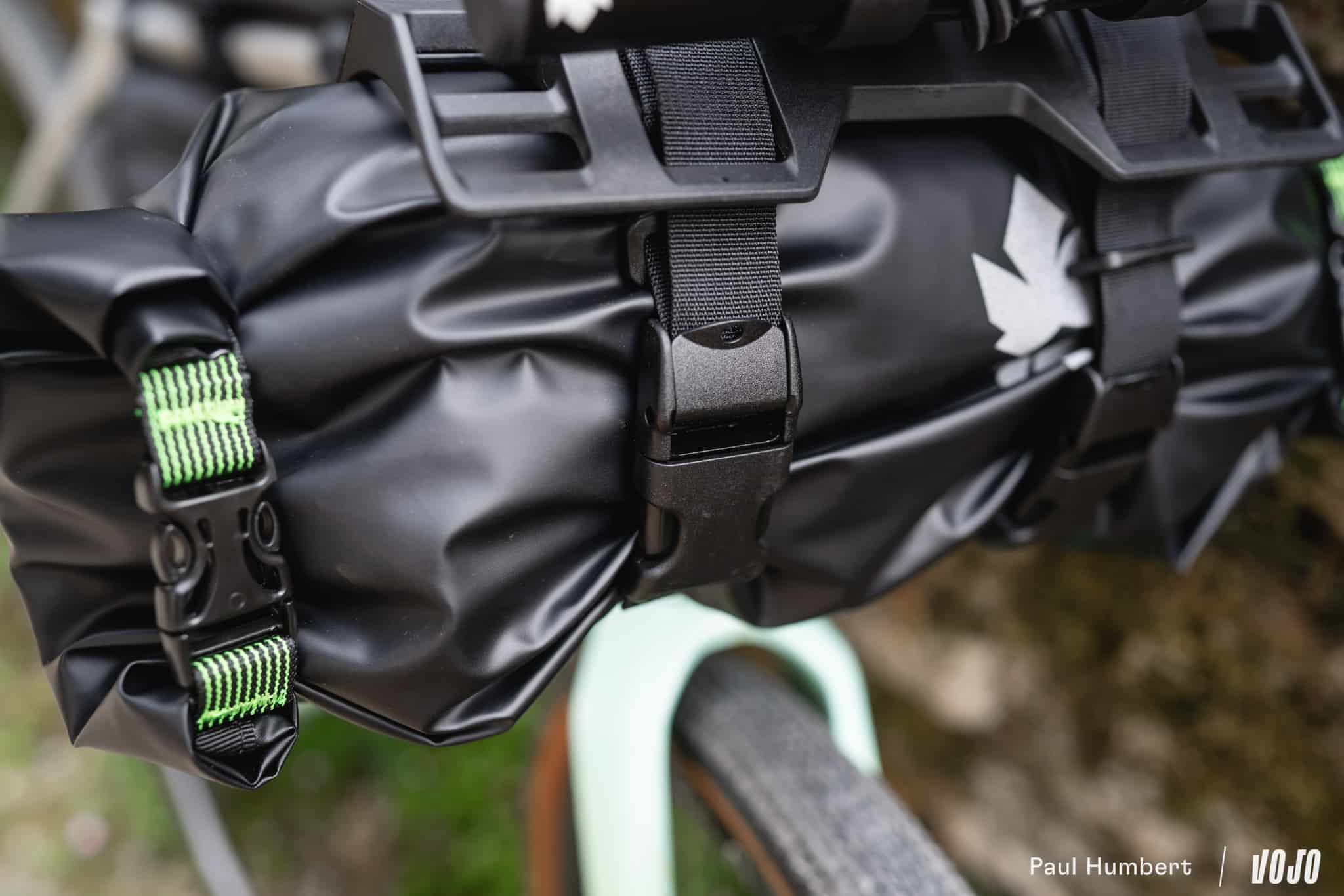 Sur le papier, nous ne sommes jamais partisans d’ajouter du poids à l’avant du vélo, mais dans cette configuration, ce système a la grande qualité de ne pas bouger ni tanguer de la moindre des manières, et c’est très confortable. On reste également à distance de la peinture de la douille de direction, même si avec les autres sacoches installées sur le vélo, on ne peut que vous inviter à protéger votre beau gravel ou VTT avec une de ces protections intégrales (comme proposées par Slicy, Ridewrap ou Invisiframe)