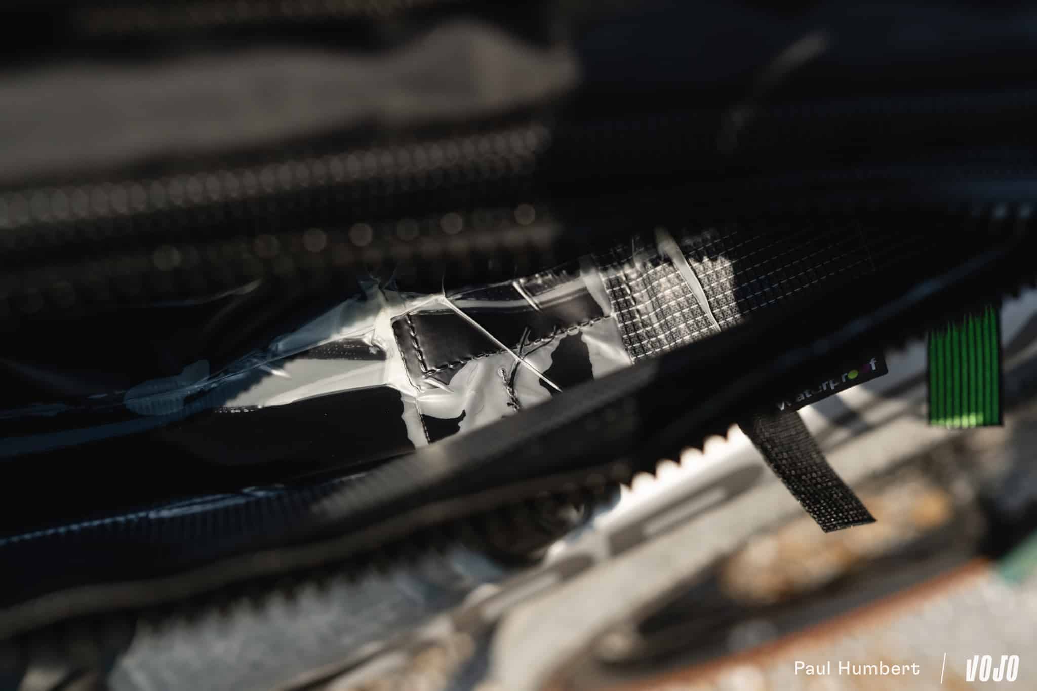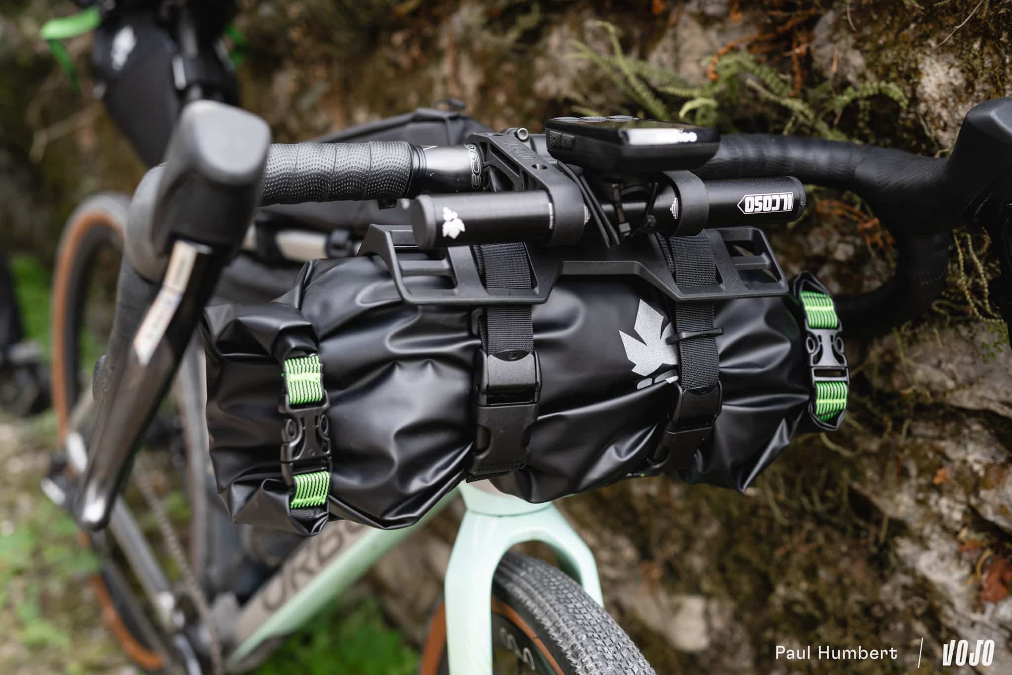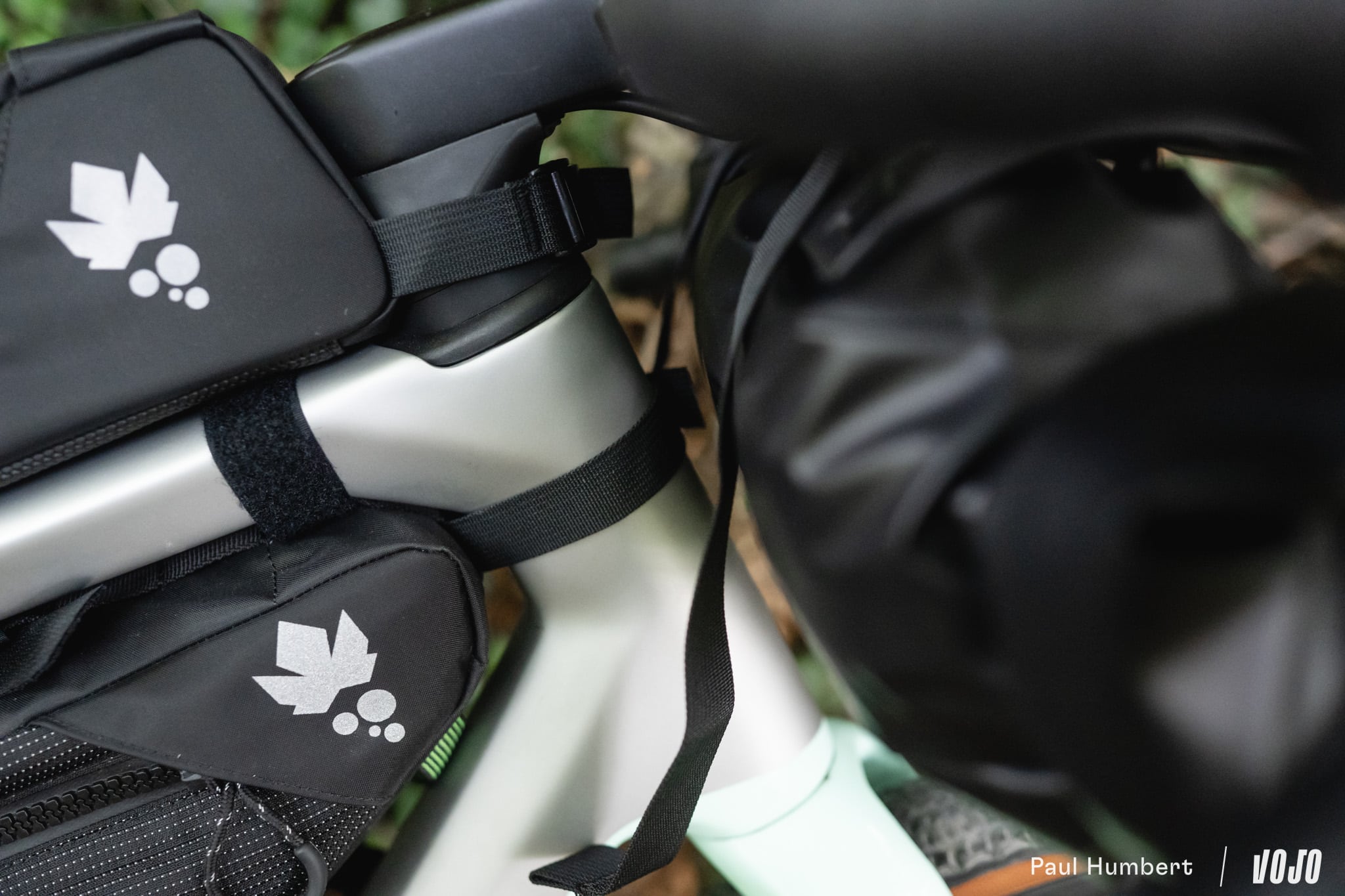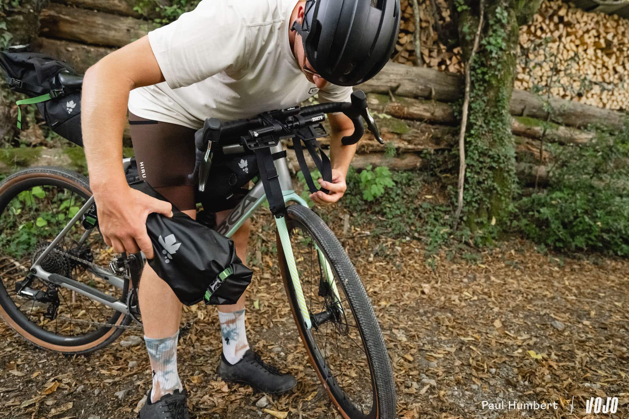 Sur le papier, nous ne sommes jamais partisans d’ajouter du poids à l’avant du vélo, mais dans cette configuration, ce système a la grande qualité de ne pas bouger ni tanguer de la moindre des manières, et c’est très confortable. On reste également à distance de la peinture de la douille de direction, même si avec les autres sacoches installées sur le vélo, on ne peut que vous inviter à protéger votre beau gravel ou VTT avec une de ces protections intégrales (comme proposées par Slicy, Ridewrap ou Invisiframe)