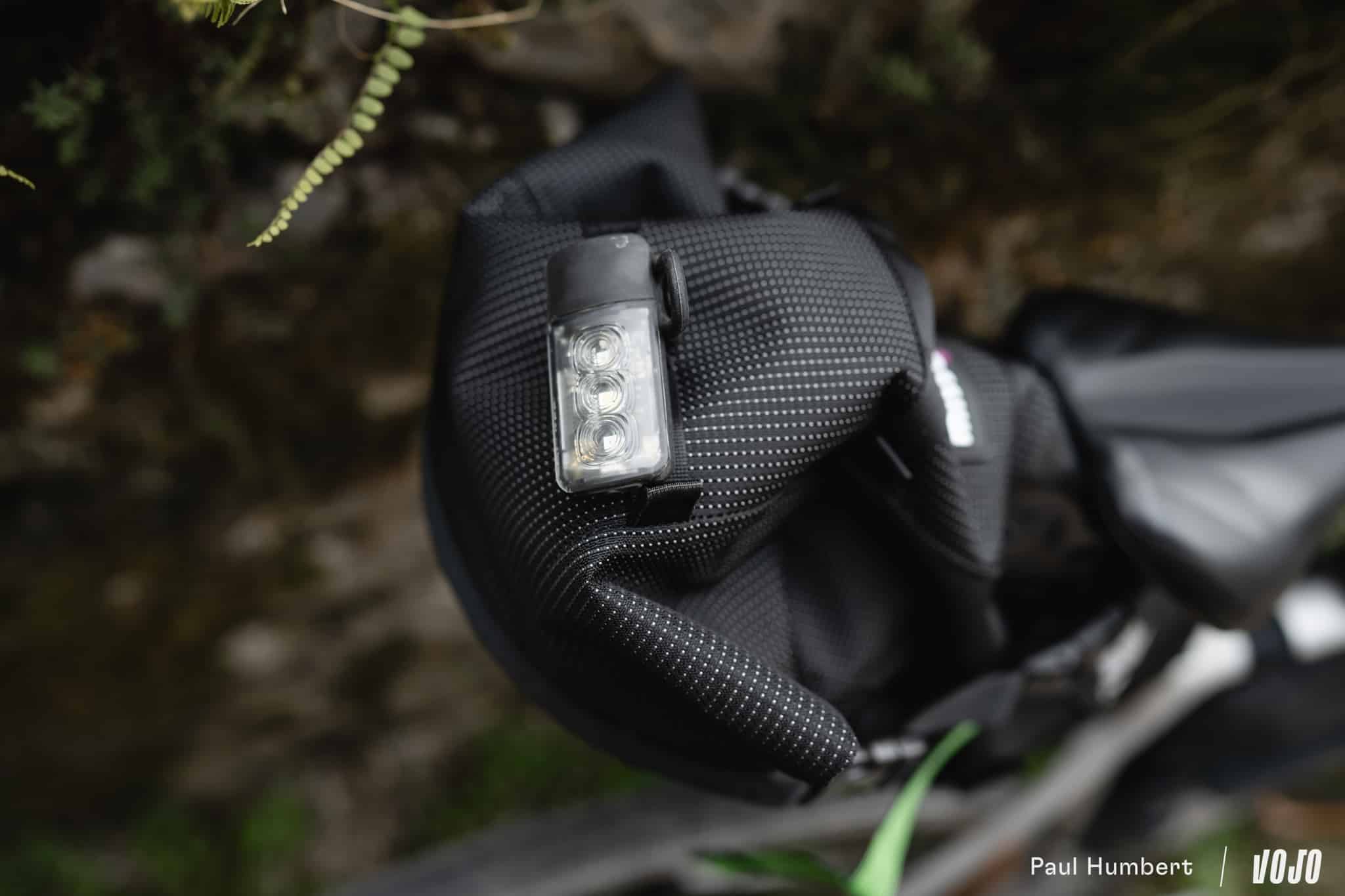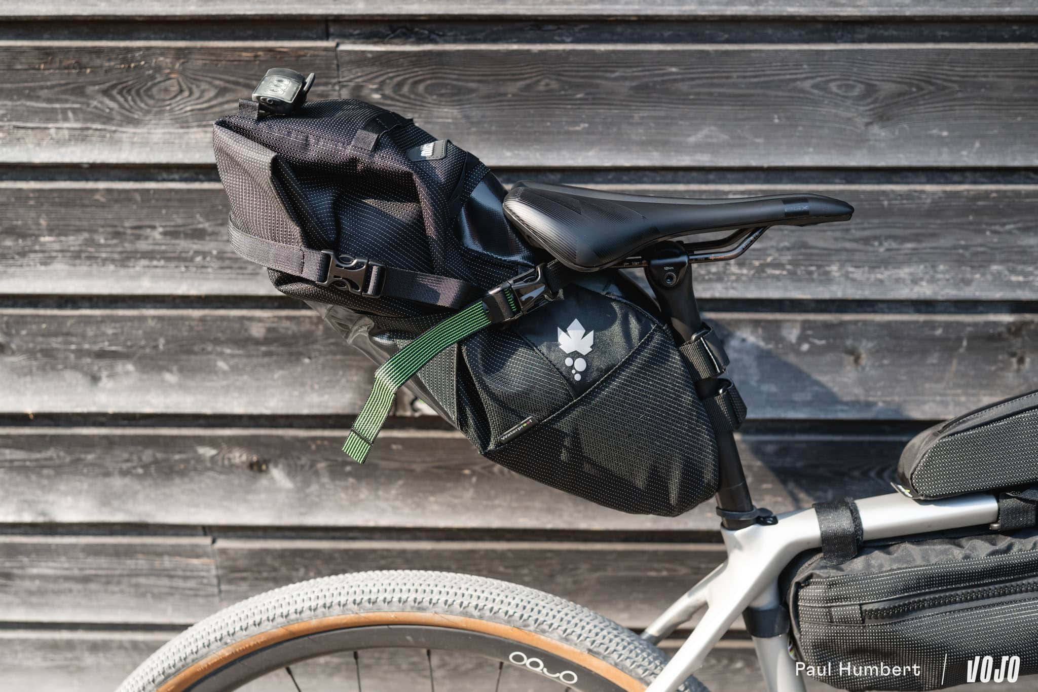 On a apprécié la sacoche de selle Cluster pour son design « vertical », qui positionne d’abord le poids et le chargement vers le bas, avant d’aller vers l’arrière. Les sangles de fixation au niveau de la selle sont facilement réglables, mais souples et sans armature plastique, ce qui nécessite un ajustement soigneux. On apprécie également le revêtement résistant à l’eau, et les interfaces de fixation, pour une lampe notamment. Tarifs neufs compris entre 175 et 186 euros.