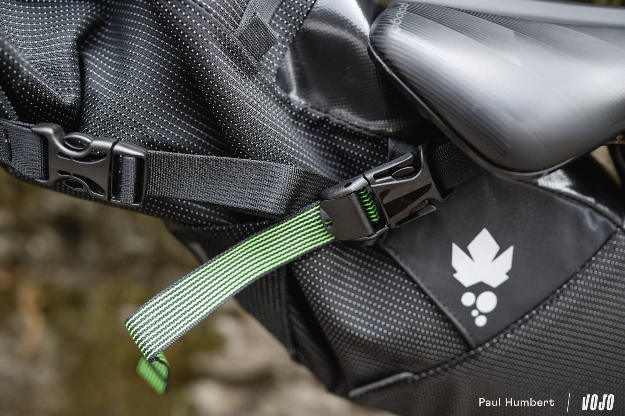 Une fois installé, on resserre le système après quelques tours de roue, et plus rien ne bouge. Nous avons utilisé un sac étanche de 8 litres livré par Missgrape dans le cadre de notre test. On apprécie la facilité avec laquelle on installe ou désinstalle ce dernier. En bikepacking, on peut ainsi attraper ses affaires et laisser son vélo rapidement, sans avoir à désinstaller tout son harnachement. La marque conseille une première installation des sangles de fixation vers l’intérieur de l’Ilcoso, mais on les positionnera ensuite à l’extérieur. Il est également possible de doubler le maintien, même si nous n’avons pas ressenti ce besoin dans notre cas.