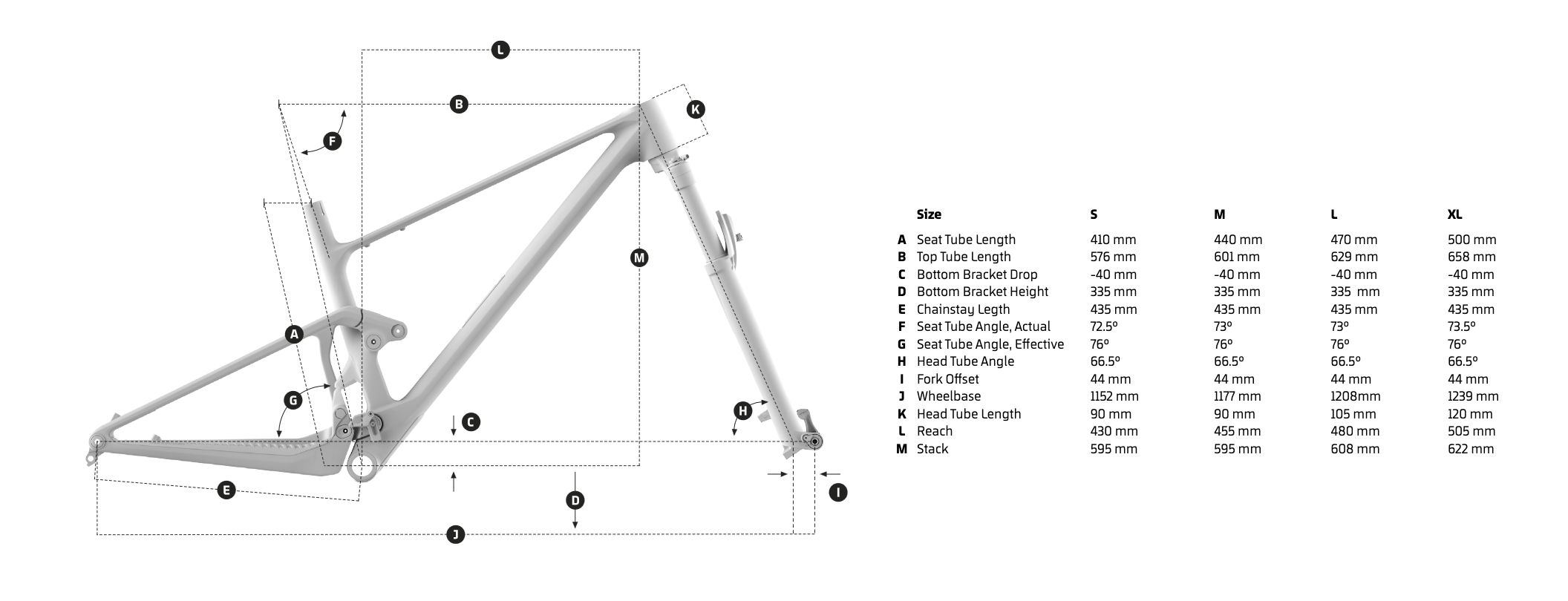 Côté géométrie, ce F-Podium s’inspire (beaucoup) de son prédécesseur au niveau du reach (455 mm en M soit -5 mm, 480 mm et pas de changements en L). Le passage à une fourche de 120 mm a par contre eu une conséquence sur la position qui est un peu plus haute (+20 à 25 mm de stack). On notera également que l’empattement s’allonge considérablement par rapport à la précédente génération (+20 à 36 mm), un peu à cause des bases (+3 mm), mais surtout à cause de l’angle de direction, qui perd 1,5° et affiche désormais 66,5°. Les bases mesurent 435 mm pour toutes les tailles. Bref, on est sur ce qui se fait de plus contemporain pour du XC offensif.