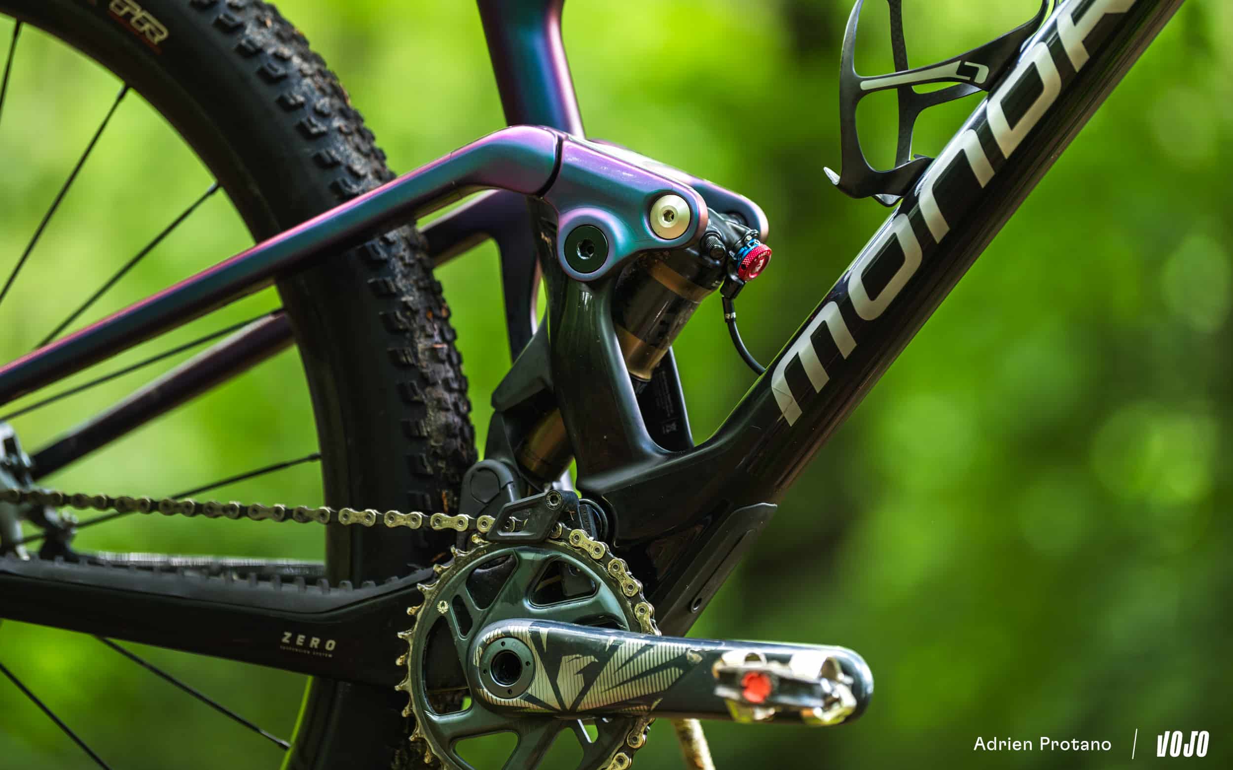 L’augmentation du débattement n’est pas la seule évolution côté suspension puisque l’architecture en elle-même évolue en profondeur sur ce nouveau F-Podium. Si Mondraker a conservé son système maison, baptisé Zero (pour zéro pompage, zéro kick back et zéro verrouillage au freinage), avec un système à point de pivot virtuel et un amortisseur flottant, ce dernier ne prend plus appui sur un basculeur, mais directement sur le triangle arrière, au-dessus des bases.