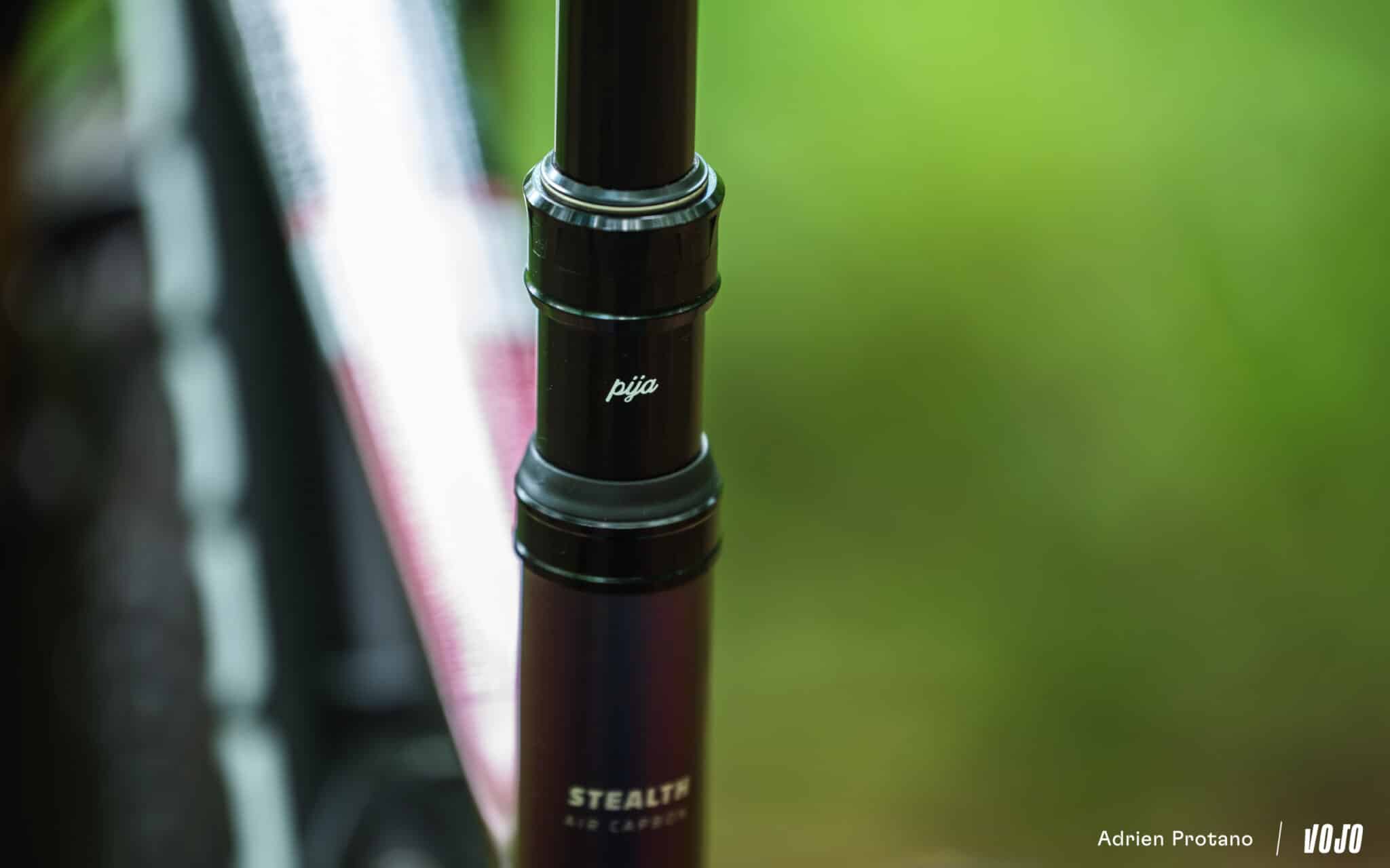 OnOff, la marque maison de composants de Mondraker, s’occupe du poste de pilotage avec un cintre en 760 mm de large et une potence de 50 mm de long. La tige de selle télescopique est maison également (OnOff Pija) et offre entre 120 et 150 mm de débattement (ajustable au choix par incrément de 10 mm). Celle-ci est surmontée d’une selle Fizik Vento Argo X5. Tous ces composants sont de très belle facture. Nous avons simplement noté que la tige de selle nécessite une petite attention au niveau de la lubrification, mais l’opération est simple à réaliser.