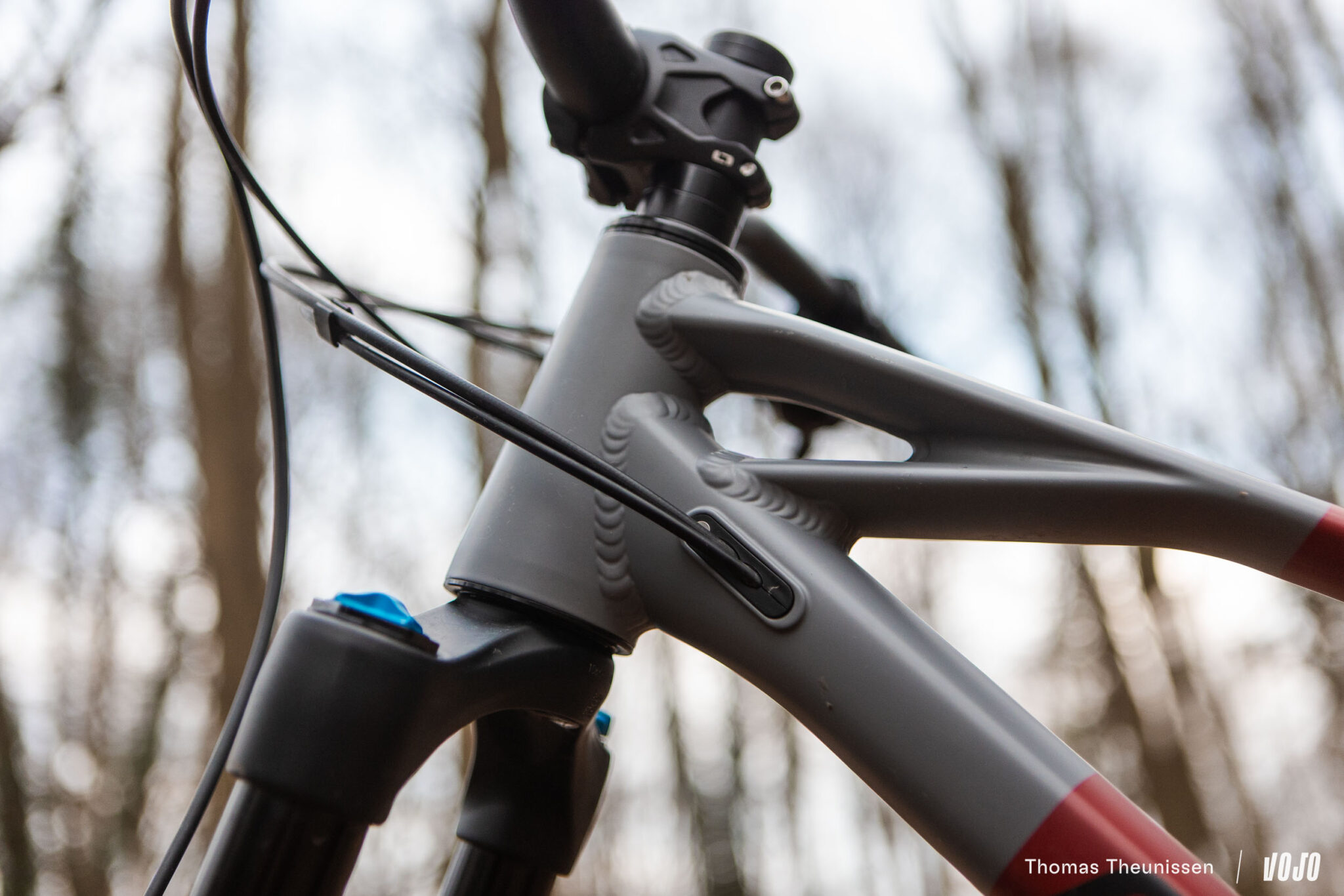 Contrairement au modèle en carbone, les gaines et Durits passent en interne, avec des entrées par le haut du tube diagonal cette fois, et non par le jeu de direction.