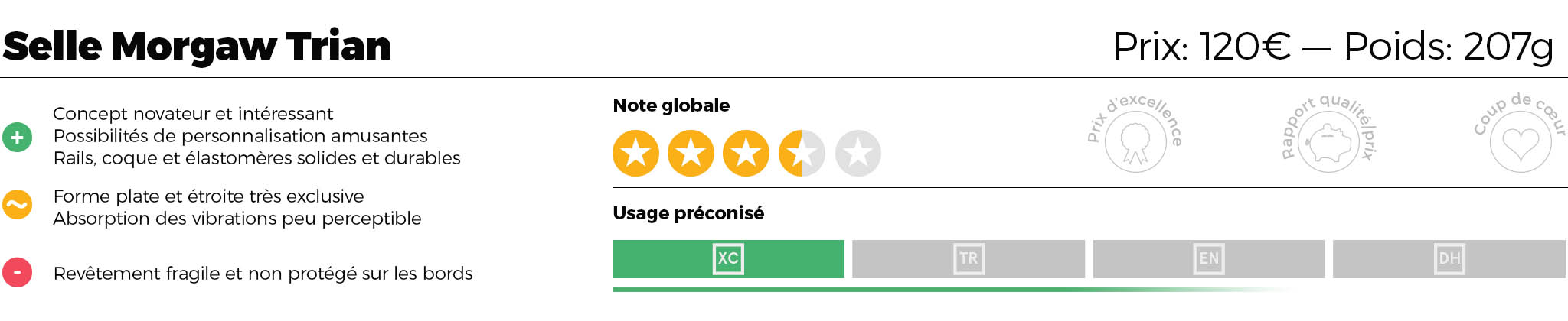 Le concept de la selle Morgaw Trian est très intéressant et si la partie absorption des chocs est plutôt anecdotique sur un VTT, l’accompagnement des mouvements du pédalage est franchement une bonne idée. Si la fiabilité globale est bonne, il est dommage de constater que la réflexion sur plusieurs points n’a pas été plus poussée. On pense notamment à l’absence de renforts qui rend les versions vtt vulnérables, mais aussi et surtout à la présence d’une seule forme d’assise très exclusive et qui ne plaira pas à tout le monde. Si vous êtes un fin crosseur, pas de souci, mais pour les autres profils, un essai préalable s’impose. Espérons que Morgaw ne s’arrêtera pas en si bon chemin et que la petite marque aura les moyens d’élargir sa gamme à l’avenir, car c’est rafraichissant de voir ce genre de produit débarquer sur le marché.
