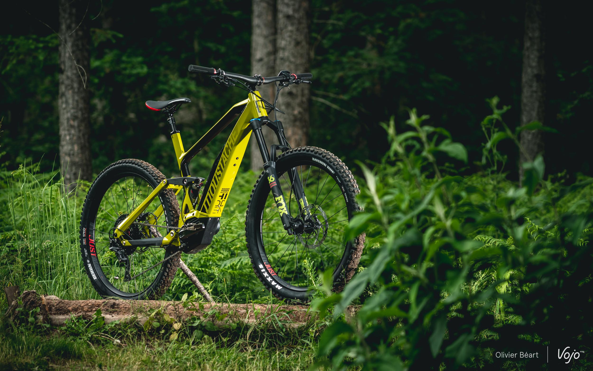 Ces roues sont montées avec des pneus Maxxis en 2.8, avec un Rekon parfaitement à sa place à l’arrière grâce à son bon compromis traction/rendement. Par contre, sur le Race, Moustache place intelligemment un Minion DHF nettement plus directif que le Rekon monté sur les modèles Trail et qui manque selon nous cruellement d’accroche latérale. On peut aussi, si on le souhaite, monter une roue de 29″ avec un pneu plus fin (2.5 par exemple) à l’avant pour gagner encore en précision.