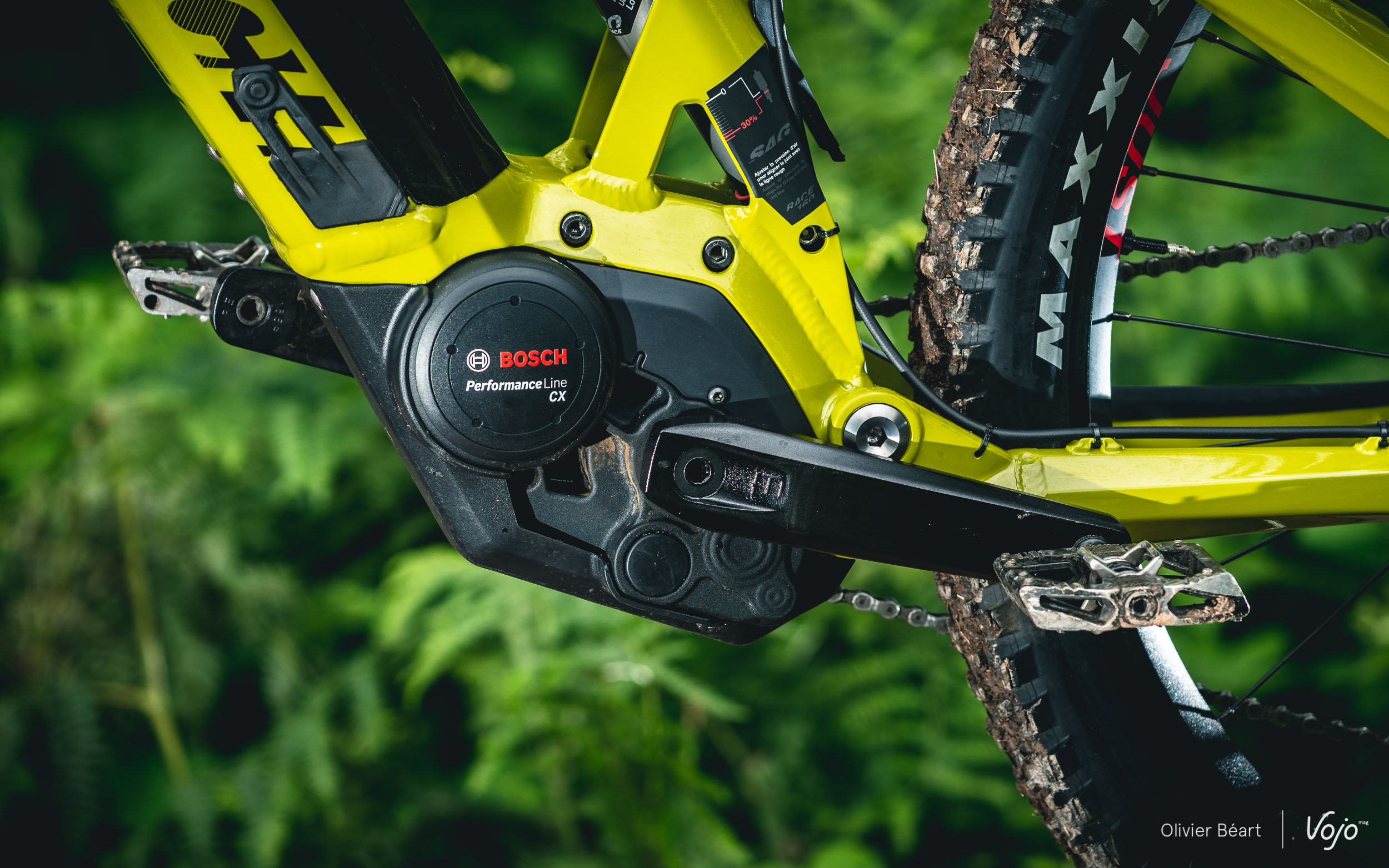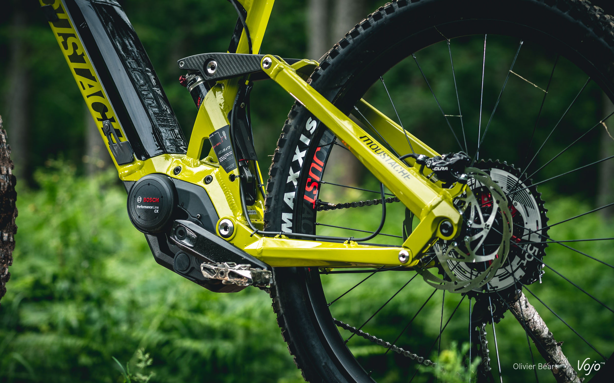 Moustache a positionné le moteur en légère rotation afin de placer le point de pivot principal de manière idéale pour limiter le pompage notamment. La marque a aussi mis à profit la largeur du bloc moteur Bosch pour déporter un maximum les roulements du pivot principal et augmenter aussi la rigidité.