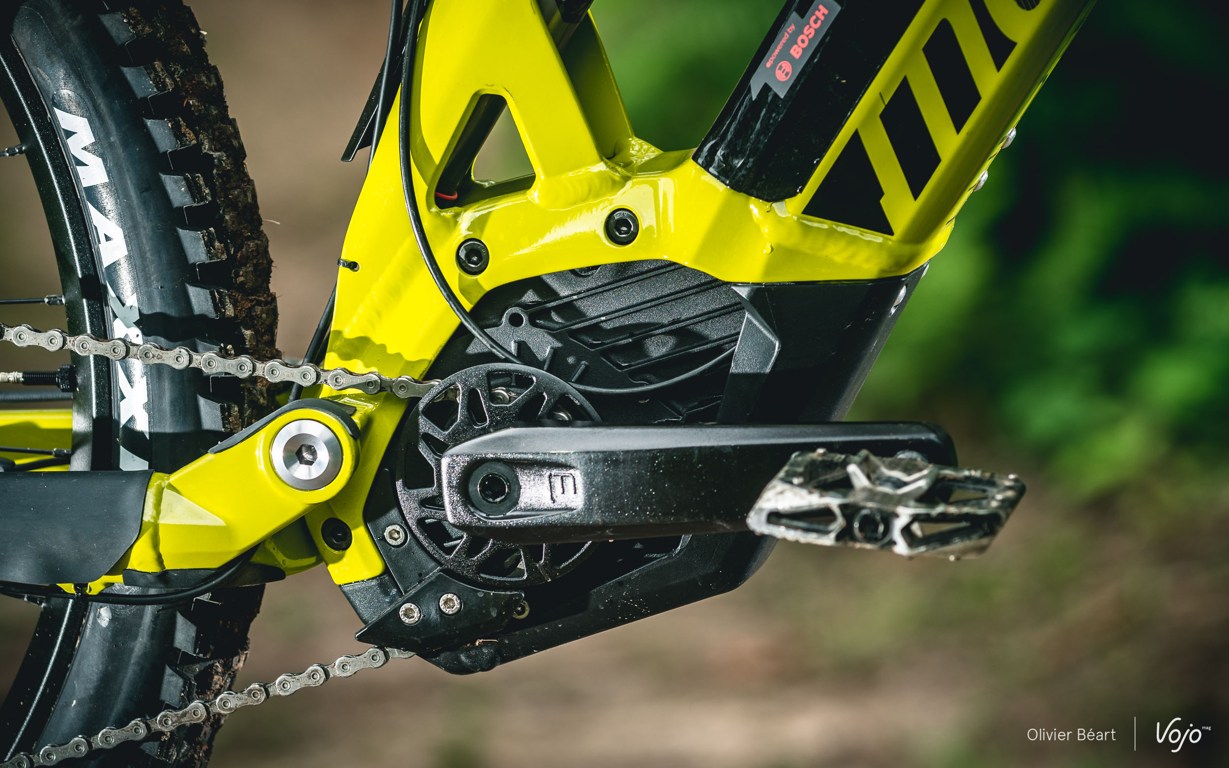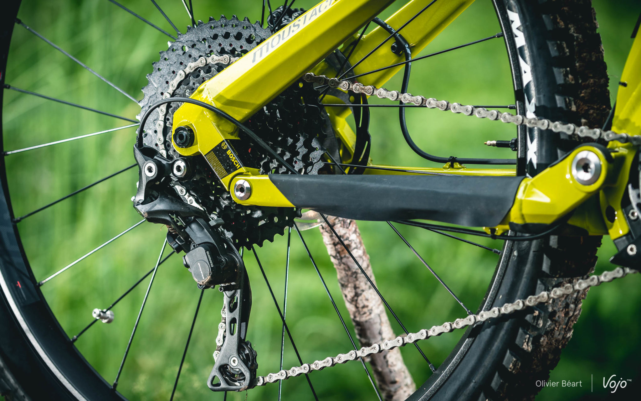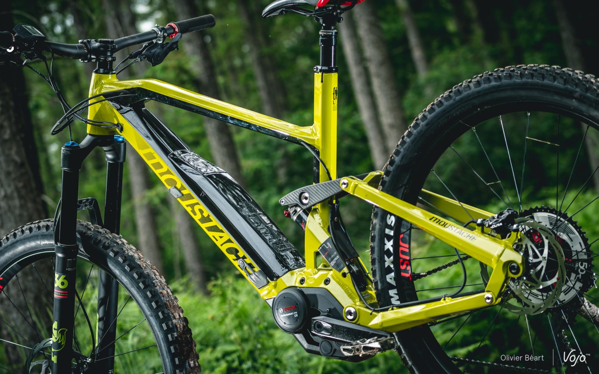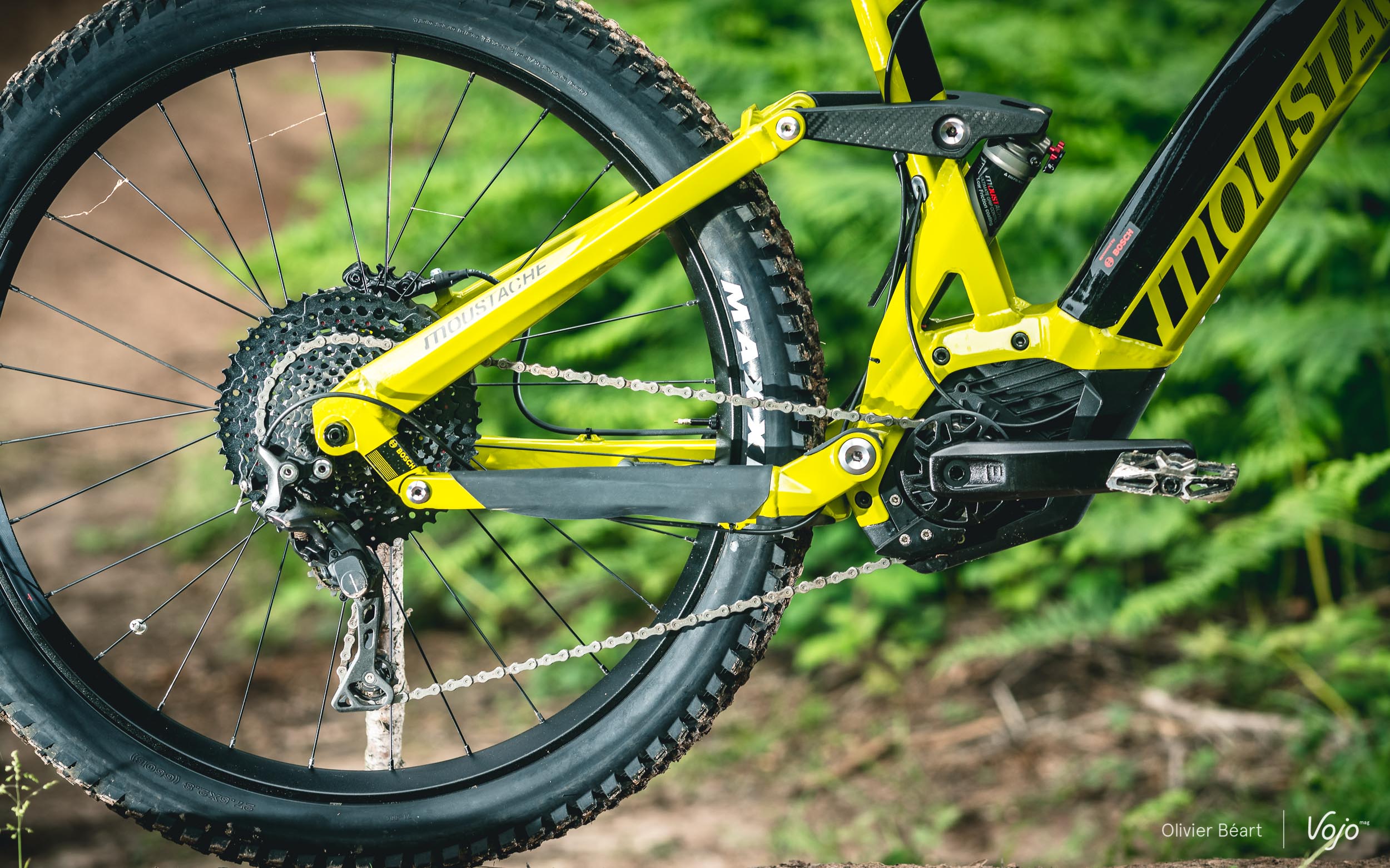 Moustache a positionné le moteur en légère rotation afin de placer le point de pivot principal de manière idéale pour limiter le pompage notamment. La marque a aussi mis à profit la largeur du bloc moteur Bosch pour déporter un maximum les roulements du pivot principal et augmenter aussi la rigidité.