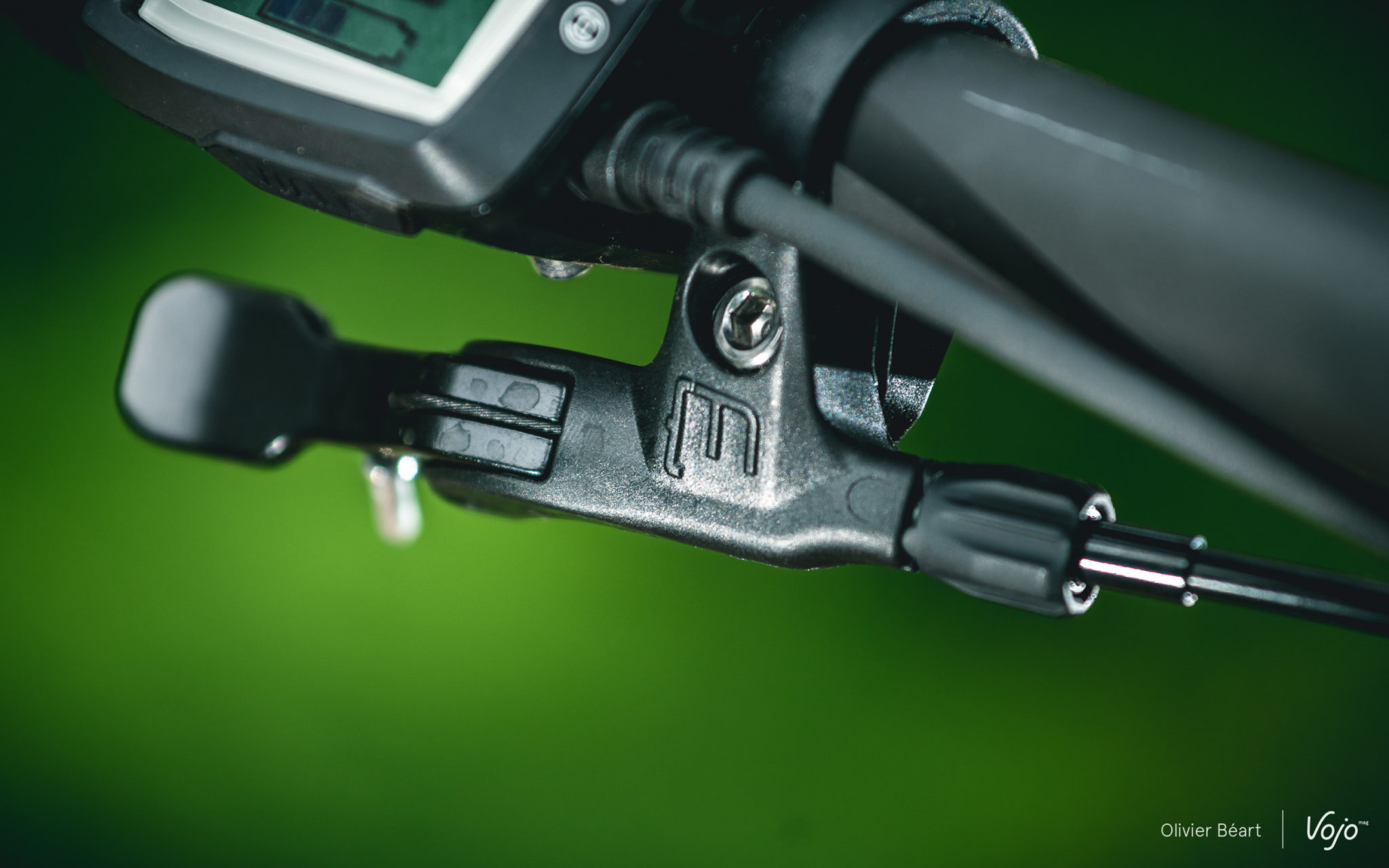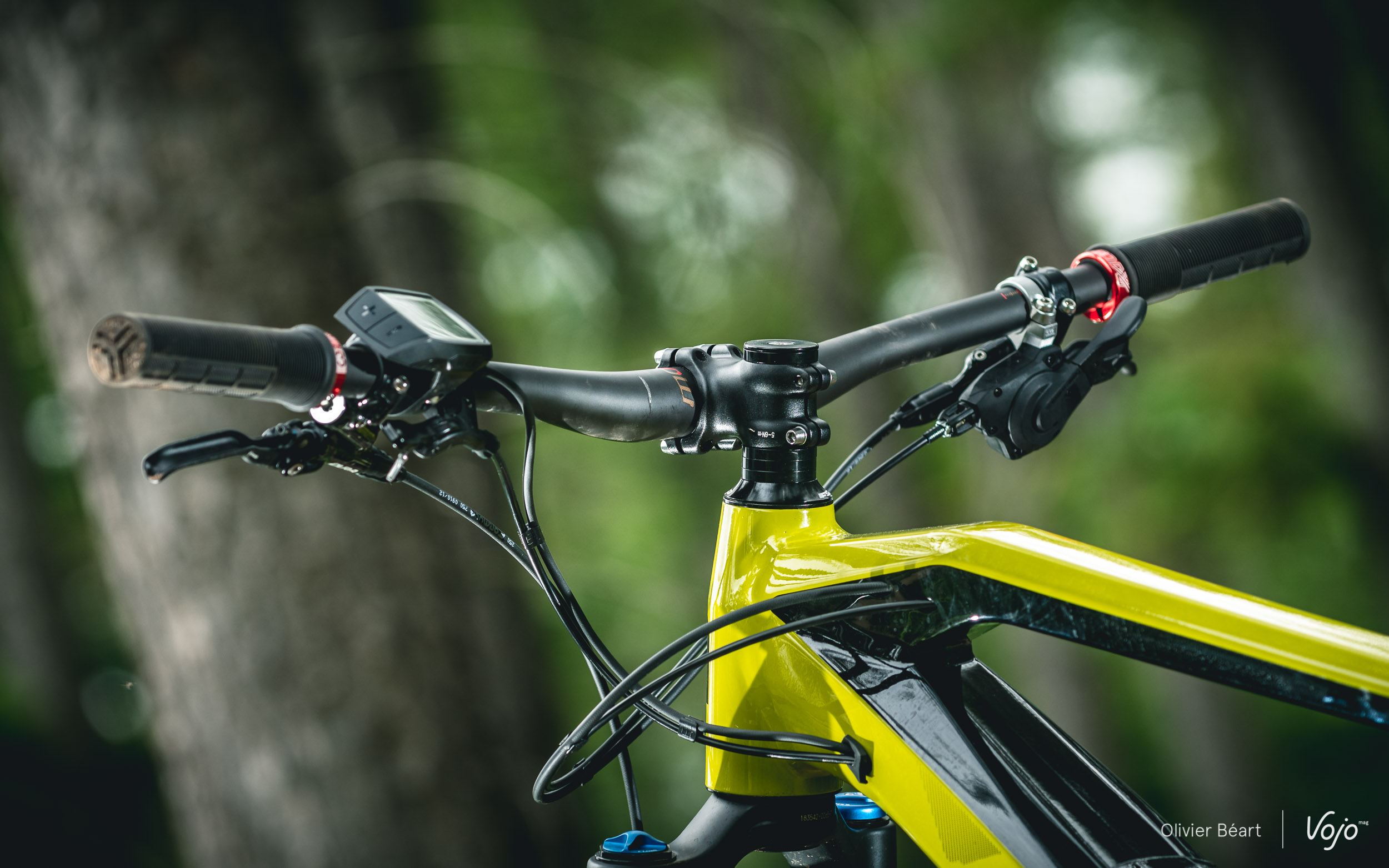 Le poste de pilotage maison se compose d’une potence alu de 50mm de long et d’un cintre en carbone de très belle facture en 760mm de large. Les grips SB3 sont très agréables et, si la commande Bosch n’est pas très esthétique et les informations fournies sur l’écran très sommaires, ses boutons sont bien accessibles et faciles à manipuler.