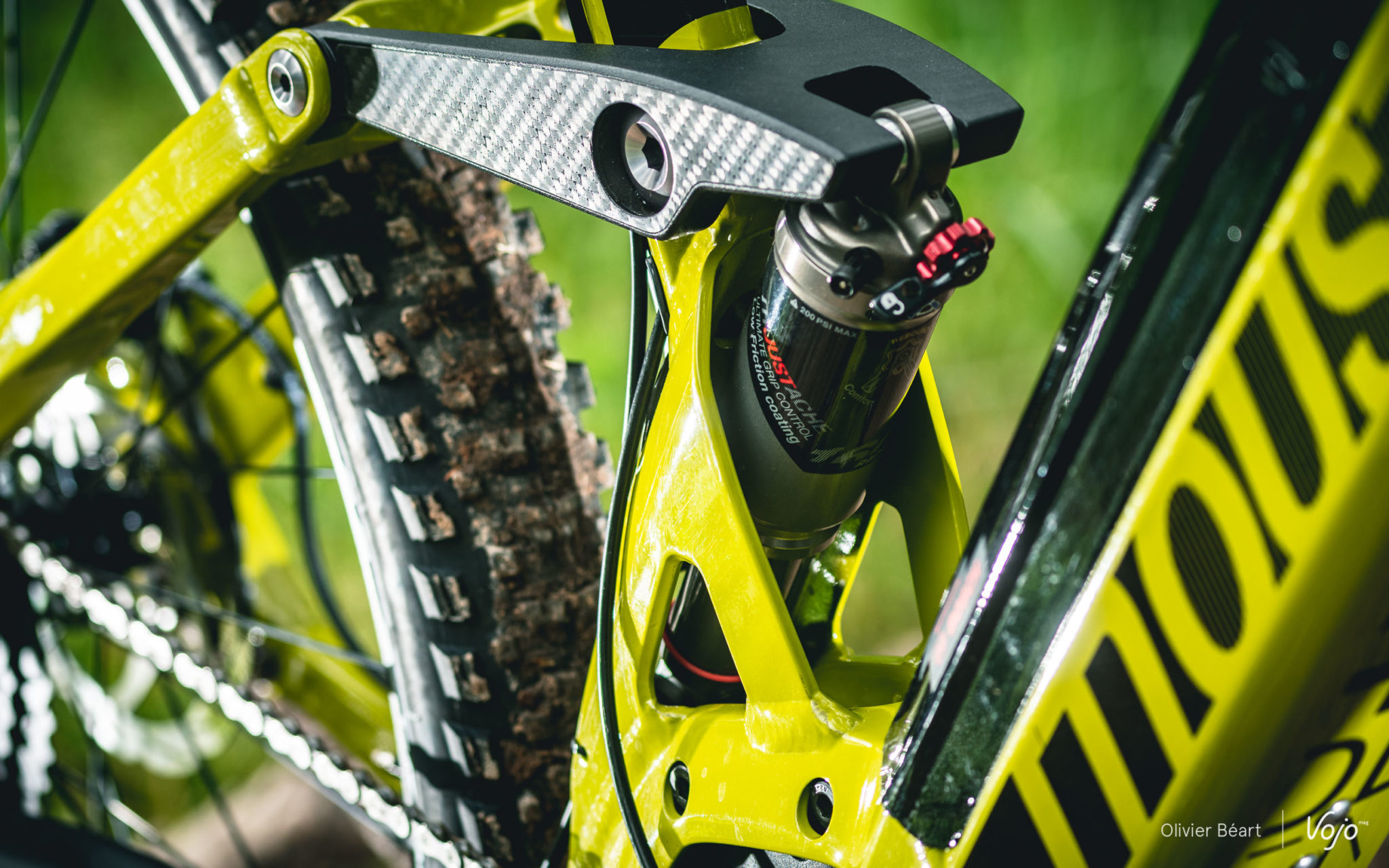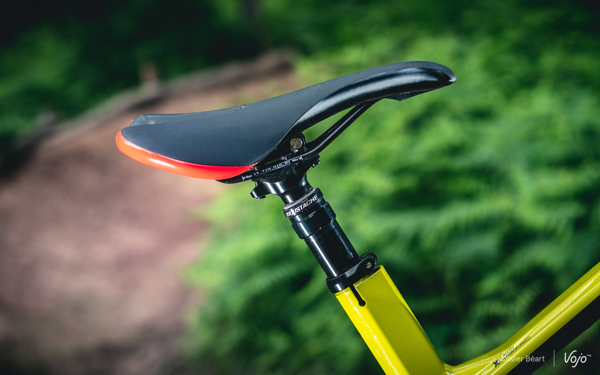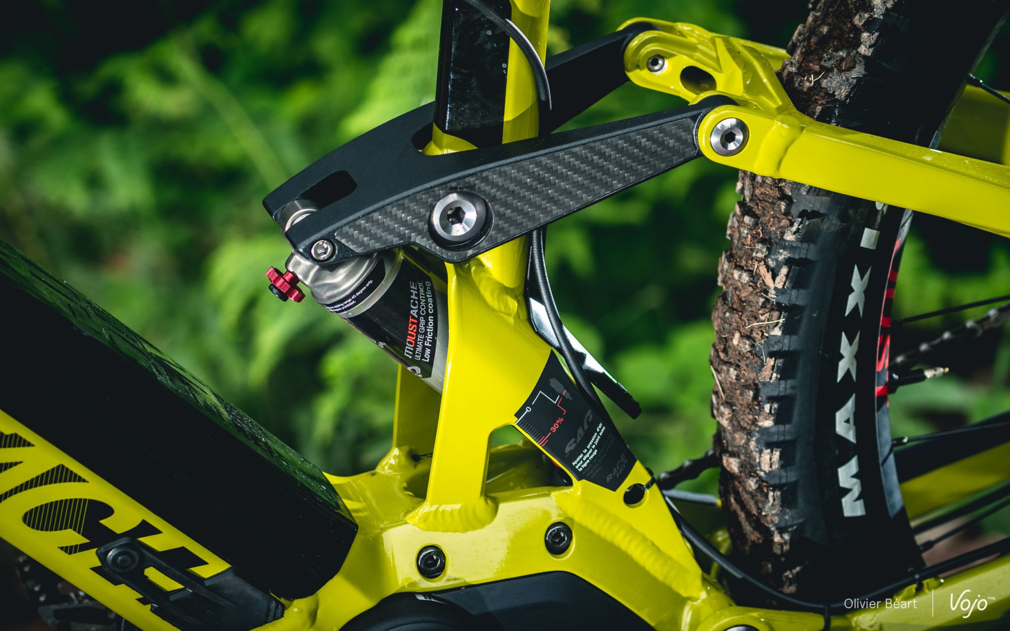 Moustache a aussi poussé le souci du détail jusqu’à développer son propre amortisseur (dimensions 200x57mm). Anodisé avec un revêtement anti-frictions, il n’a absolument pas à rougir face aux réalisations des grandes marques et on sent bien qu’il n’est pas là pour faire des économies de bouts de chandelles ! Il est doté d’un blocage dont on se sert finalement assez peu car même pleinement active, la suspension reste assez neutre au pédalage et on préfère garder le grip en toutes circonstances. Un petit sticker placé sur le cadre permet un réglage simple et efficace du SAG (enfoncement statique optimal de la suspension). Bien vu.