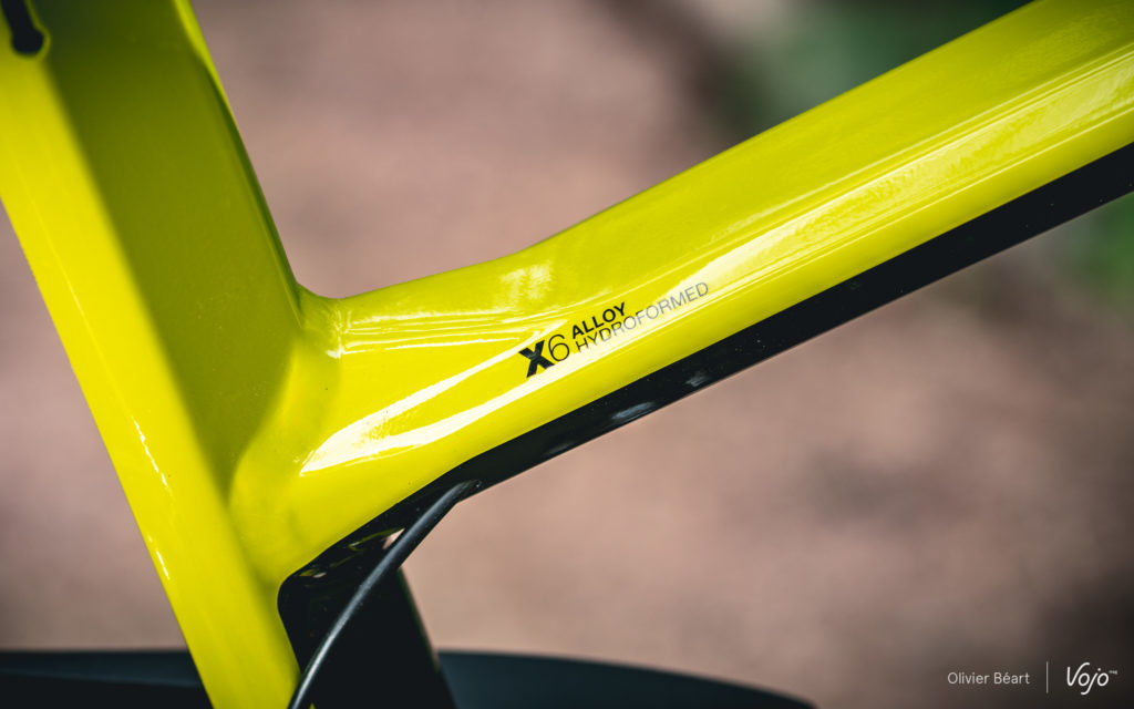 Revenons quand même quelques instants sur les points clés du châssis de ce Moustache Samedi 27 Race 8 millésime 2019. Le cadre est ici en aluminium 6061 hydroformé, dont les lignes gardent une certaine finesse malgré les sections imposantes des tubes, dictées par les impératifs de rigidité liés à la présence du moteur et de la batterie. Les soudures polies sont discrètes, de sorte que de loin on pourrait aisément le prendre pour un carbone. La couleur pistache de notre version d’essai est particulièrement réussie et la finition globale de très haut vol.