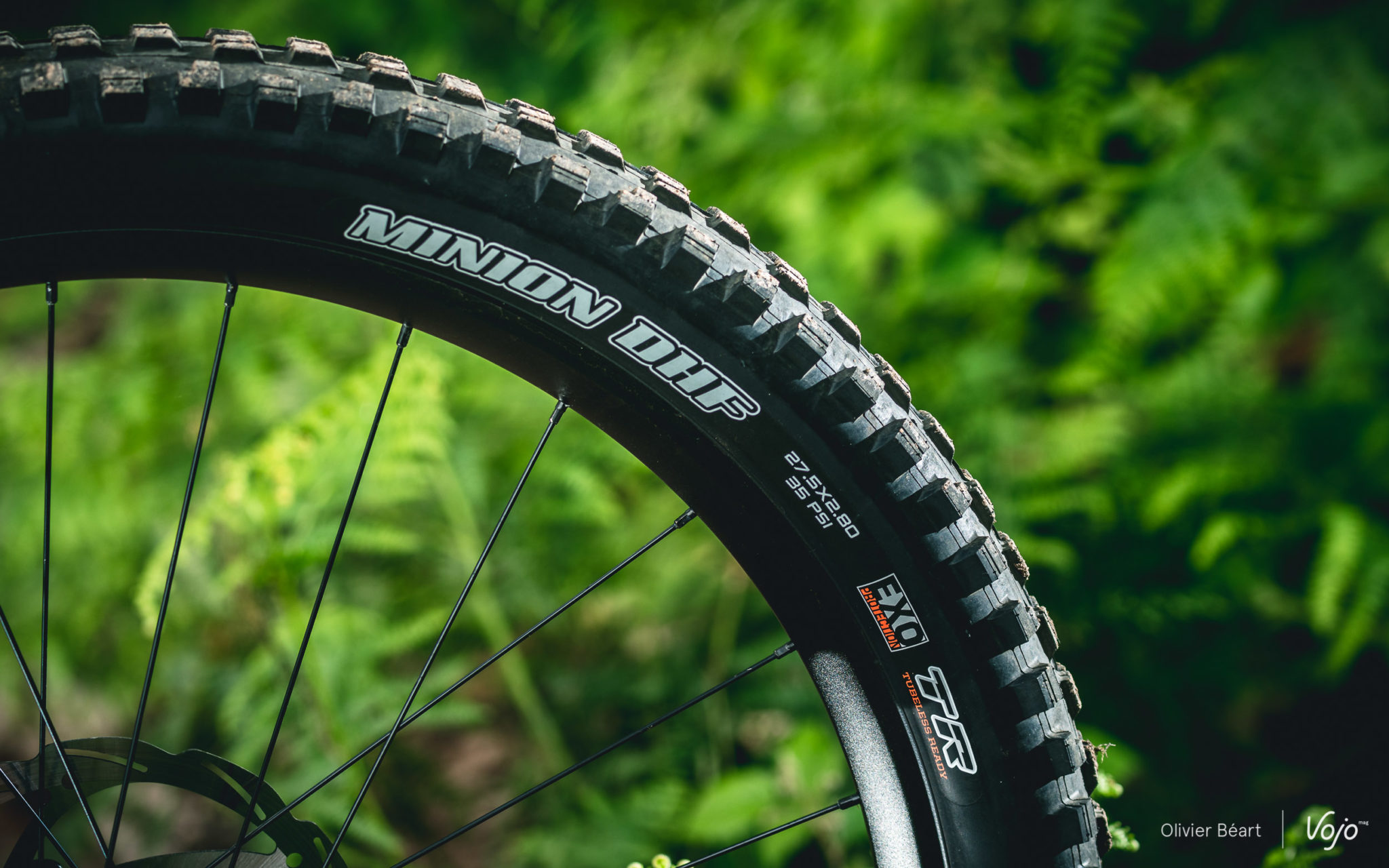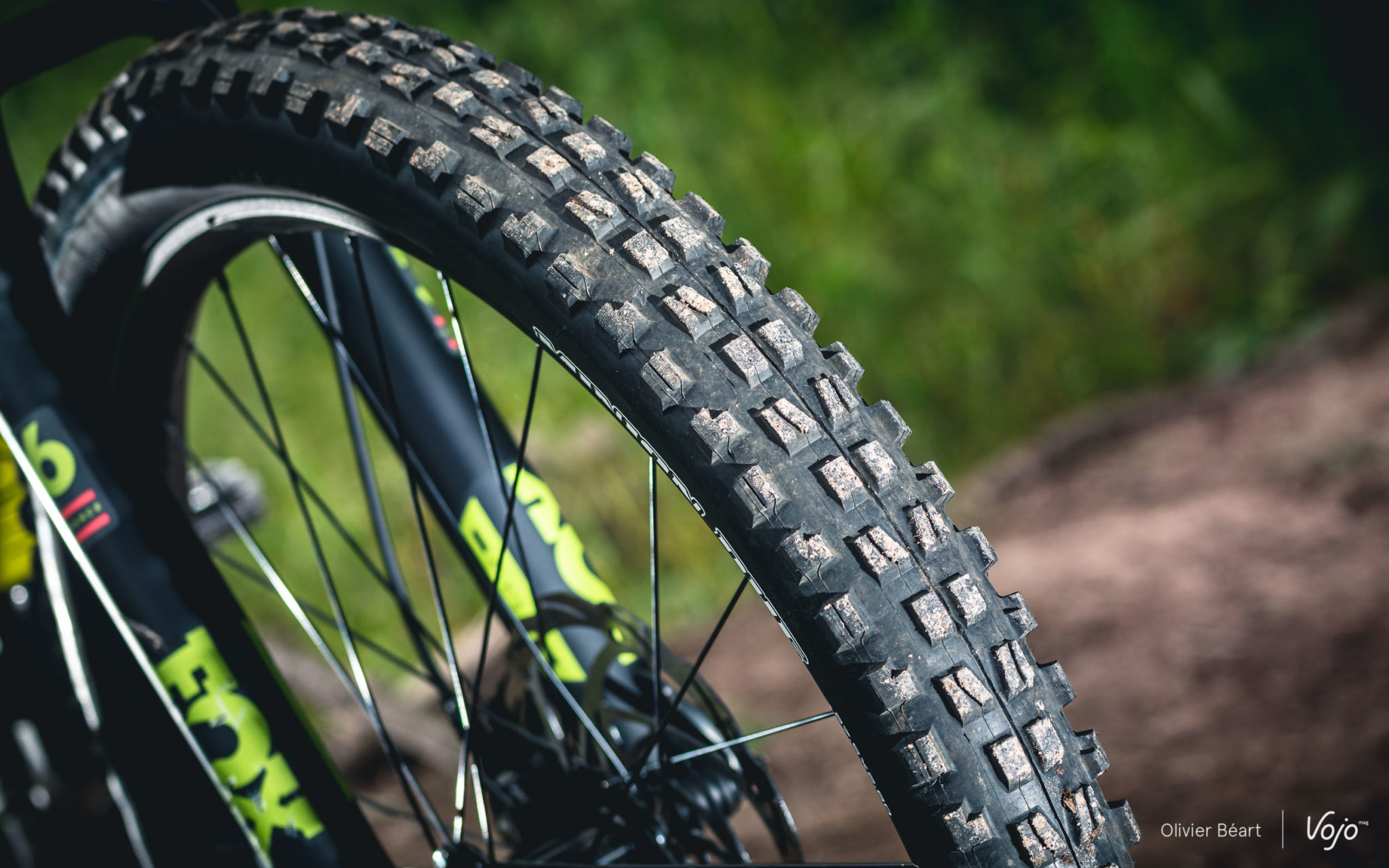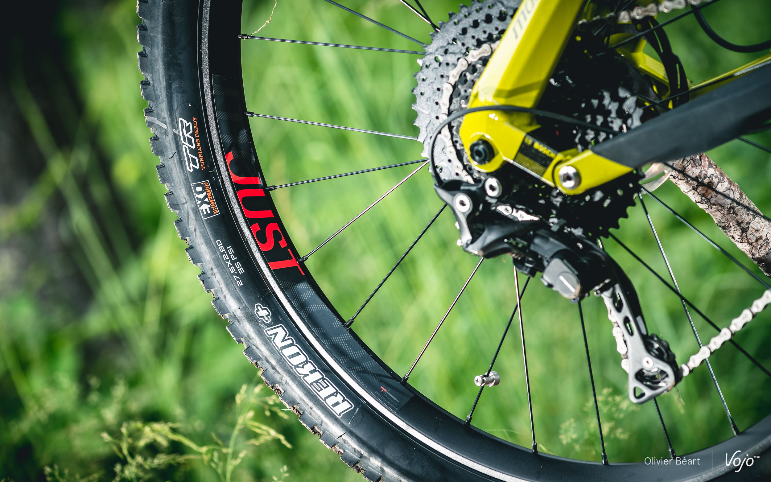 Ces roues sont montées avec des pneus Maxxis en 2.8, avec un Rekon parfaitement à sa place à l’arrière grâce à son bon compromis traction/rendement. Par contre, sur le Race, Moustache place intelligemment un Minion DHF nettement plus directif que le Rekon monté sur les modèles Trail et qui manque selon nous cruellement d’accroche latérale. On peut aussi, si on le souhaite, monter une roue de 29″ avec un pneu plus fin (2.5 par exemple) à l’avant pour gagner encore en précision.