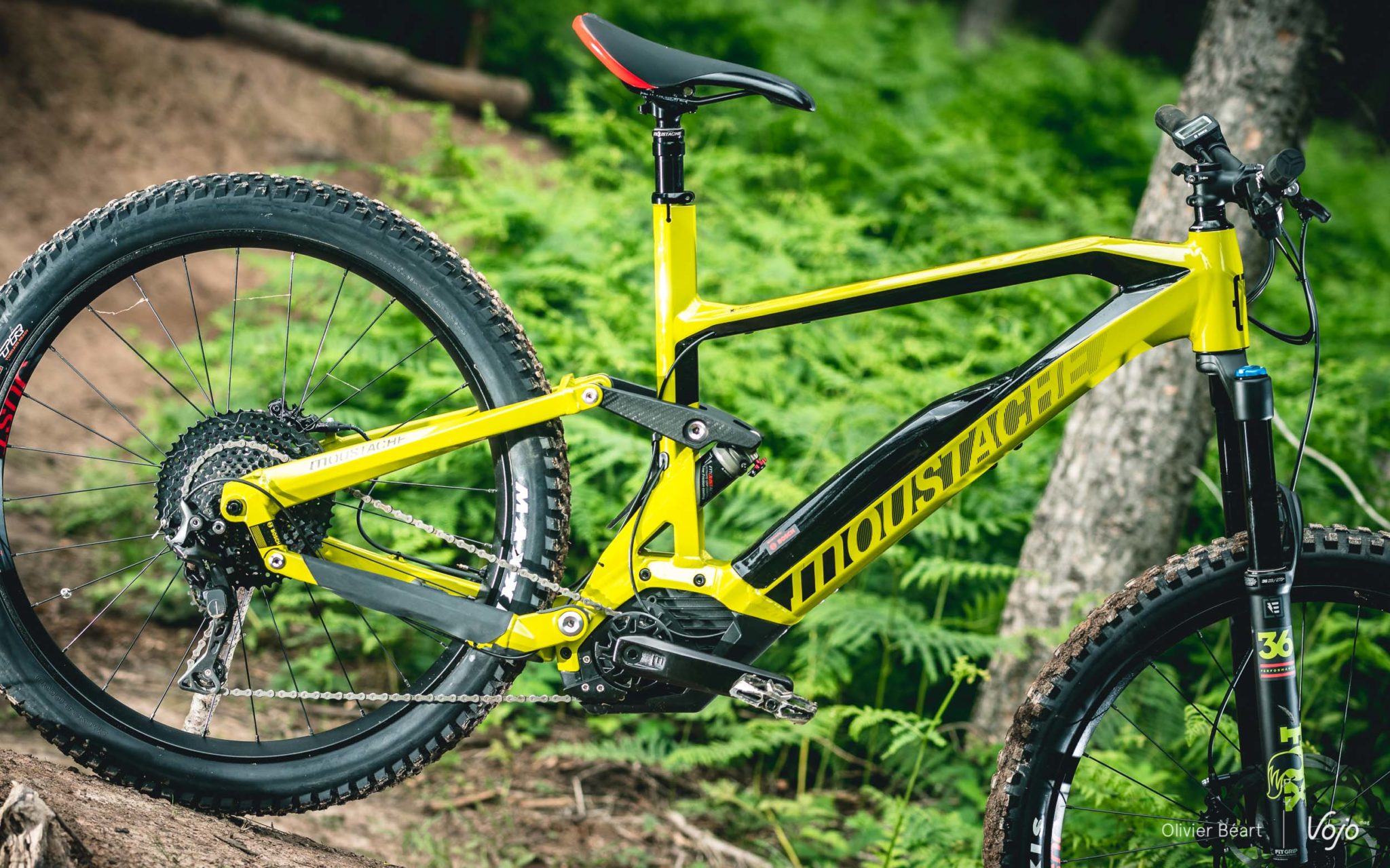 En pilotage agressif, on peut sentir que son cadre est un peu souple malgré tous les efforts déployés par Moustache. Mais rien de dramatique et cela peut aussi être un atout sur terrain défoncé, où le vélo ne donne pas l’impression de trembler et permet de bien garder ses lignes. Les pneus montrent aussi leurs limites dans les gros appuis et les plus fins pilotes apprécieront certainement de tester le montage d’une roue de 29″ à l’avant, comme on le voit sur de plus en plus d’ebikes, de vélos d’enduro et de DH. La fourche est bien à sa place sur ce Race 8, et l’amortisseur impressionne pour un « petit modèle » qu’on imagine plutôt à la base sur un vélo de cross que sur un ebike de 23kg. Mais il s’en sort bien, même si parfois on peut en voir les limites sur de longues spéciales d’enduro et certains gros impacts où la suspension donne l’impression d’être un peu trop linéaire et de rentrer trop vite dans le débattement.
