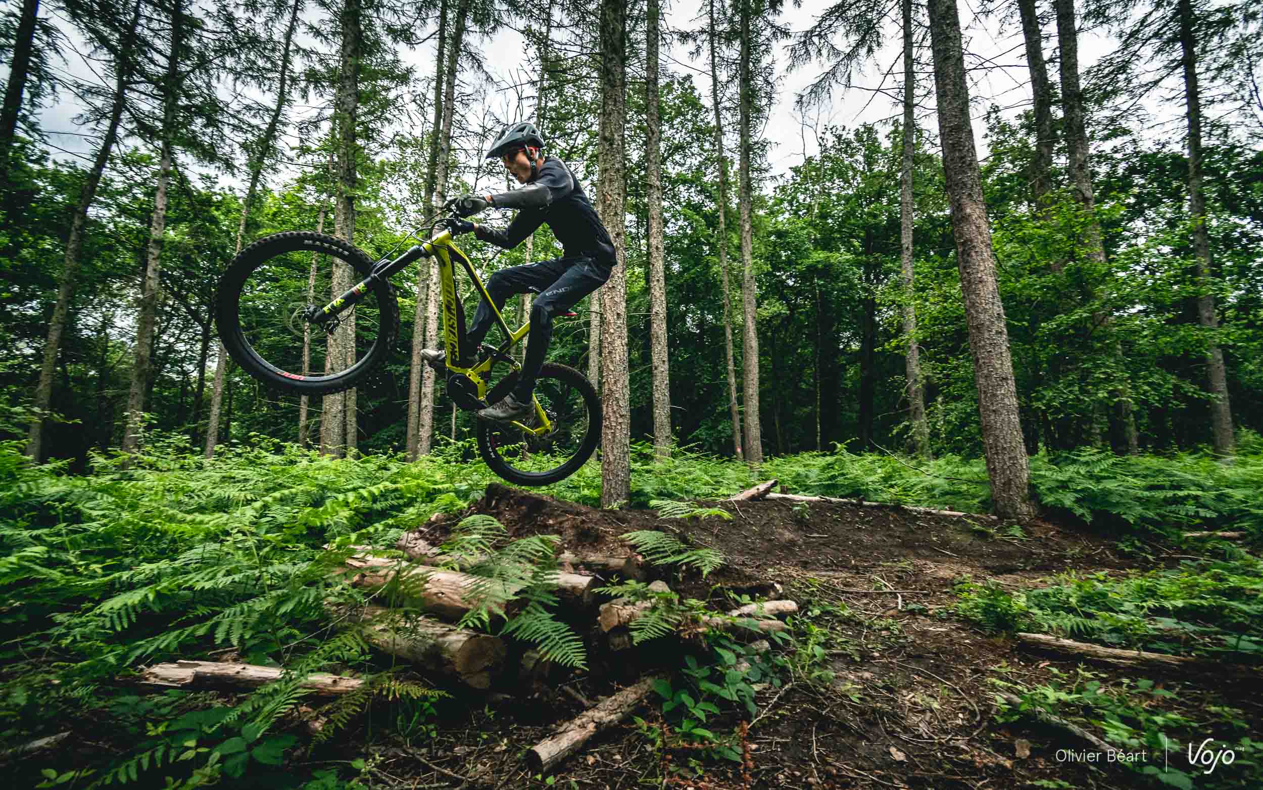 Ce n’est pas un DH, mais il accepte aussi sans souci qu’on l’emmène jumper ! Là, l’équilibre parfait des masses est un énorme atout par rapport à des ebikes trop chargés de l’avant à cause d’une batterie qui remonte bien trop haut dans le tube diagonal. Ici, rien de tout cela, le vélo se pilote (presque) comme un gros bike d’enduro et il met d’emblée vraiment en confiance… ce qui permet d’ouvrir les gaz et de s’amuser comme un petit fou.