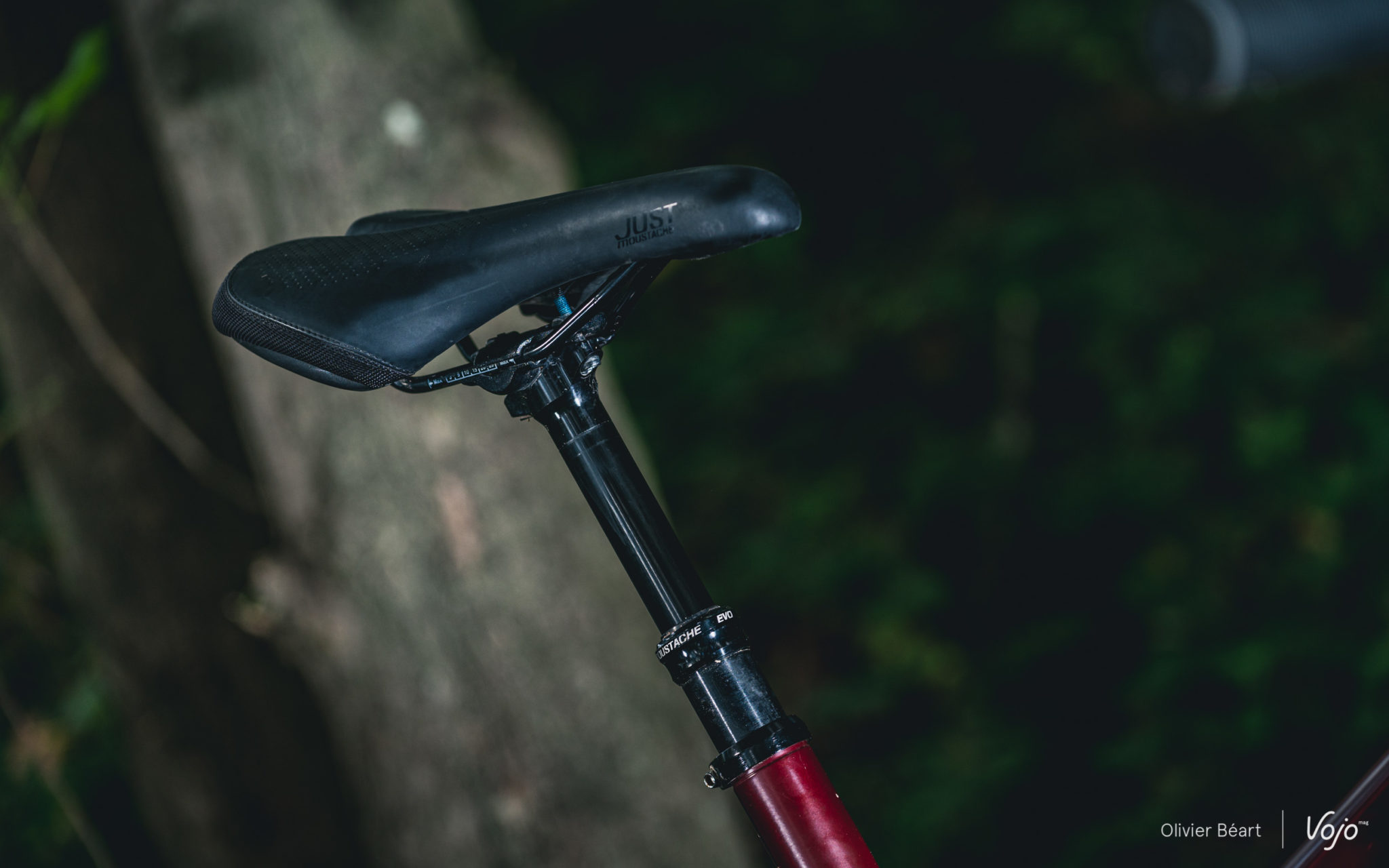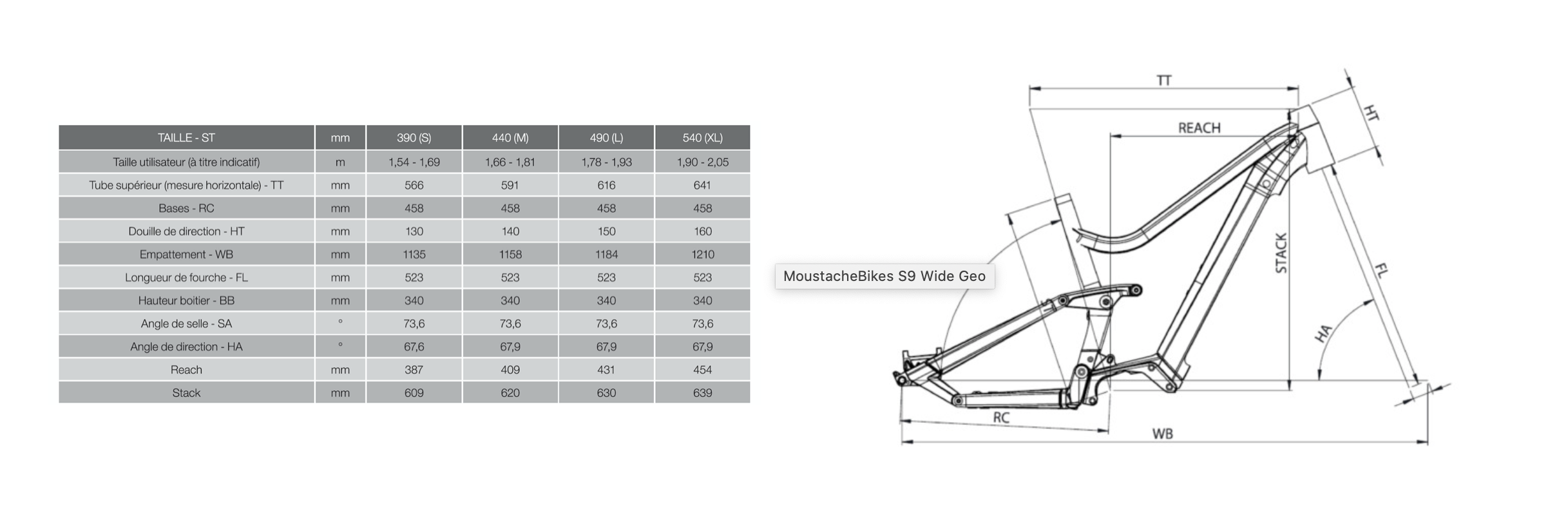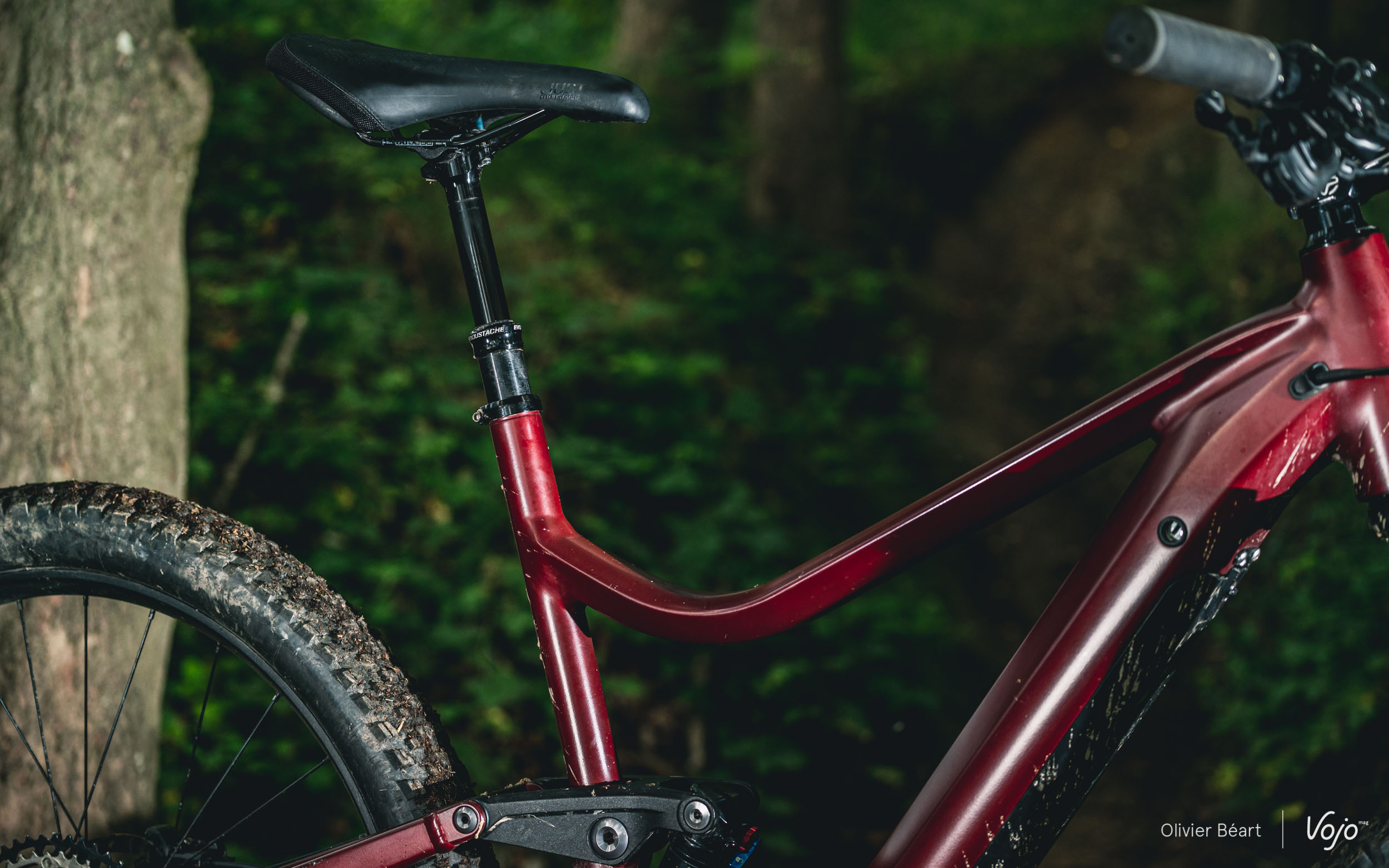 Même si nous validons totalement les grandes lignes choisies par Moustache au niveau de la géométrie, nous avons tout de même une réserve au niveau de la hauteur du tube de selle. Vu que le vélo est très court, si on a un buste un peu long, on peut vite se retrouver à devoir passer sur la taille supérieure. Ainsi, pour cet essai, et pour des pilotes mesurant entre 176 et 181cm, nous sommes d’office partis sur la taille L ; le M étant vraiment fort court. Mais nous avons constaté que quasi tous nos testeurs rentraient leur tige de selle télescopique quasi au maximum dans le cadre. Et c’est très rare, pour ne pas dire exceptionnel, que cela nous arrive sur des vélos de test. Moustache gagnerait à simplement couper son tube de selle plus court sur sa gamme Wide (ce souci se rencontrera beaucoup moins sur les Trail et Game qui ont un rapport longueur/hauteur différent) afin de ne pas mettre dans l’embarras les bikers n’ayant pas spécialement de grandes jambes. D’autant que le débattement de la tige de selle télescopique augmente avec la taille (100mm en S, 120mm en M, 150 en L)