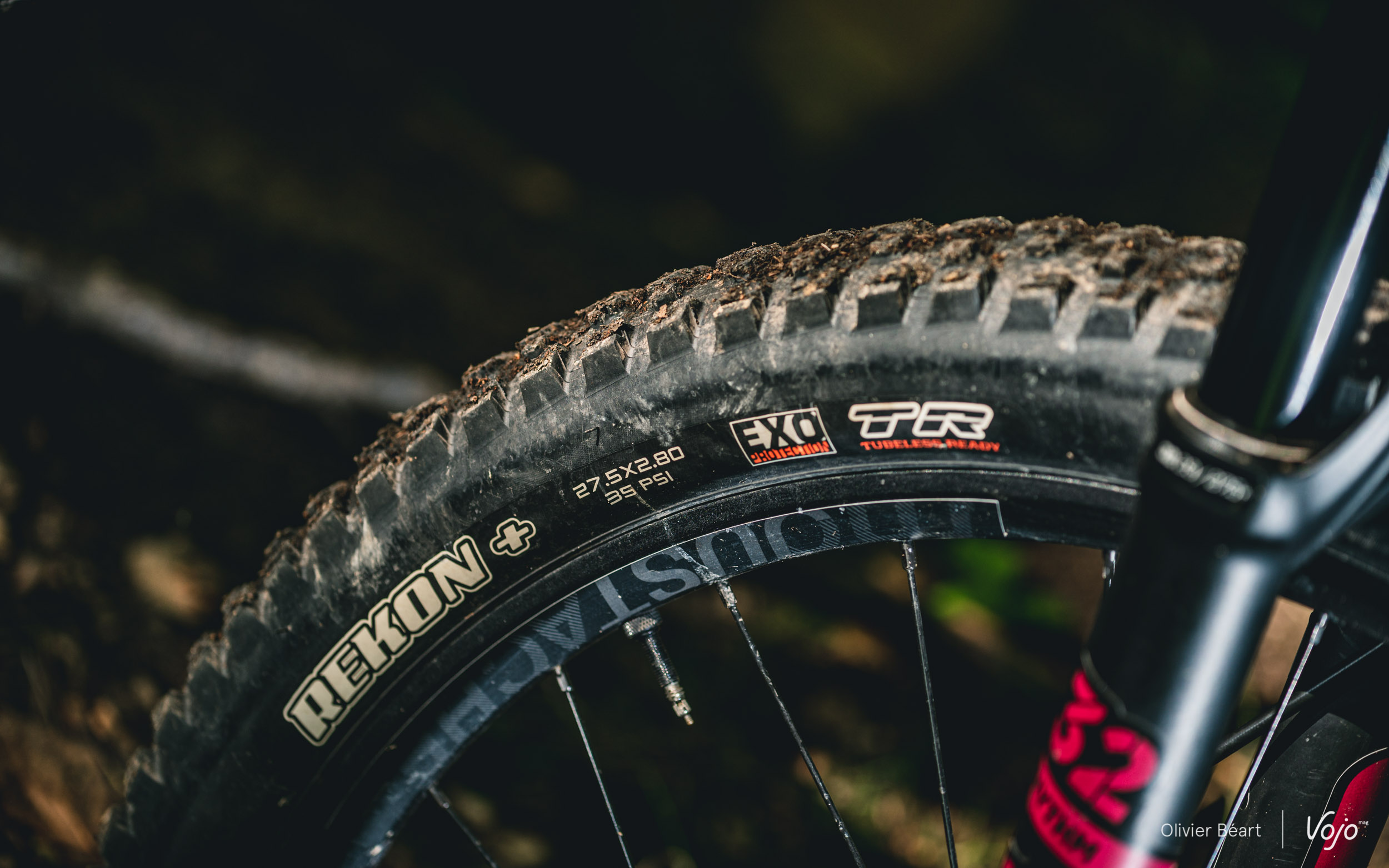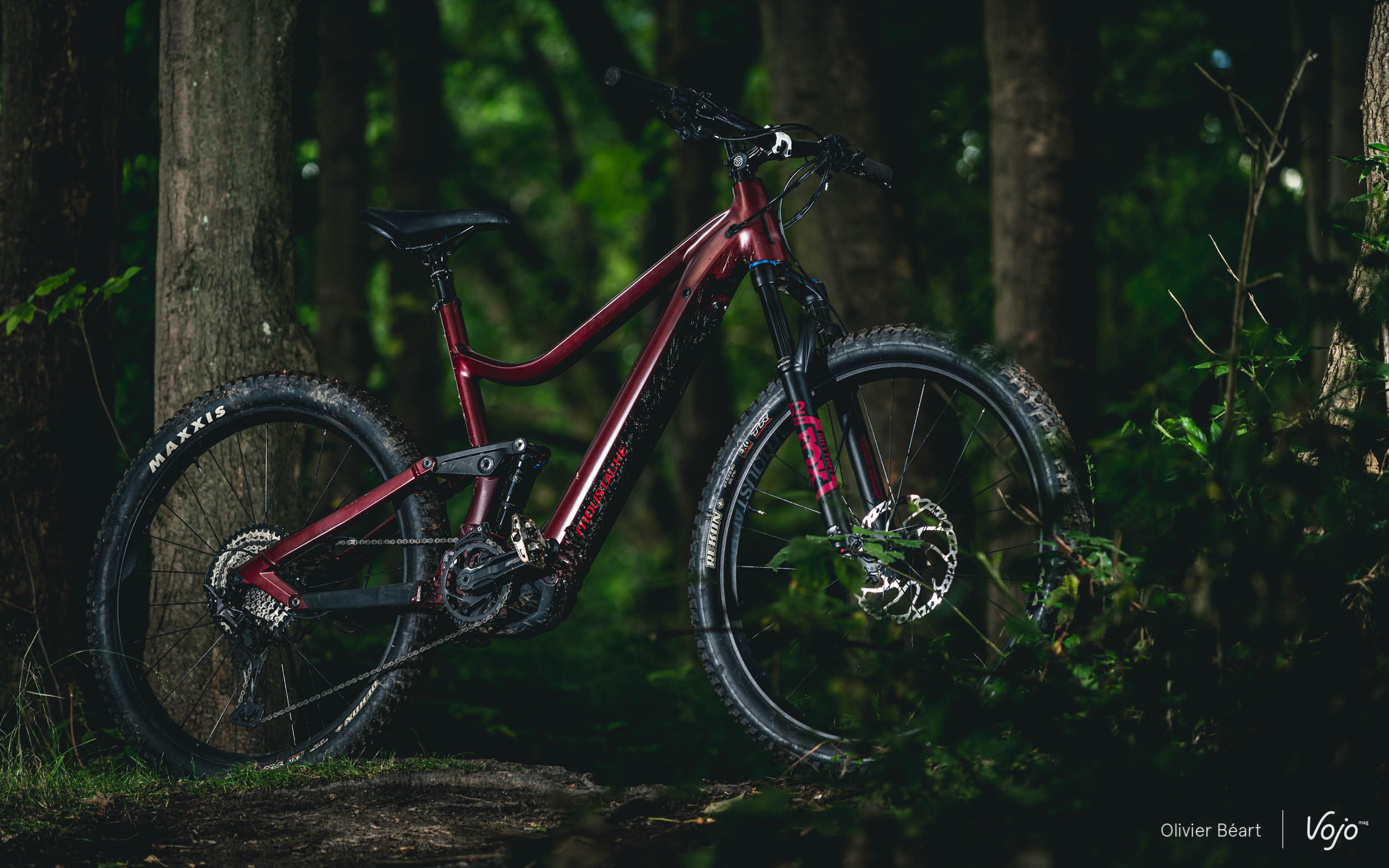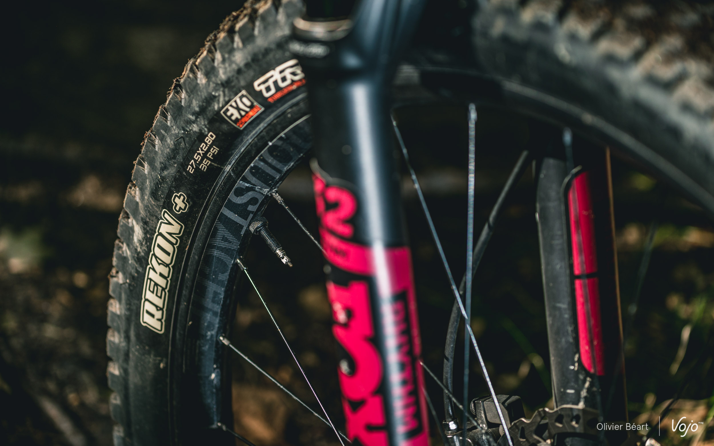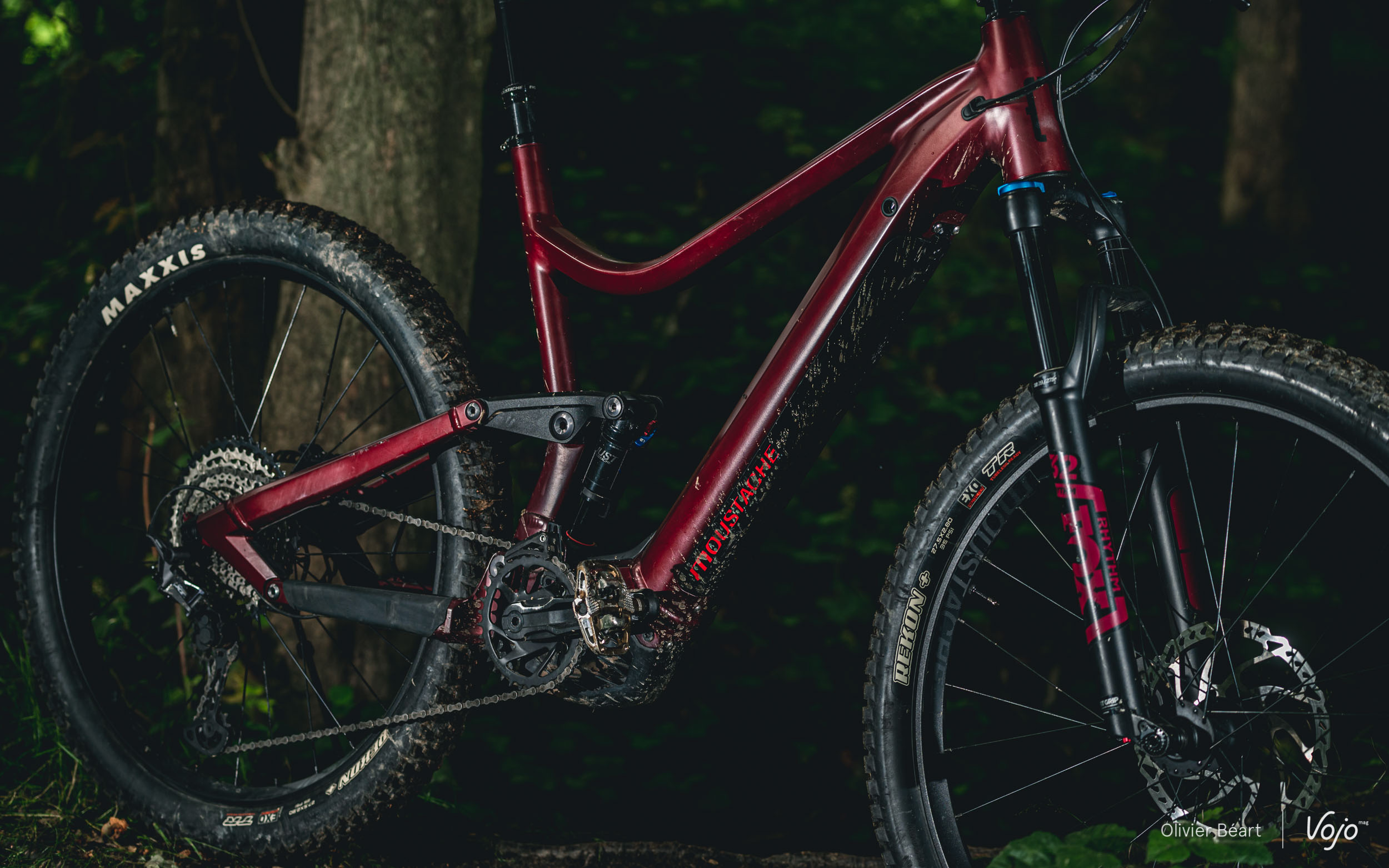 Au niveau des pneus, Moustache a fait le choix du format « Plus », avec des Maxxis Rekon en 27,5*2.8. Ce format colle bien à l’usage a priori paisible auquel le Wide se destine, car de gros pneus vont pardonner plus et offrir davantage de confort ainsi que de grip et de confiance à allure paisible. On ne verra leur limites que si on commence à forcer plus dans les appuis. Un bémol tout de même sur le choix de pneus : nous l’avons déjà écrit à plusieurs reprises, si le Rekon est selon nous un des meilleurs dessins pour l’arrière, en montage avant, il manque cruellement de grip latéral dès que le sol devient humide ou boueux. Sans aller vers des modèles d’enduro, un pneu avant avec plus d’accroche latérale serait bienvenu.