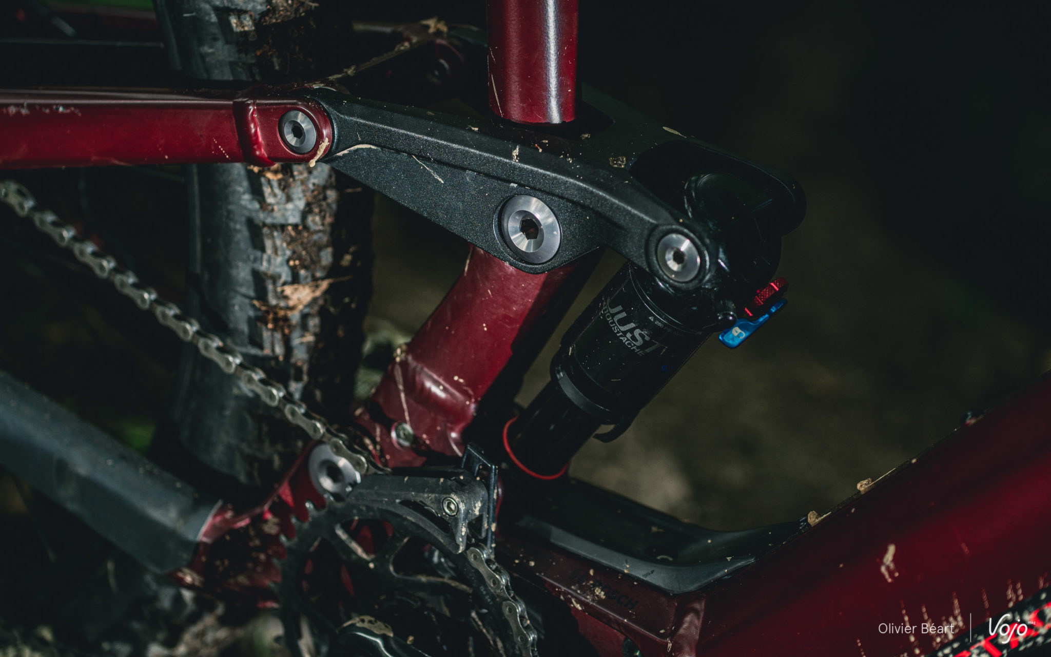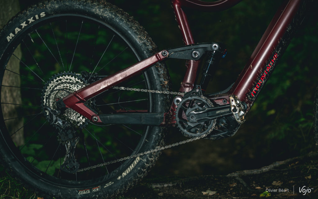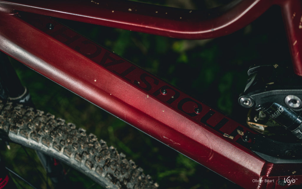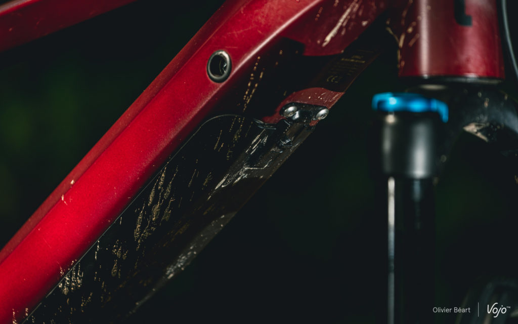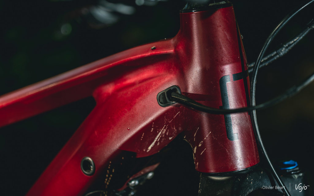 C’est un exemple parmi d’autres qui montre que c’est plus dans les détails de cette dernière génération de cadres qu’on va désormais retrouver la « patte » de la marque vosgienne, connue pour soigner la finition et pour apporter de petites touches discrètes qui, au final, font la différence. En plus de cette histoire de cache-batterie, on pense aussi aux formes des tubes, très travaillées et optimisées pour offrir une rigidité cohérente au châssis, ou encore aux points de pivot dont la visserie est particulièrement qualitative, sans oublier les passage de gaines et Durit simples et directs, qui ne font aucun bruit quand on roule et qui s’avèrent faciles à atteindre en cas de besoin, ce qui est loin d’être toujours le cas sur les e-bikes.