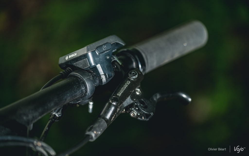 Enfin, comme pour les roues et l’amortisseur, on retrouve aussi des composants signés Moustache pour le poste de pilotage (très agréable), la tige de selle télescopique (parfaitement fonctionnelle) ou encore la selle (qui nous a par contre déçus car trop large et pas vraiment confortable malgré son imposant rembourrage). A noter aussi que, sur le poste de pilotage, on ne trouve pas le display et la nouvelle commande Kiox, mais le simple Purion. Sous des aspects bruts, ce poste de commande de la motorisation est finalement assez agréable sur le terrain, même si les information qu’il offre sont sommaires.