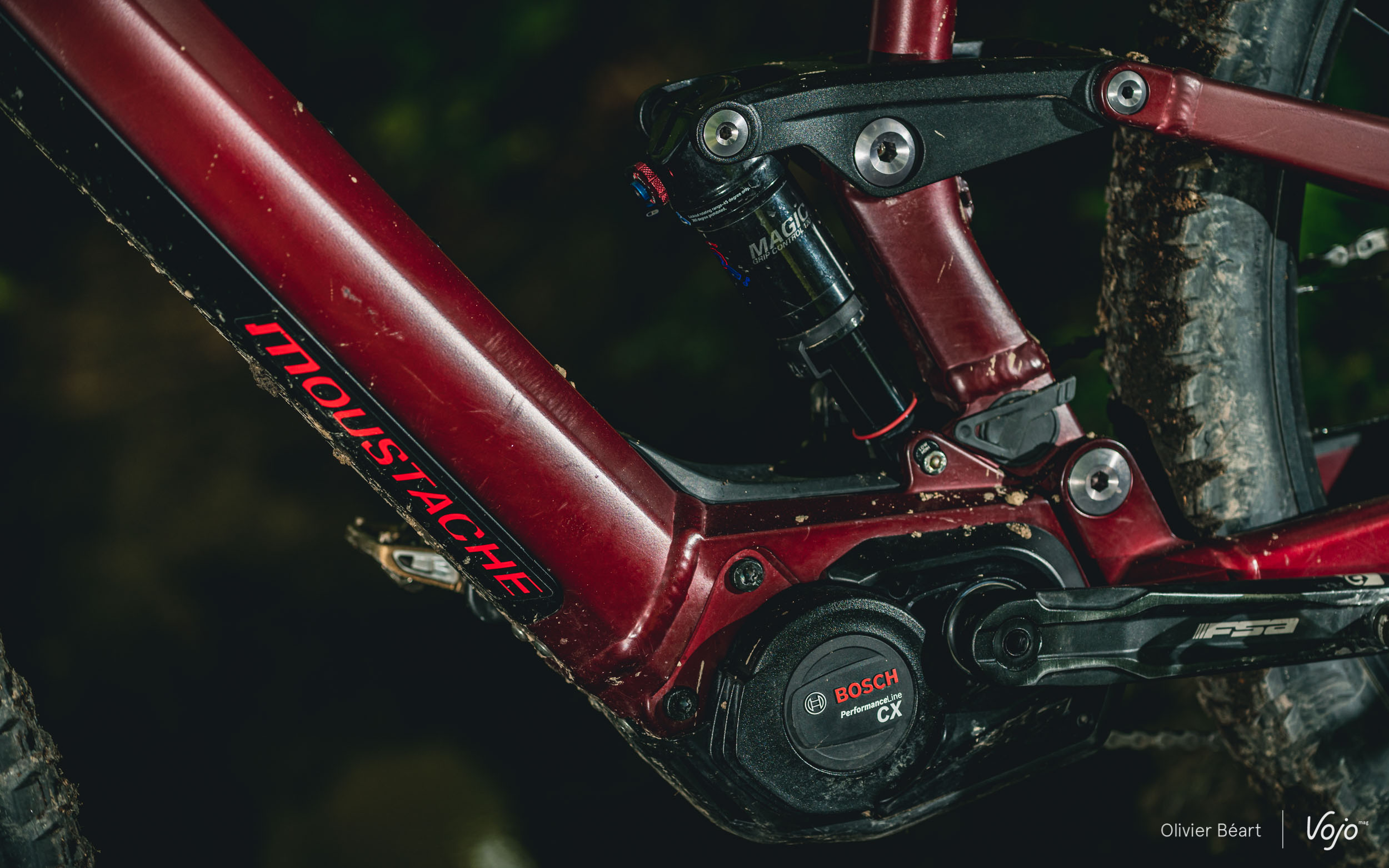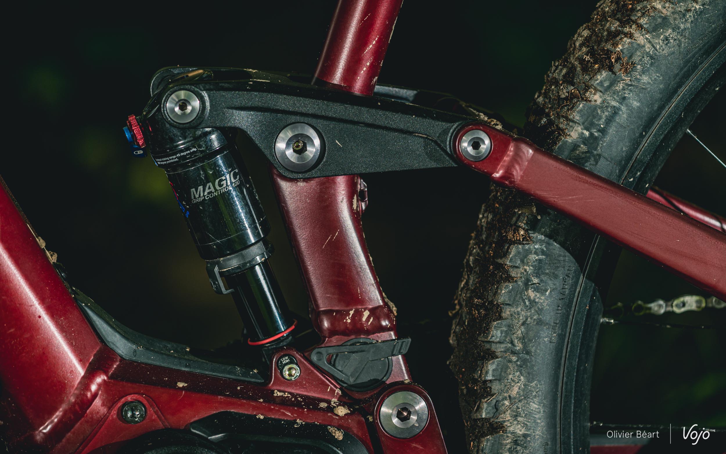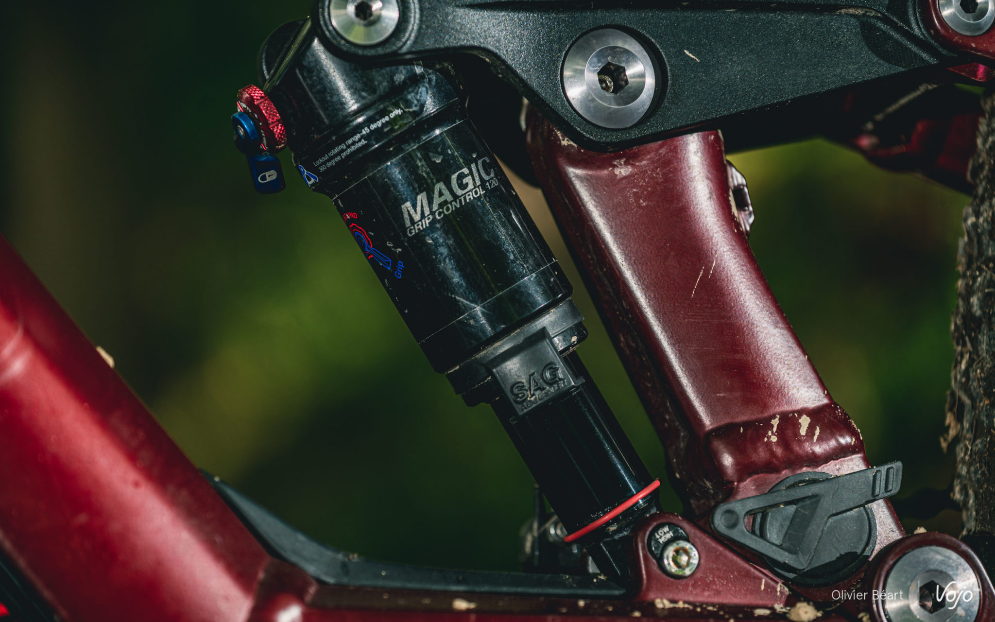 Moustache a poussé la logique encore un cran plus loin, en concevant aussi sont propre amortisseur baptisé « Magic Grip ». Il a été développé dans l’optique d’une utilisation dédiée uniquement au vélo électrique et à cette cinématique, contrairement aux amortisseurs de grandes marques qui sont censés convenir, moyennant quelques adaptations internes, à énormément de vélos différents. L’idée ici est d’avoir quelque chose de sensible, réactif, et qui offre beaucoup de grip ; une caractéristique importante pour un e-bike. On remarque aussi qu’on a un petit indicateur de SAG intégré qui aide bien lors des réglages.