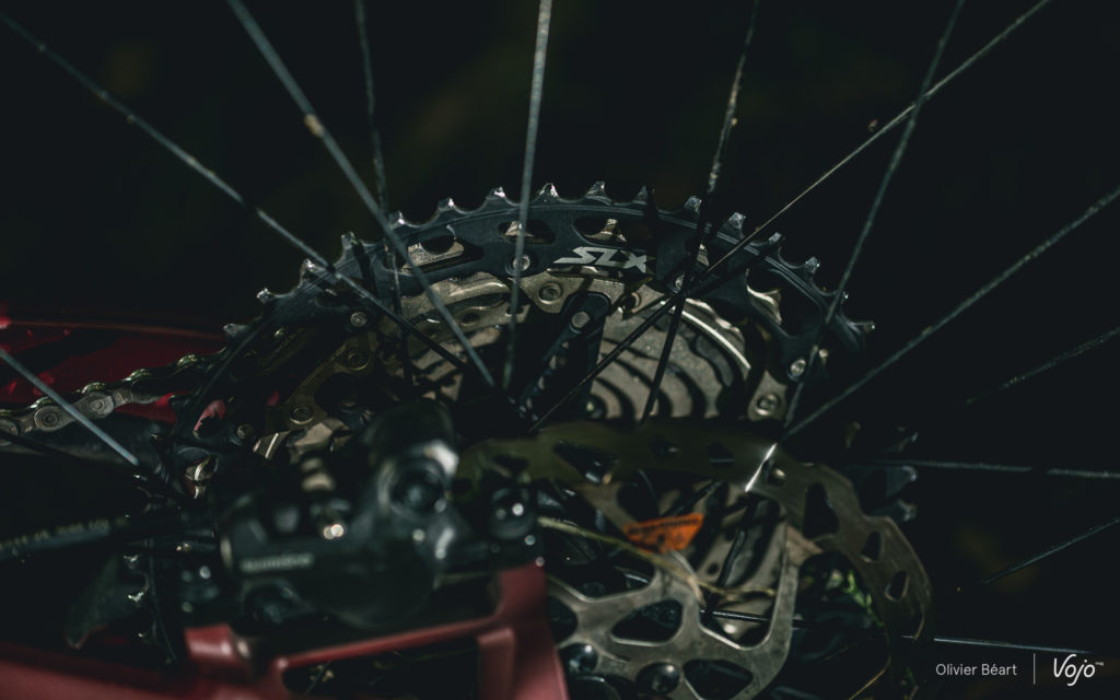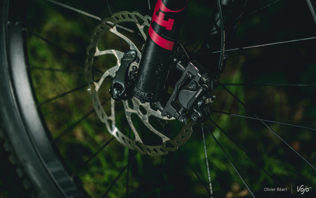 Les freins sont aussi signés Shimano, avec la série MT500, située un peu en dessous du SLX. Ils n’ont que 2 pistons, mais ils offrent une belle constance, de la progressivité, un bon dosage, et une puissance plus que suffisante pour les situations courantes… et même plus, grâce aux disques en 203mm à l’avant et 180mm à l’arrière.