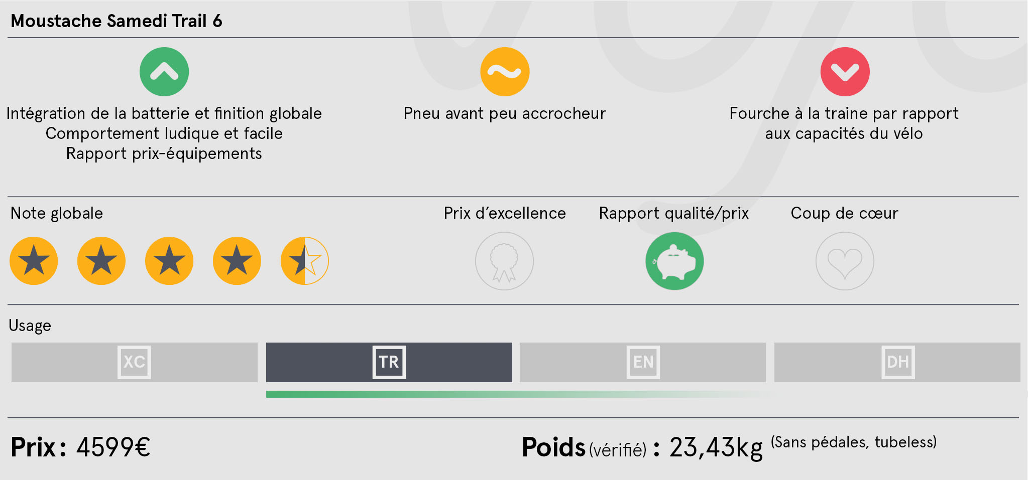 Le Moustache Samedi Trail 6 est le modèle intermédiaire de la gamme aluminium, après le Trail 4 (fourche moins évoluée, transmission et freins plus basiques) et avant le Trail 8 doté de meilleures suspensions, freins et transmission. Les tarifs vont de 4099€ à 5299€. On peut aussi avoir le Trail 7 qui est en fait simplement la version cadre carbone du Trail 6. Il coûte 5699€.