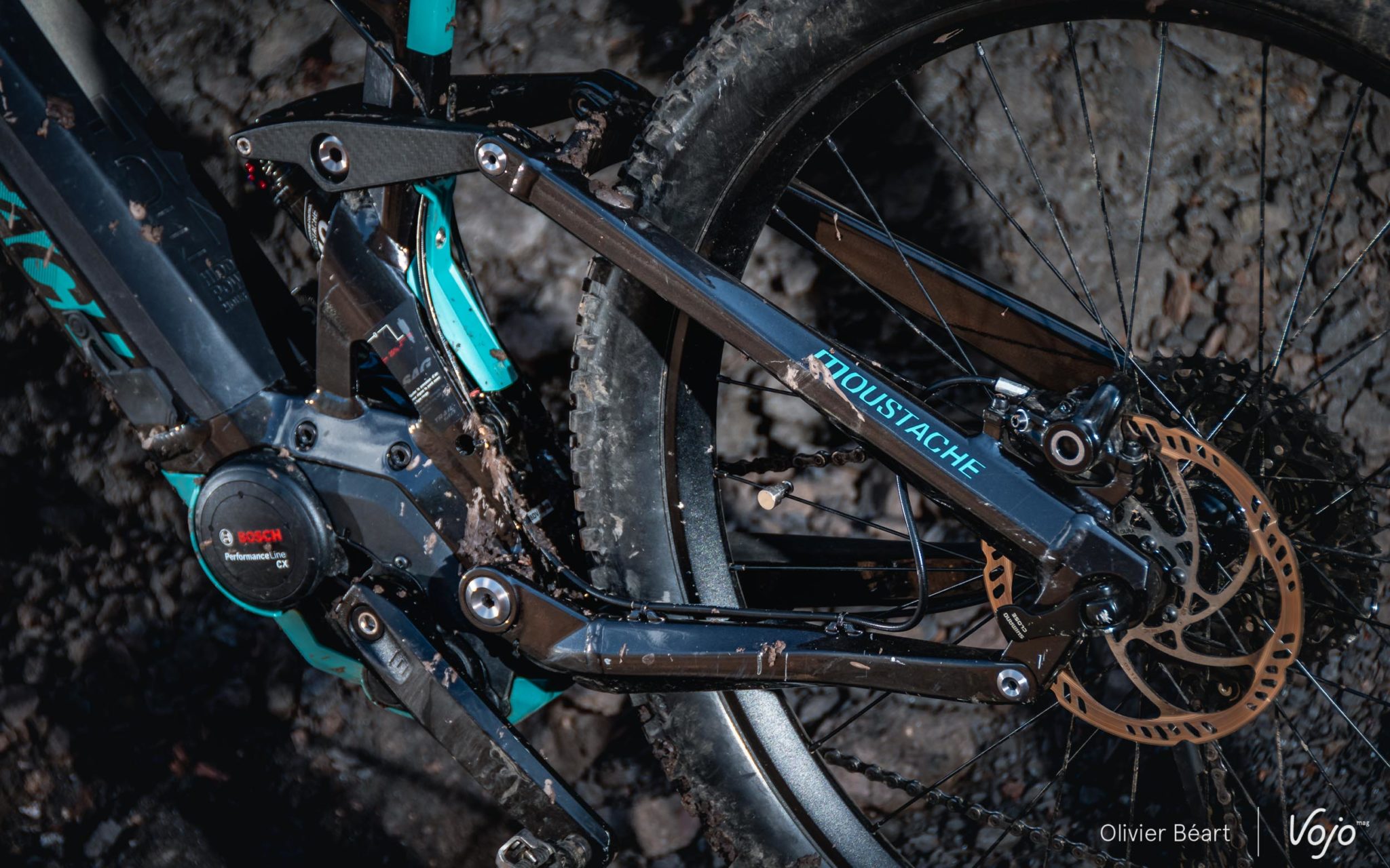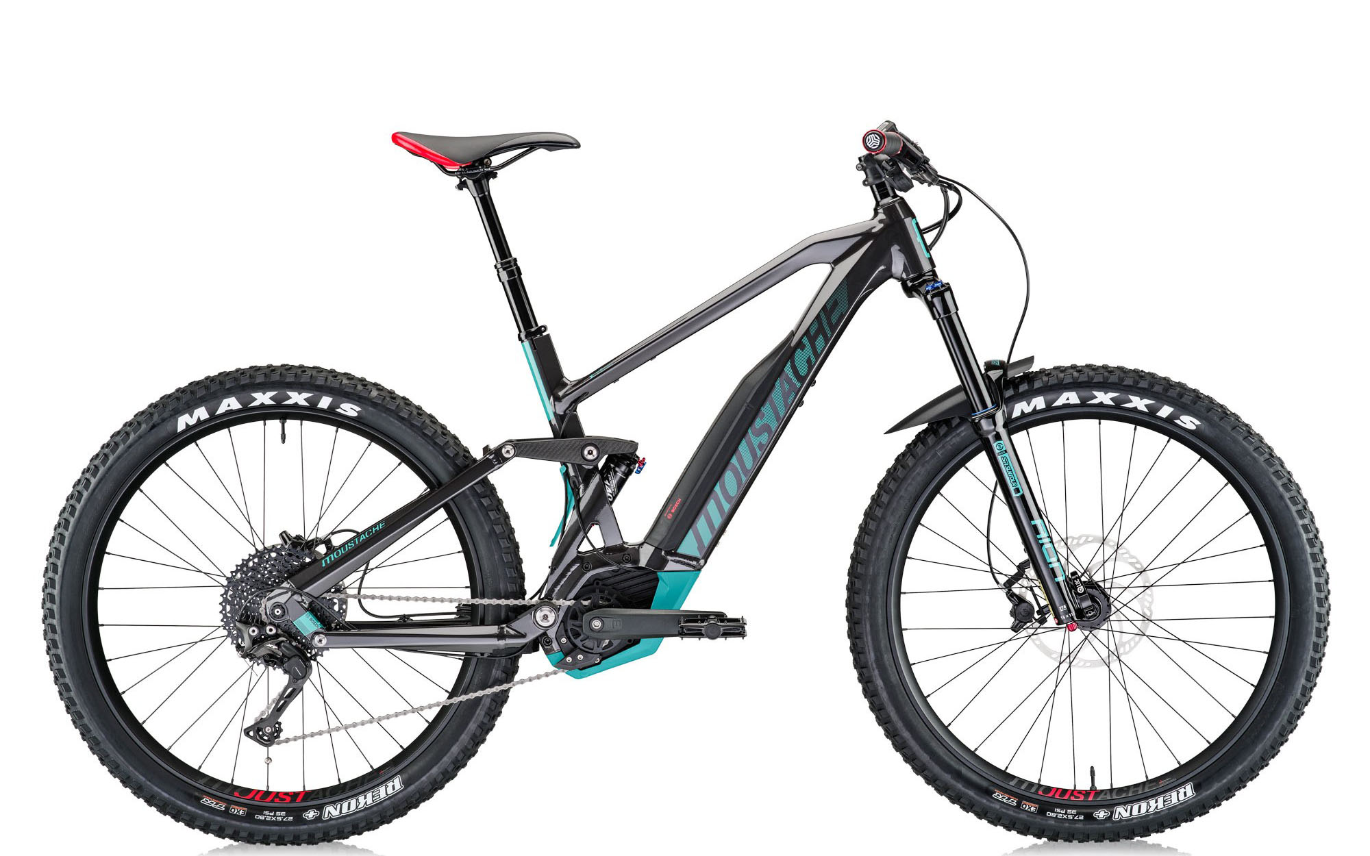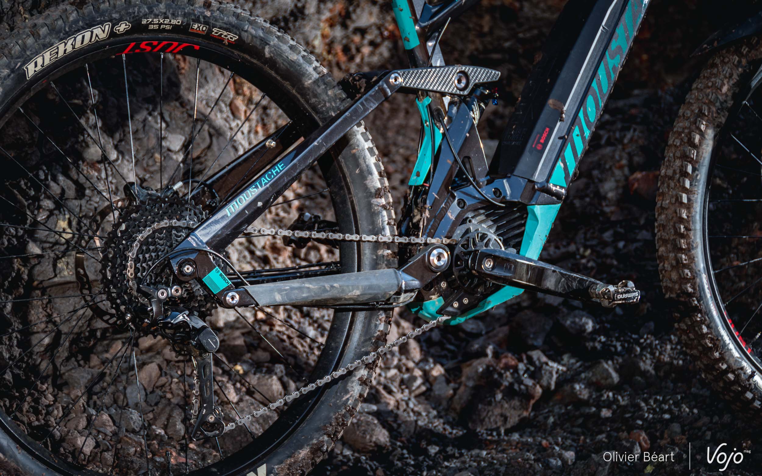 On trouve la cinématique employée par Moustache depuis ses débuts, à savoir un four bar linkage assez classique, mais qui a été raffiné au fil des millésimes (ou « saisons » comme on dit chez Moustache) afin de s’adapter au mieux à l’évolution des pratiques en VAE. Sensible en début de course, plus progressive ensuite, elle offre 140mm de débattement avec un amortisseur maison qui nous a déjà prouvé qu’il n’avait rien d’un choix au rabais.