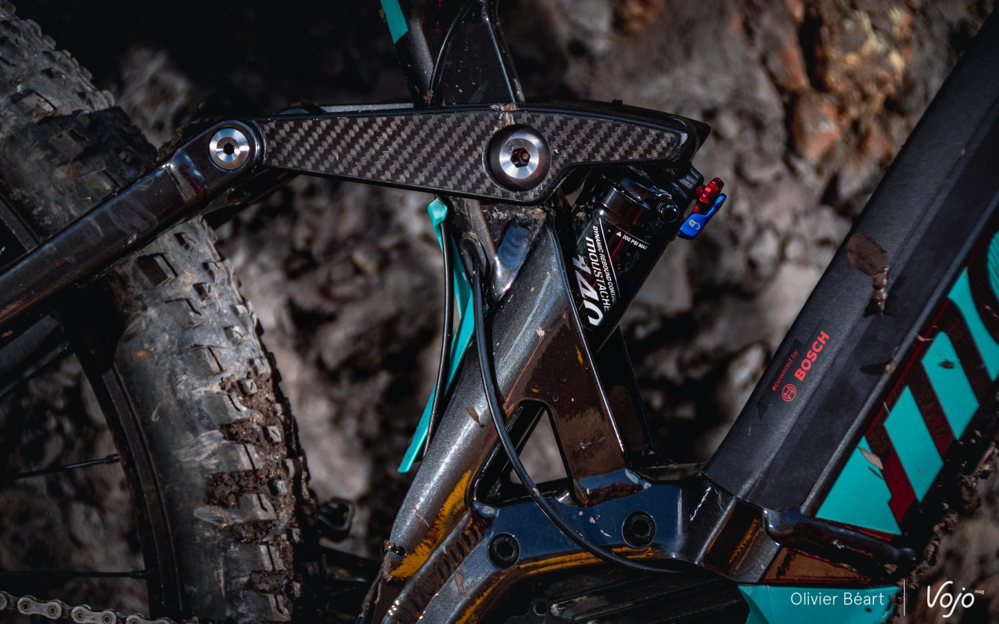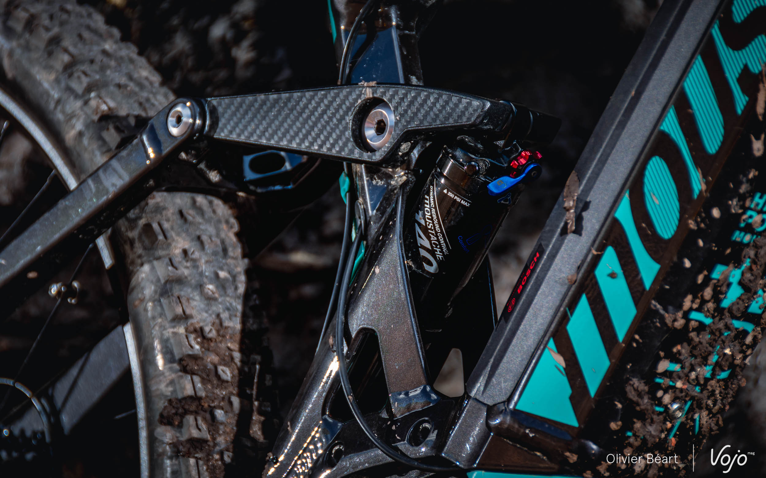 On le sait, Moustache est attentif aux détails et, outre l’intégration de la batterie, même si on est sur un vélo « entrée de gamme » dans son segment, la finition est superbe, que ce soit au niveau des soudures ou des points de pivot de la suspension dont la taille et le positionnement respirent la solidité. Le travail des tubes est aussi superbe, avec des sections qui restent épurées à l’œil mais qui sont en réalité très complexes pour garantir un excellent niveau de rigidité. Sans oublier le petit détail en carbone sur les biellettes de suspension, ou encore la petite protection d’amortisseur et l’indicateur de SAG pour régler facilement sa suspension correctement.