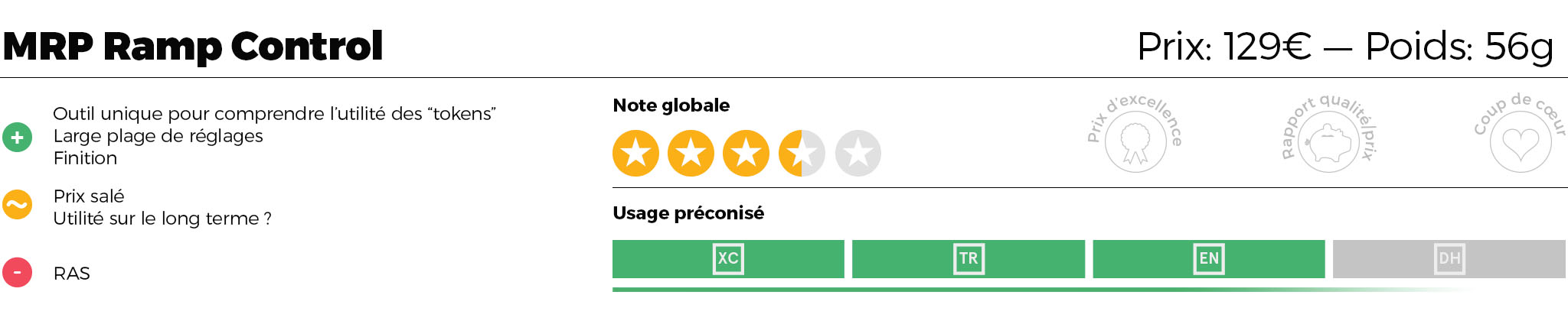 Si nous avons beaucoup apprécié la possibilité d’expérimenter différents réglages au début et si nous reconnaissons l’efficacité du système MRP Ramp Control, nous avons vite trouvé notre bonheur avec un setup optimal et nous n’en avons plus vraiment changé par la suite. L’utilité de cette cartouche est bien réelle, mais finalement assez limitée dans le temps et vu le prix de cette petite chose (que nous ne remettons pas en cause car il s’agit de fine mécanique à l’intérieur), il faut voir si l’investissement en vaut la peine. Nous le voyons plus comme un outil que tout bon magasin devrait avoir afin de pouvoir le prêter à ses clients et les aider à trouver le réglage optimal… tout en revenant ensuite à un setup équivalent en tokens plus classiques et moins chers (gratuits même puisqu’ils sont fournis avec les fourches). Le souci va alors d’être capable de traduire le nombre de clics effectués sur le Ramp Control en nombre de spacers à mettre dans la chambre d’air et on pourrait espérer que MRP donne ce type d’indication. Bref, même si nous reconnaissons l’efficacité du système et sa pertinence pour aider à affiner les réglages d’une fourche haut de gamme, son prix et son utilité limitée dans le temps tempèrent un peu notre enthousiasme.