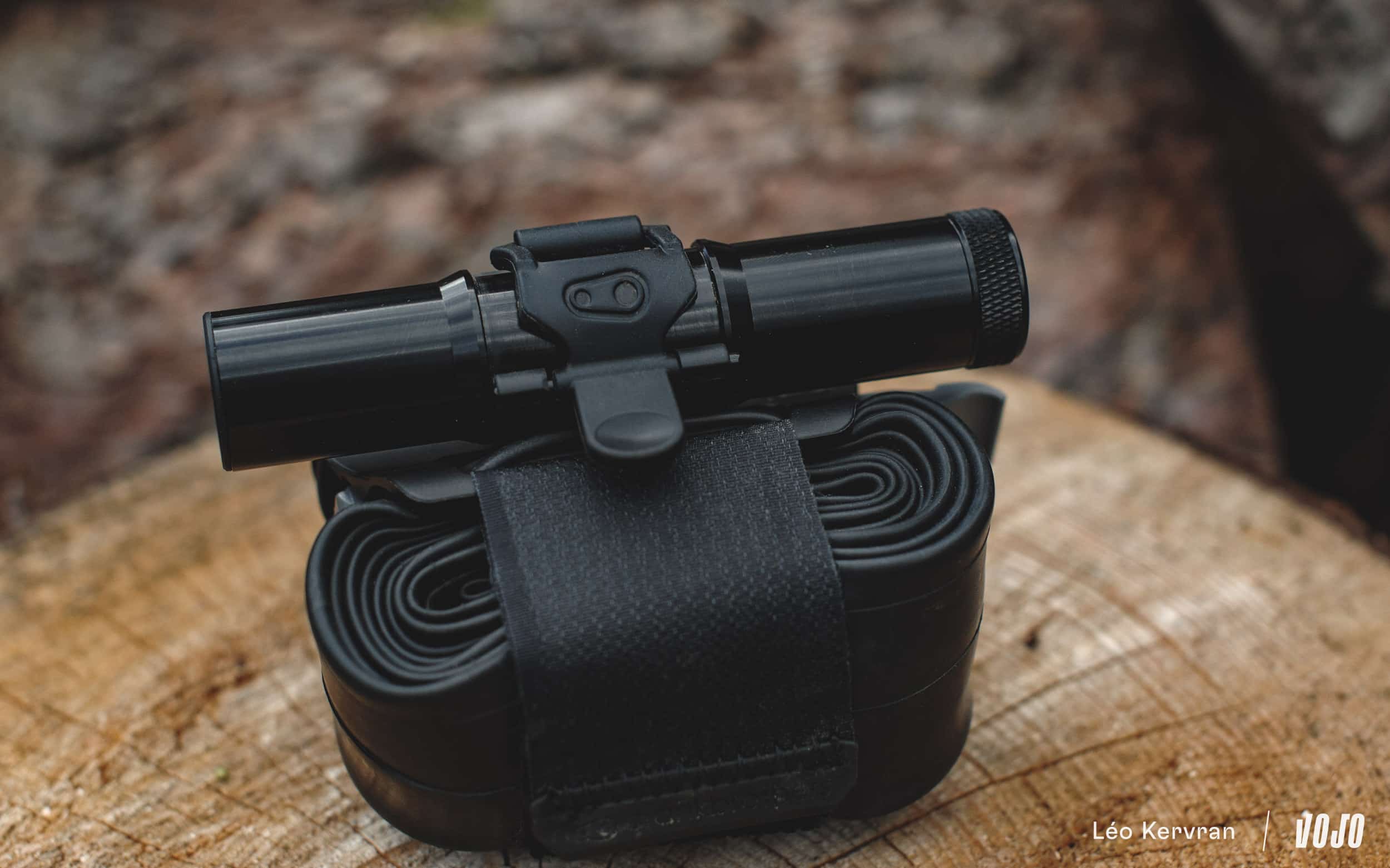 Tube et cartouche ou pompe sont clipsés dans leur logement et sécurisés en plus chacun par un élastique en caoutchouc doté d’une petite bride en aluminium. La bande scratch est également de belle facture, avec un velcro « double face » pour le refermer n’importe où sans problème et de petites pastilles en silicone pour maintenir fermement ce qu’on a rangé à cet endroit. Le TS18 n’est pas l’ensemble le plus léger mais sur la finition, il n’y a vraiment pas grand-chose à redire ! Seule la base en plastique apparaît un peu simple, ou pas aussi belle que le reste, mais une fois le tout installé sur le vélo on ne la voit plus.